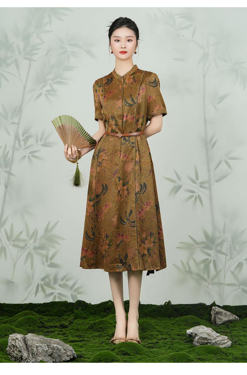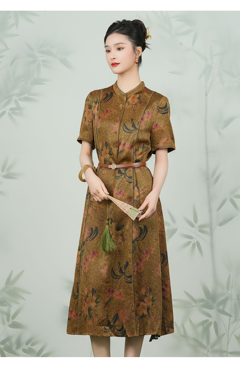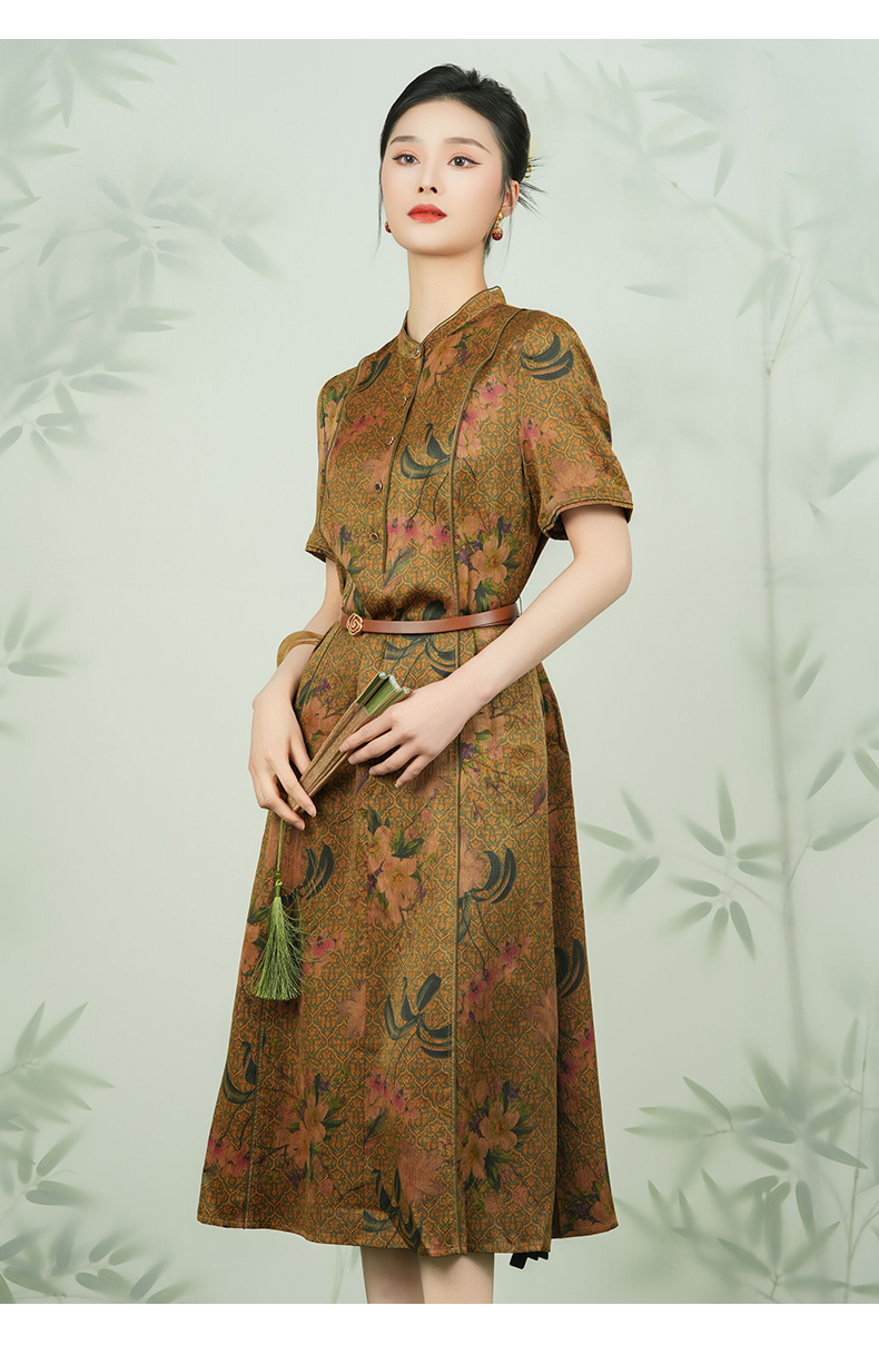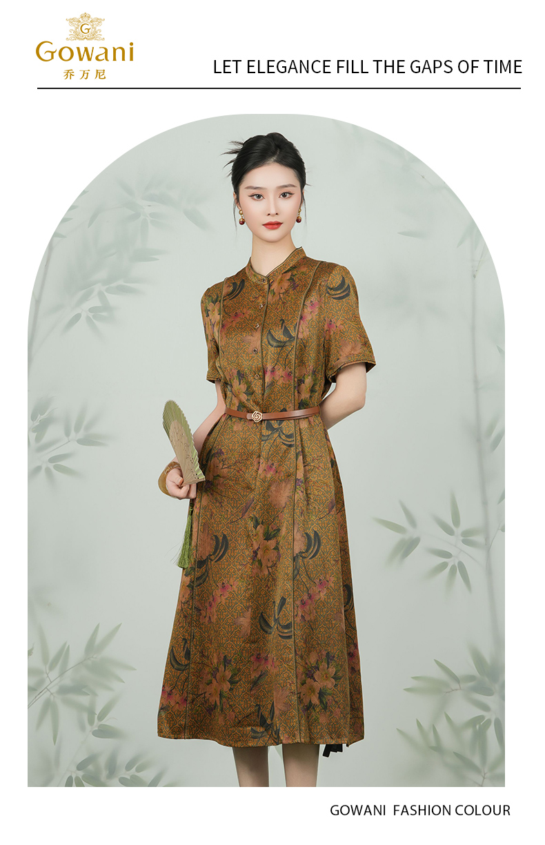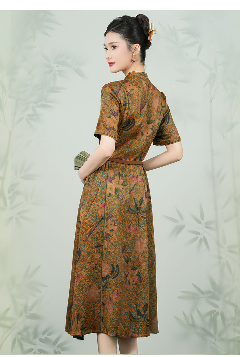【东兰梨花图】【香云纱】乔万尼19mm珍珠缎100%桑蚕丝旗袍连衣裙EM2E722
