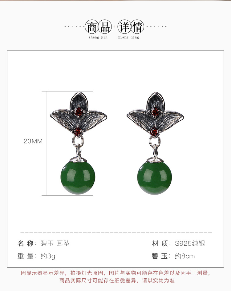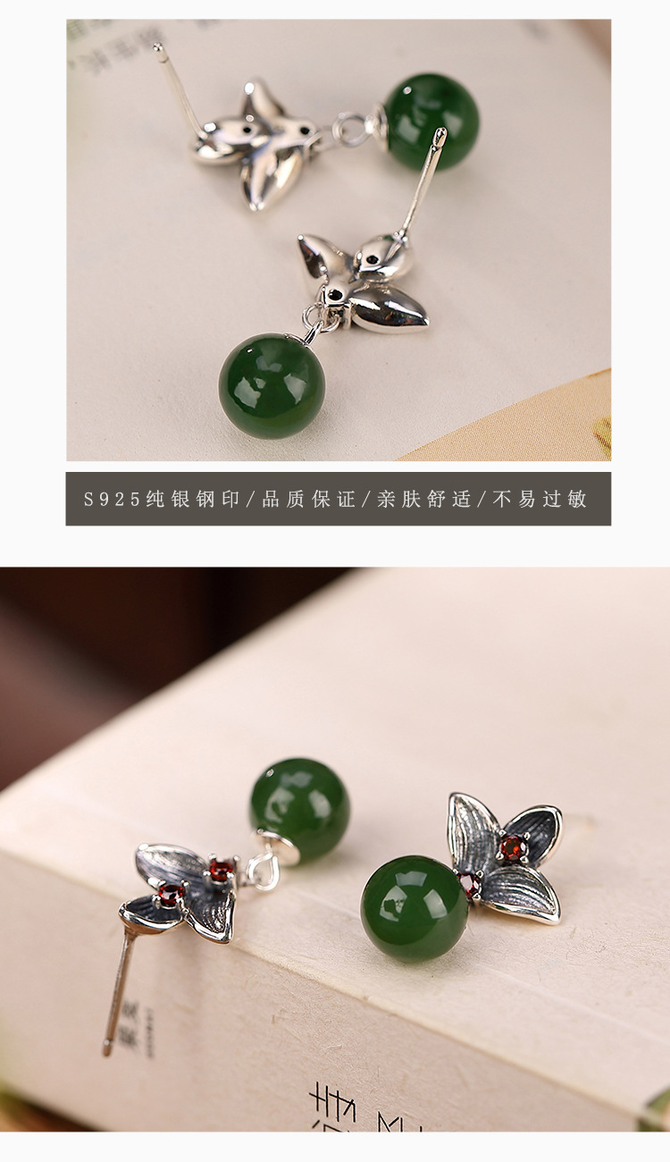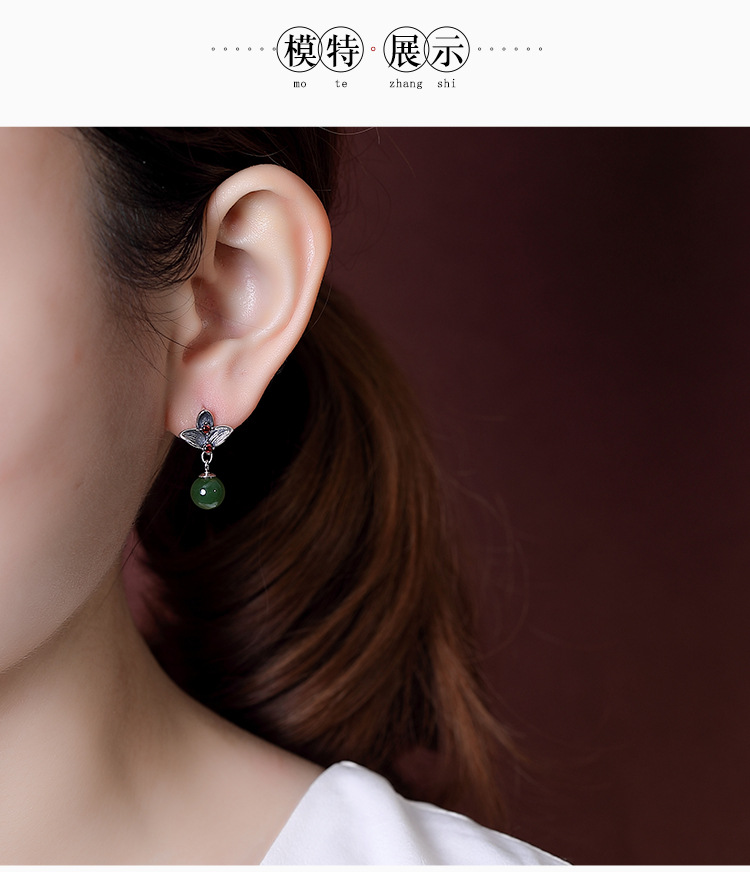S925纯银,和田碧玉圆珠莲花气质古典风百搭耳饰CW-184