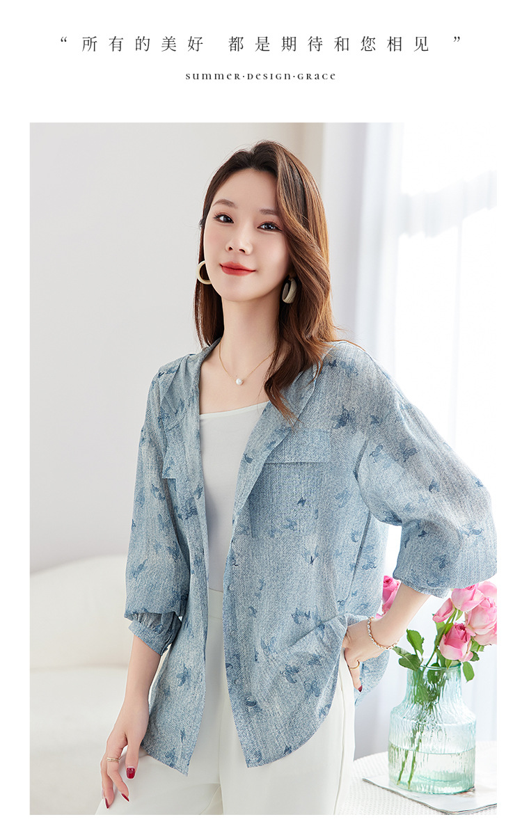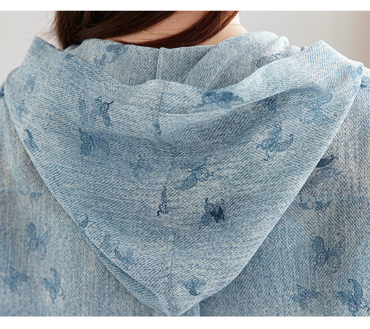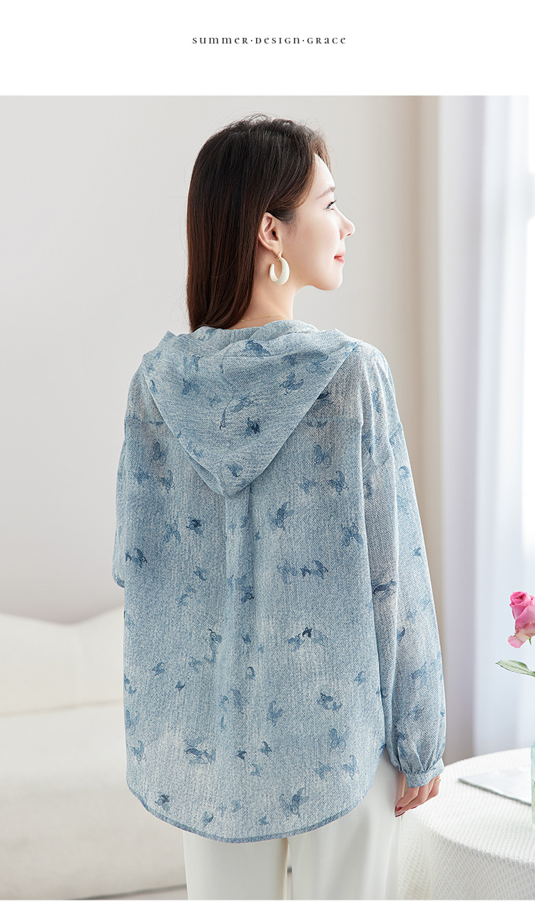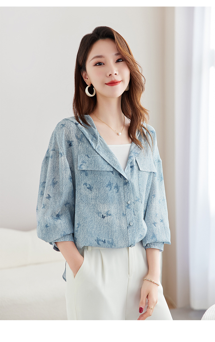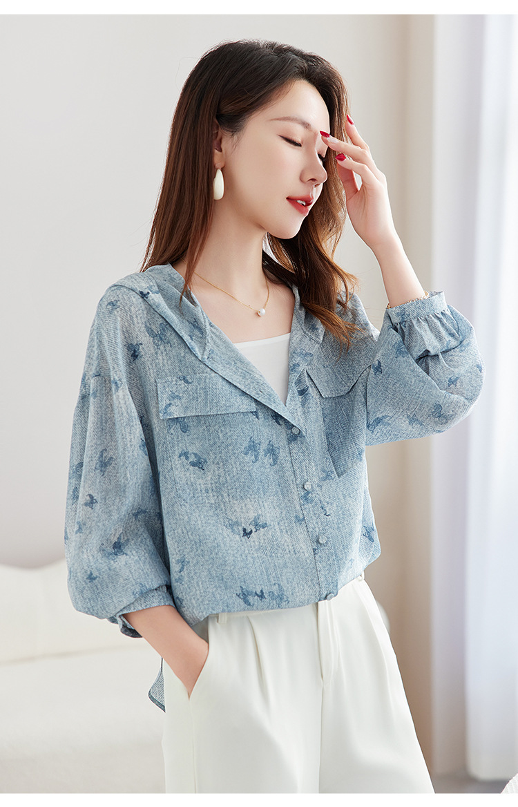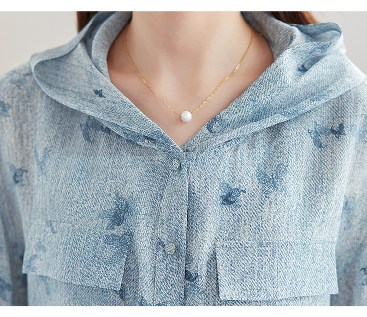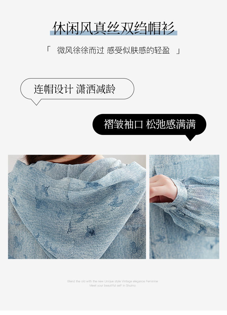 丁摩时尚连帽双绉真丝衬衫女长袖新款桑蚕丝印花大码宽松上衣AL9360