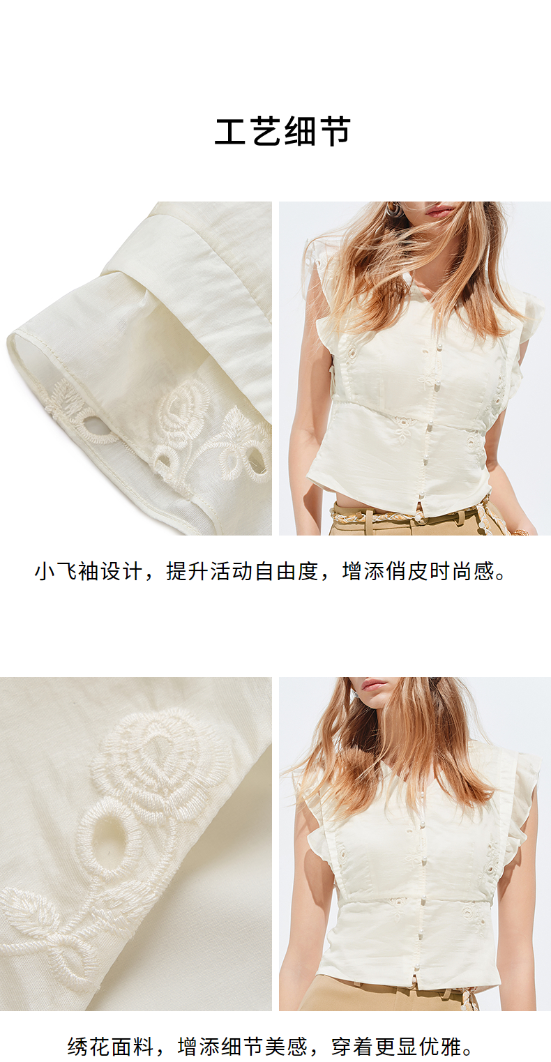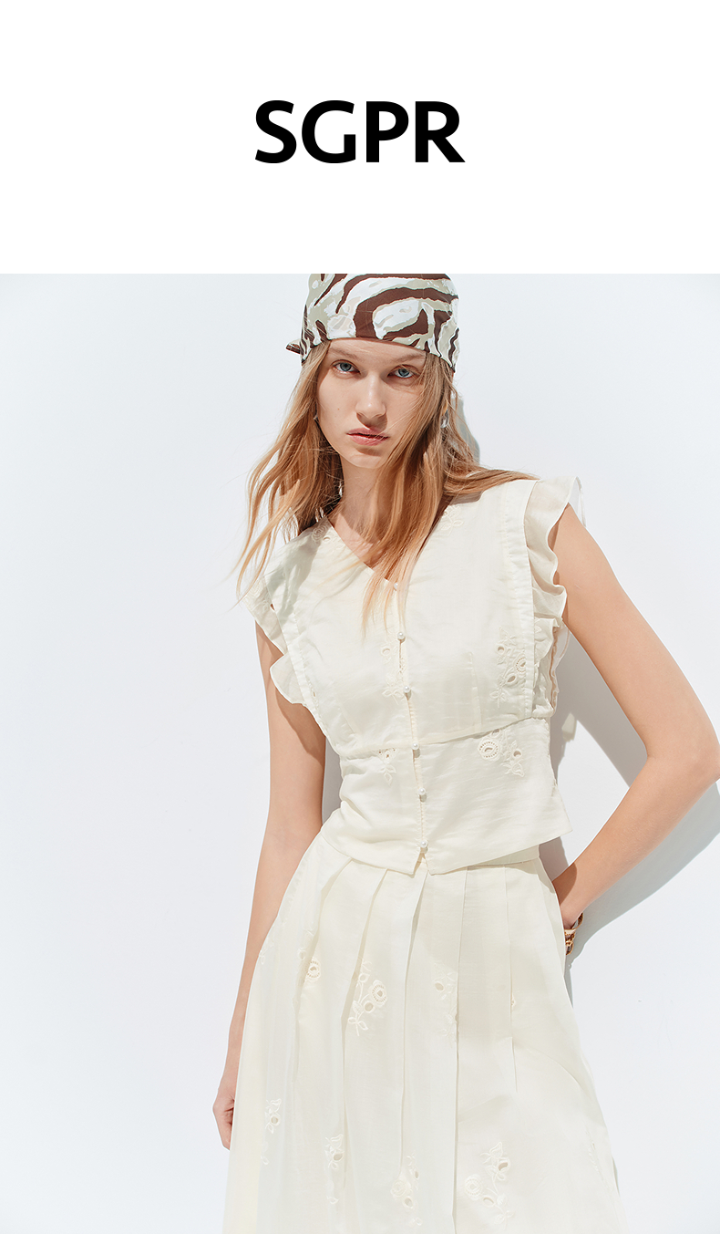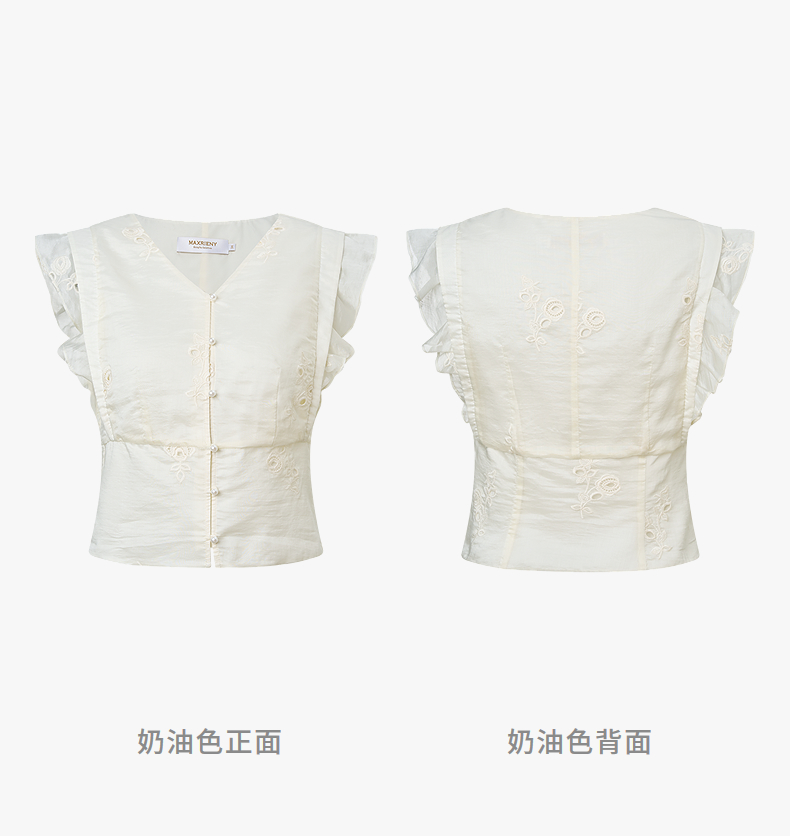 【SGPR】奶油白色V领衬衫2026年夏季飞飞袖收腰上衣镂空绣花衬衣(货号:MU80TP010)