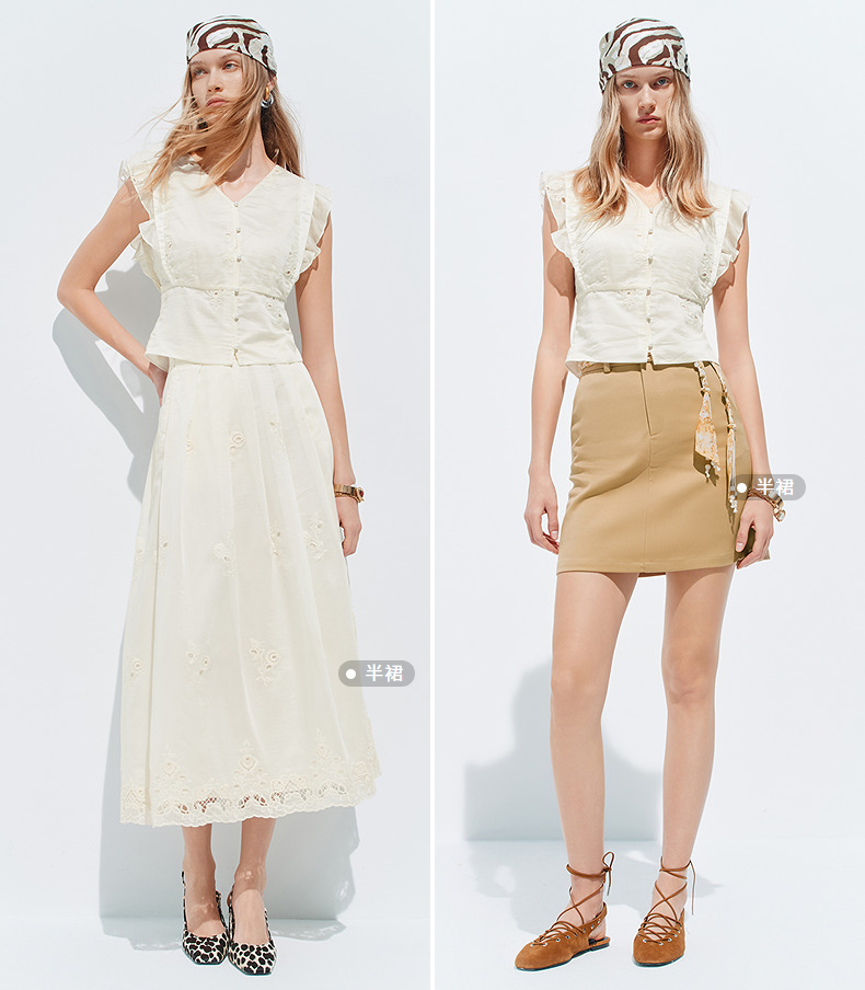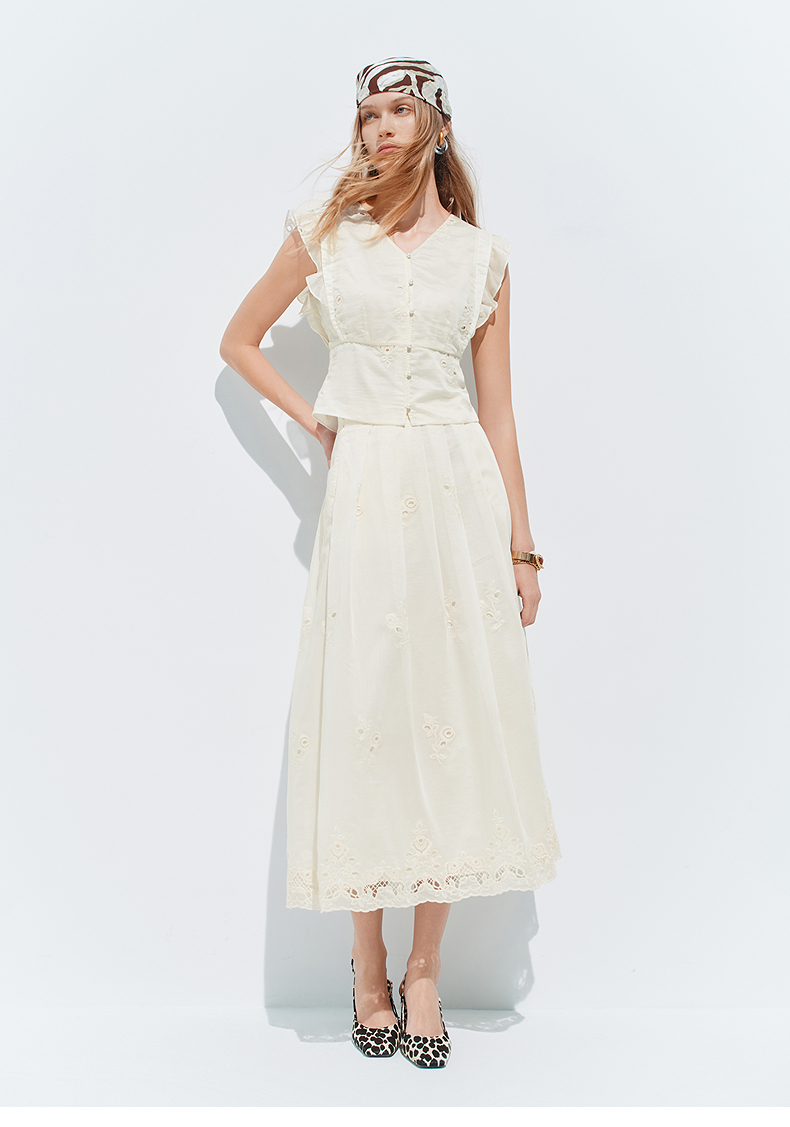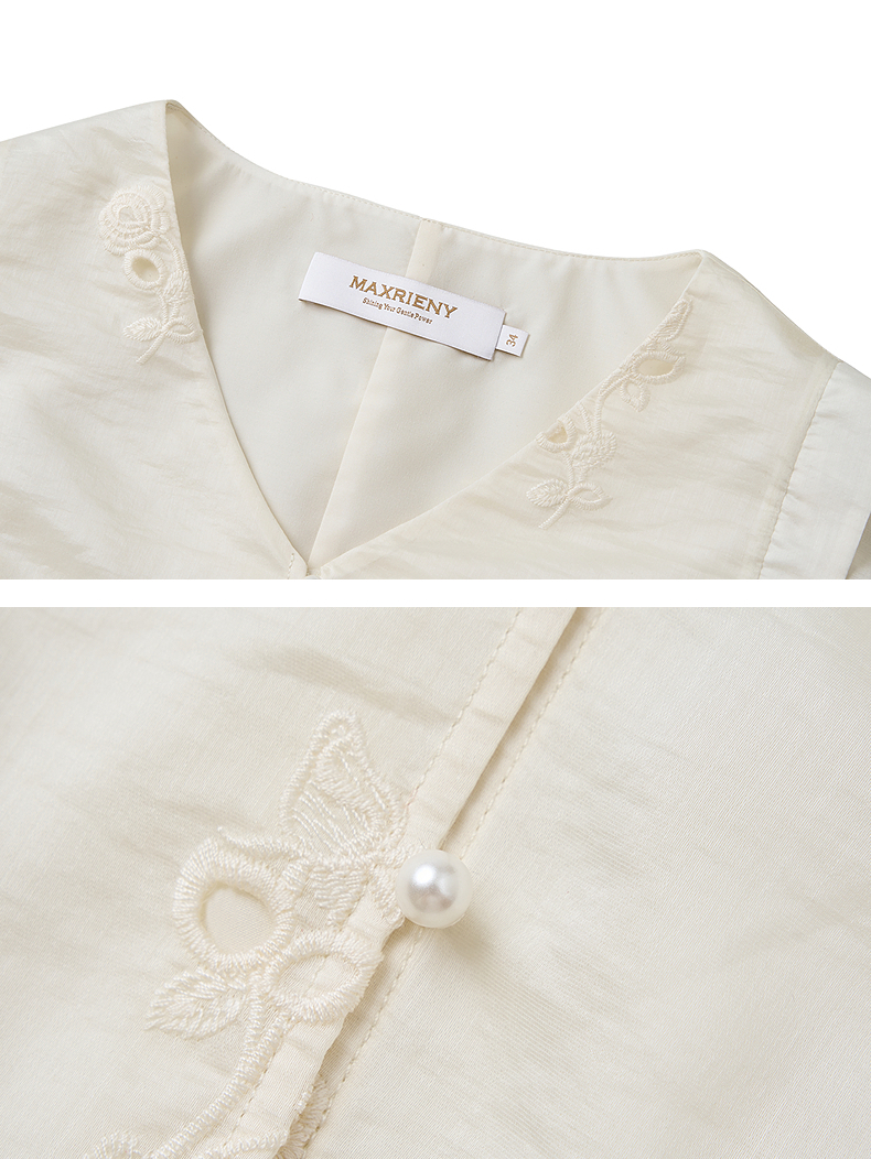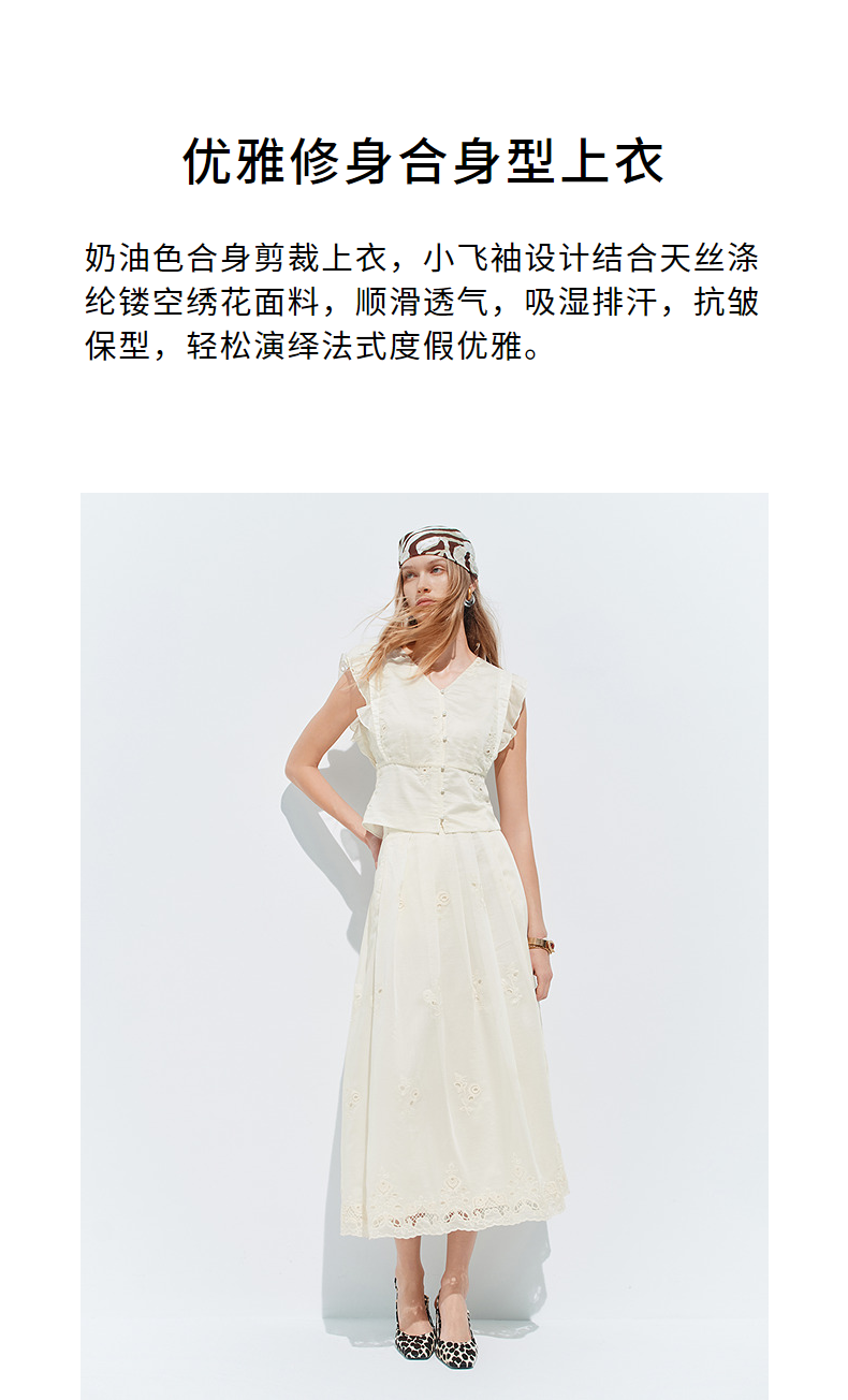 【SGPR】奶油白色V领衬衫2026年夏季飞飞袖收腰上衣镂空绣花衬衣(货号:MU80TP010)
