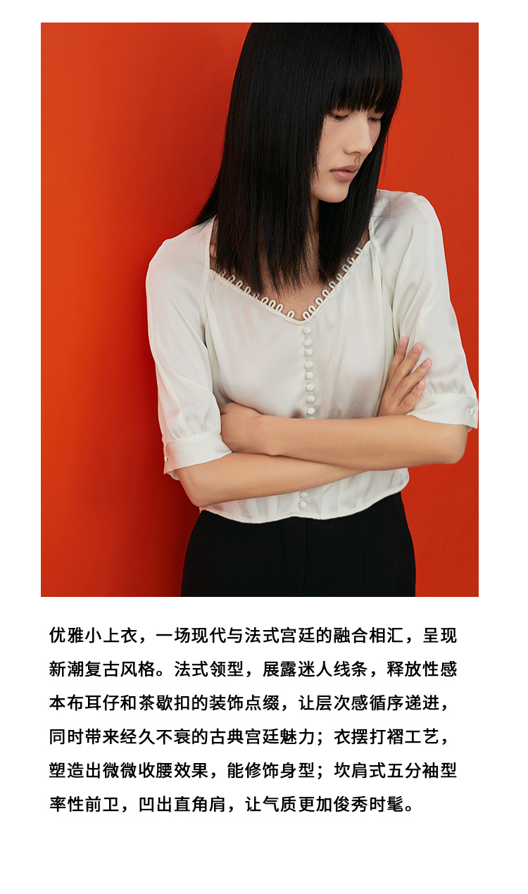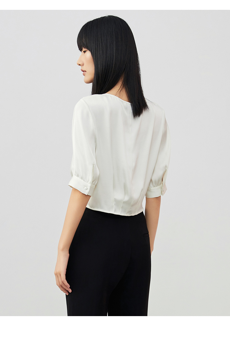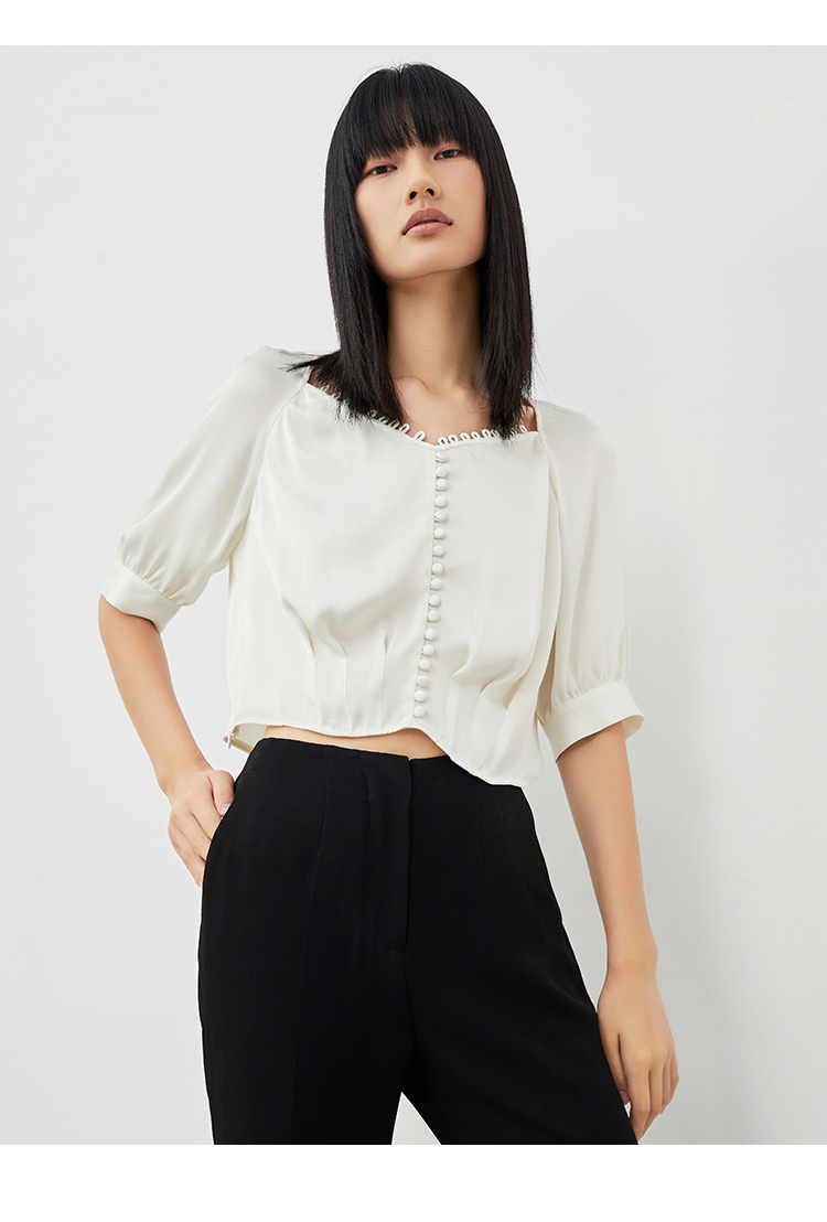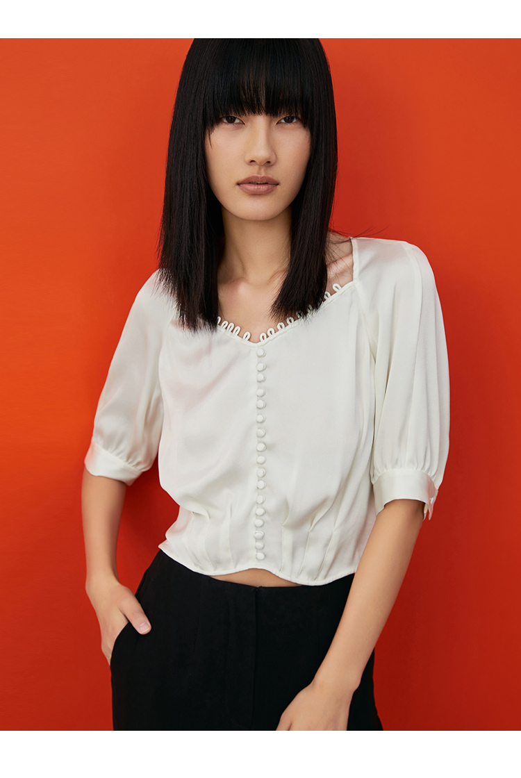 VIMAGE/纬漫纪夏季新品V领宫廷袖简约大方短款小上衣V1709330