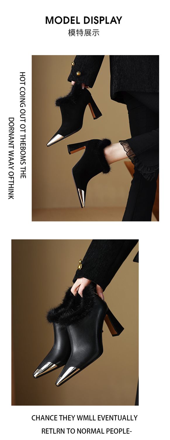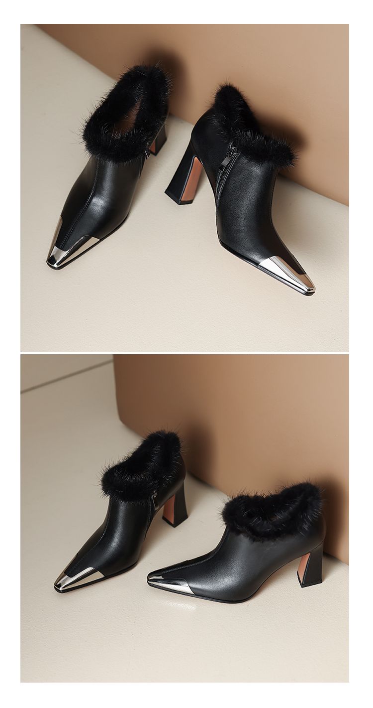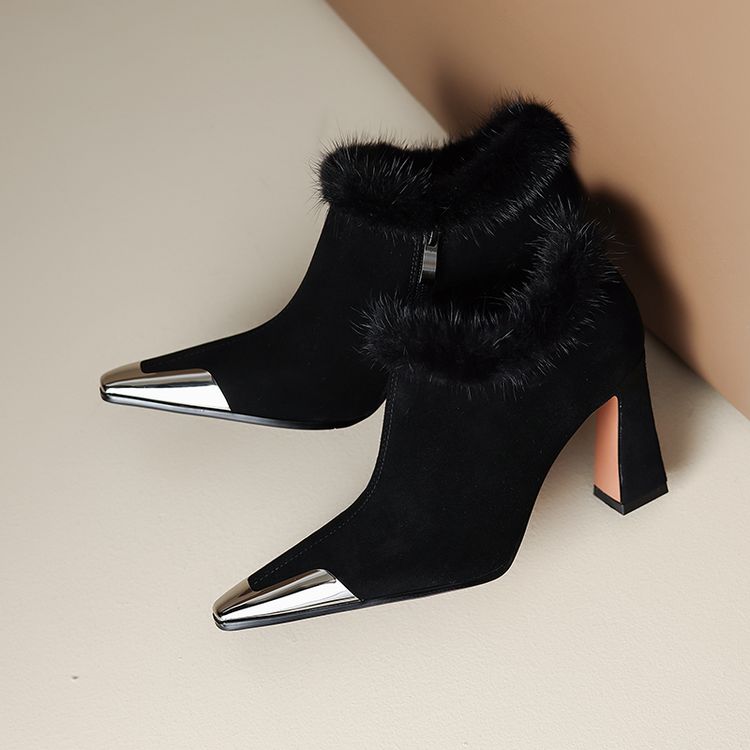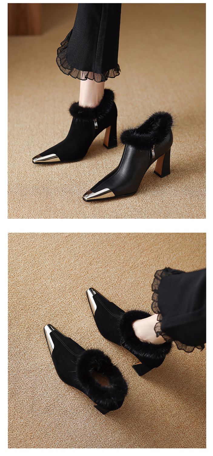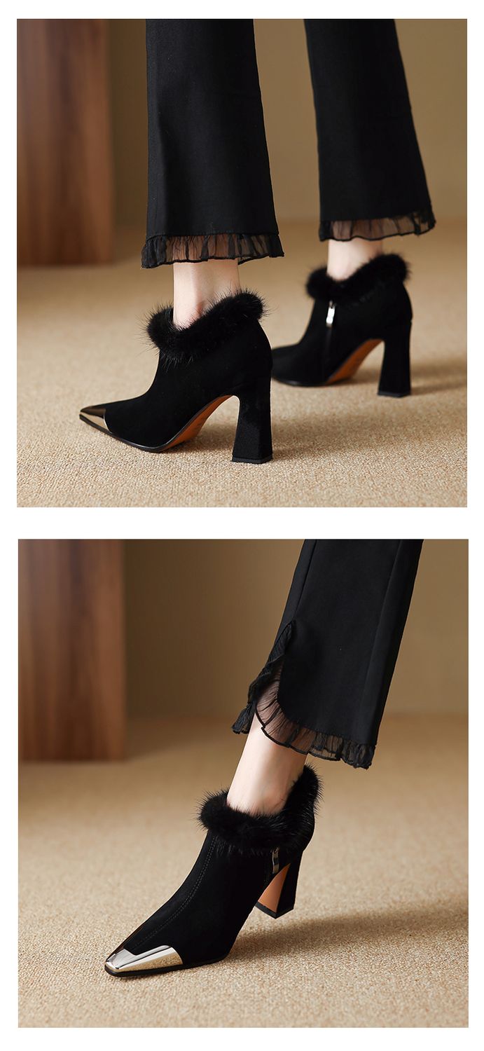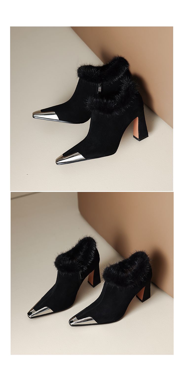 【预售5天】羊翻皮金属尖头高跟鞋,加绒貂毛时尚粗跟裸靴XH&M933