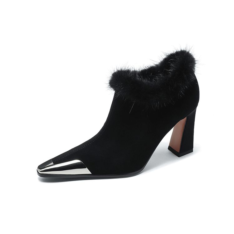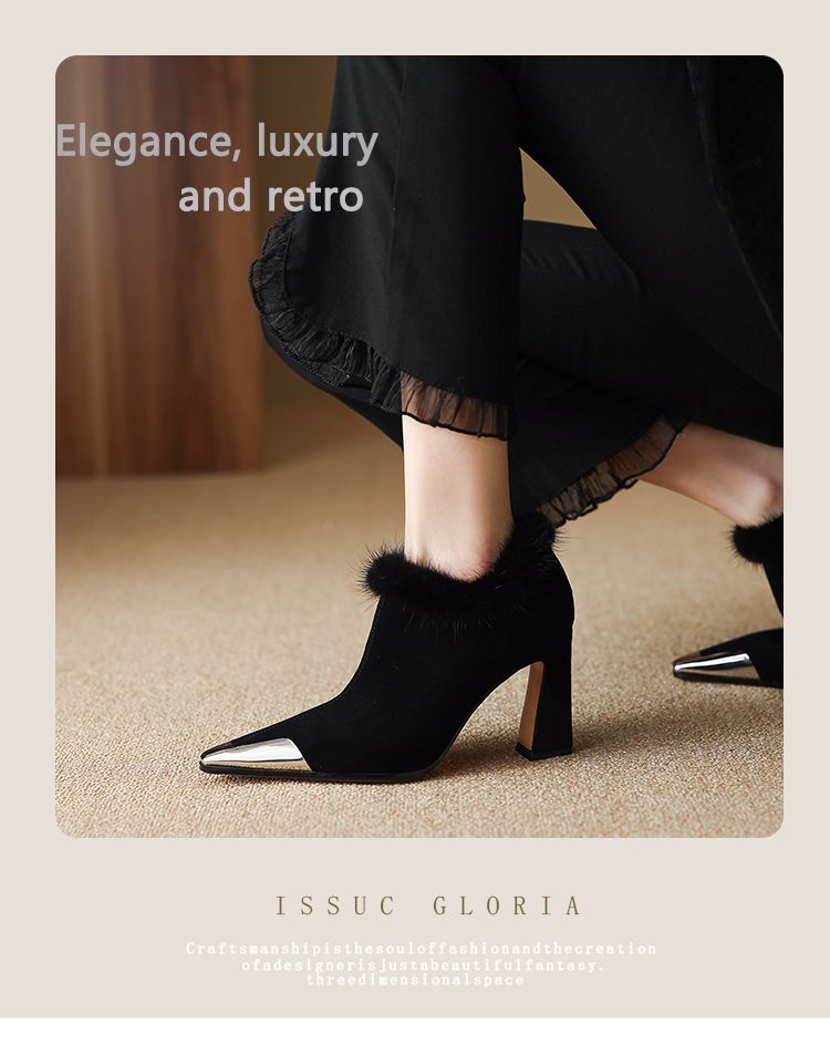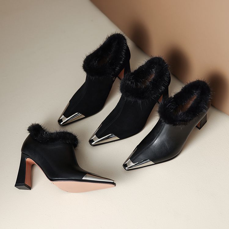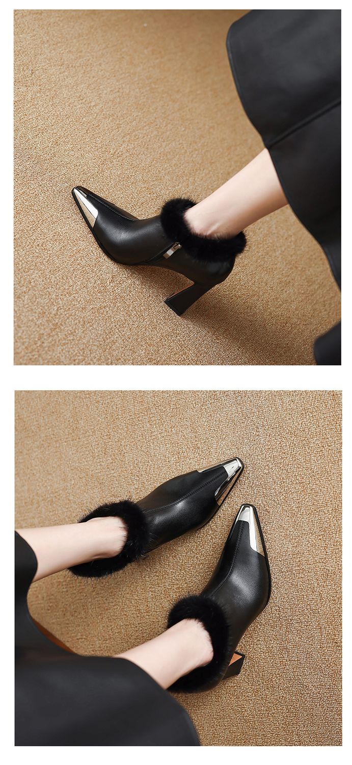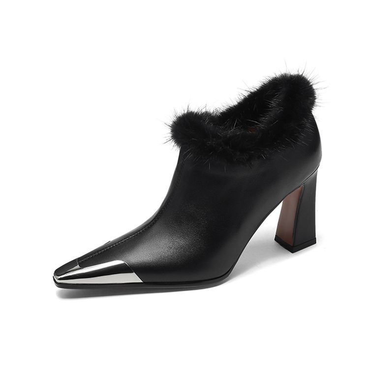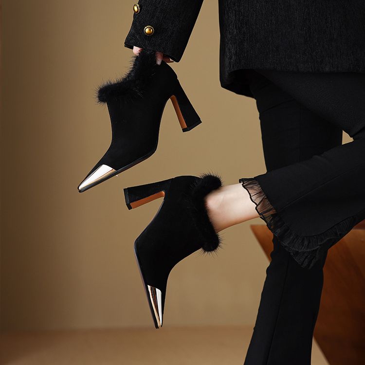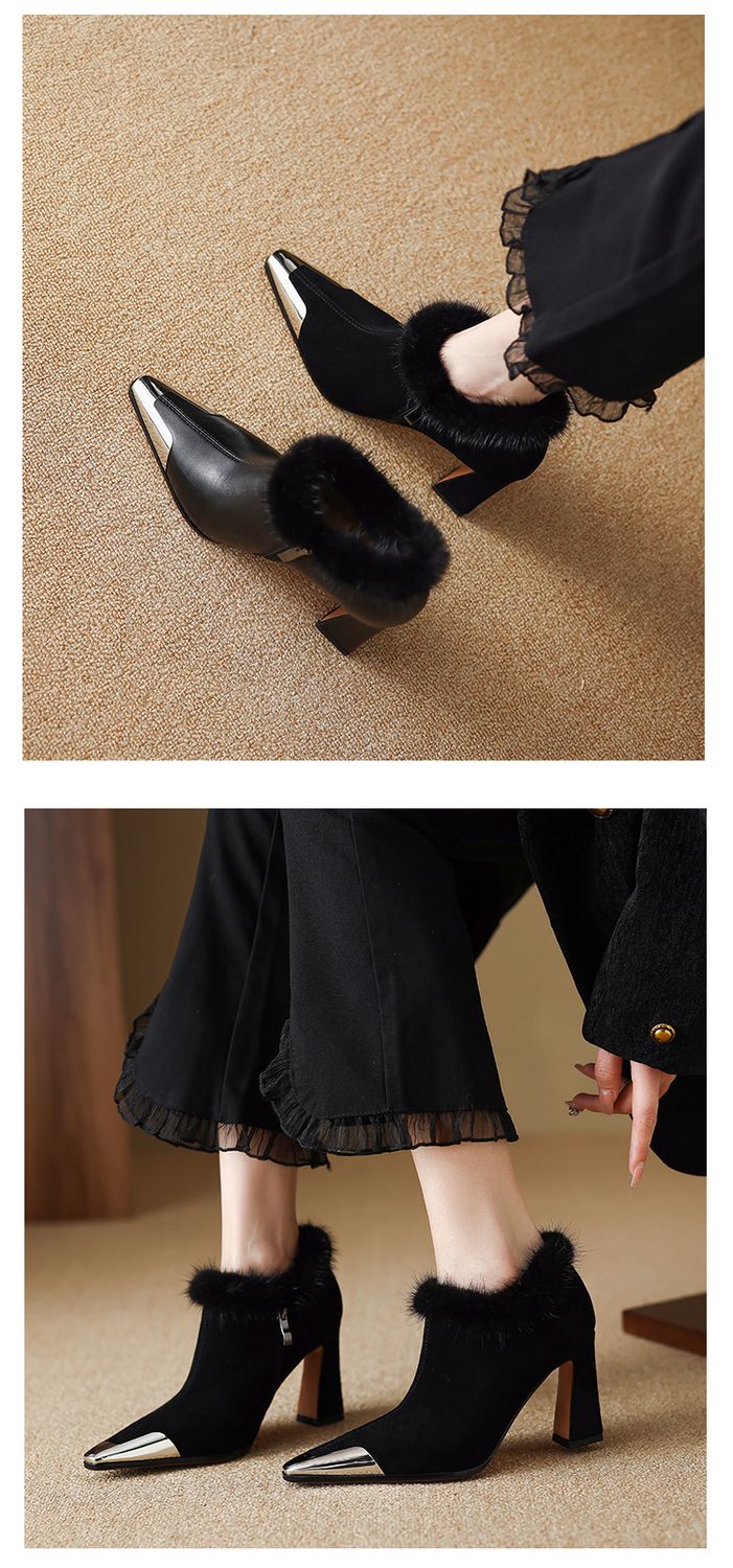 【预售5天】羊翻皮金属尖头高跟鞋,加绒貂毛时尚粗跟裸靴XH&M933