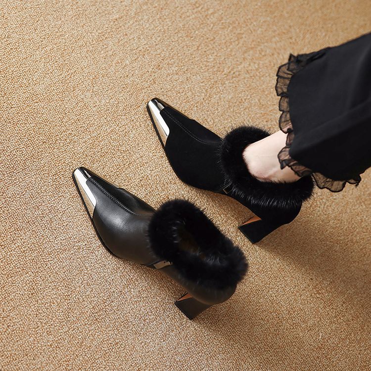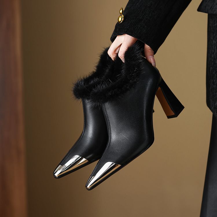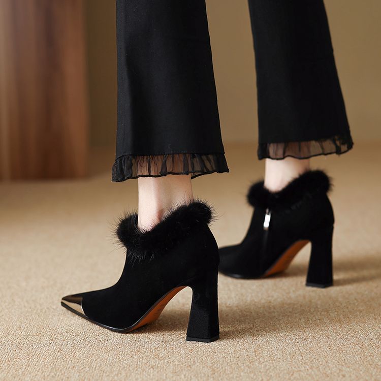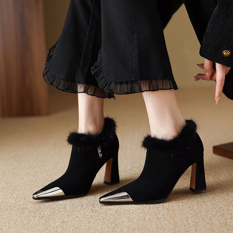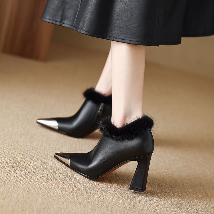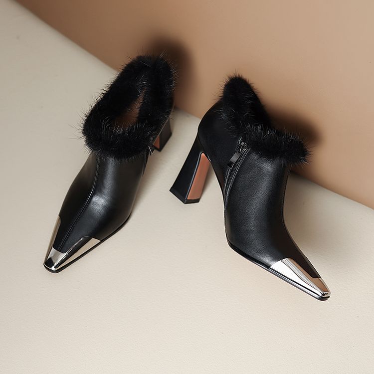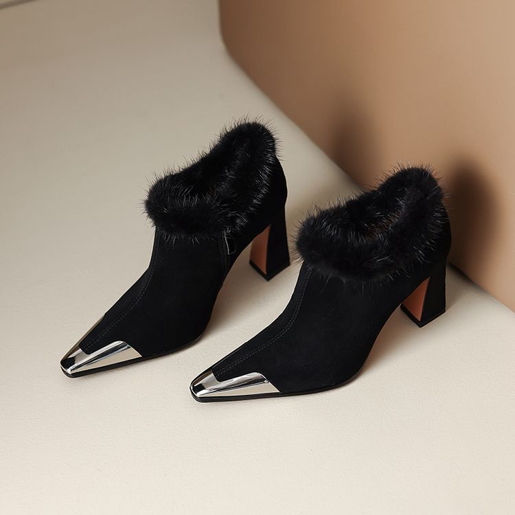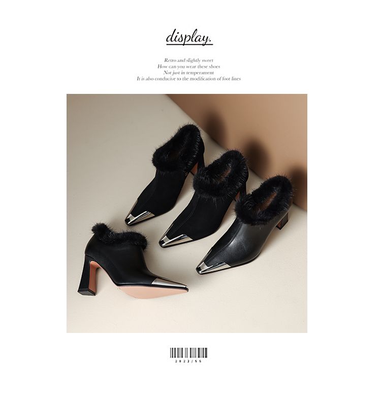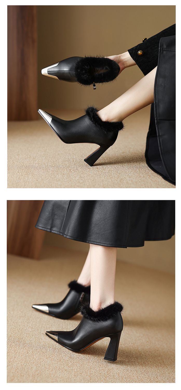 【预售5天】羊翻皮金属尖头高跟鞋,加绒貂毛时尚粗跟裸靴XH&M933