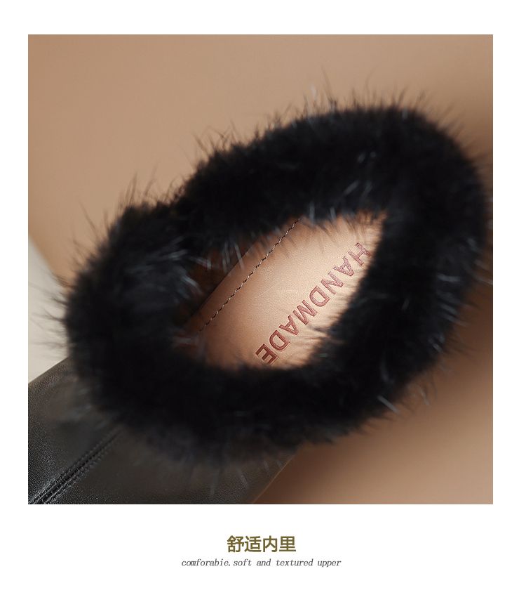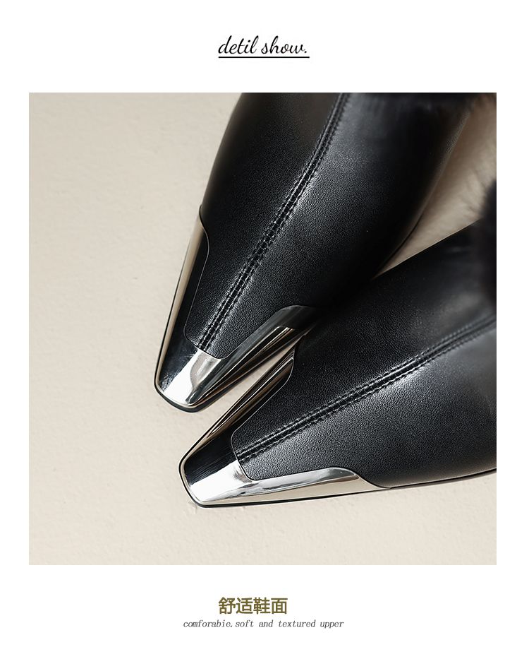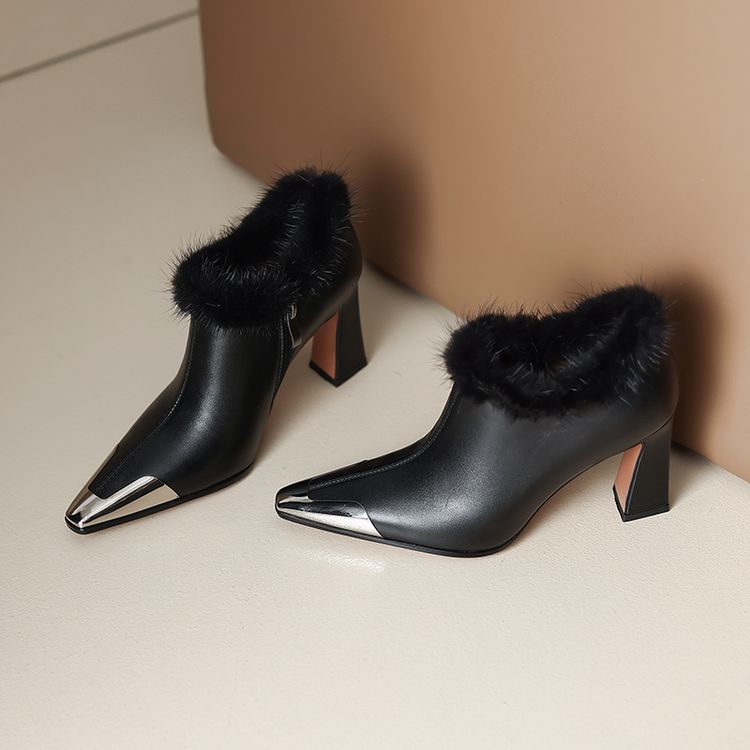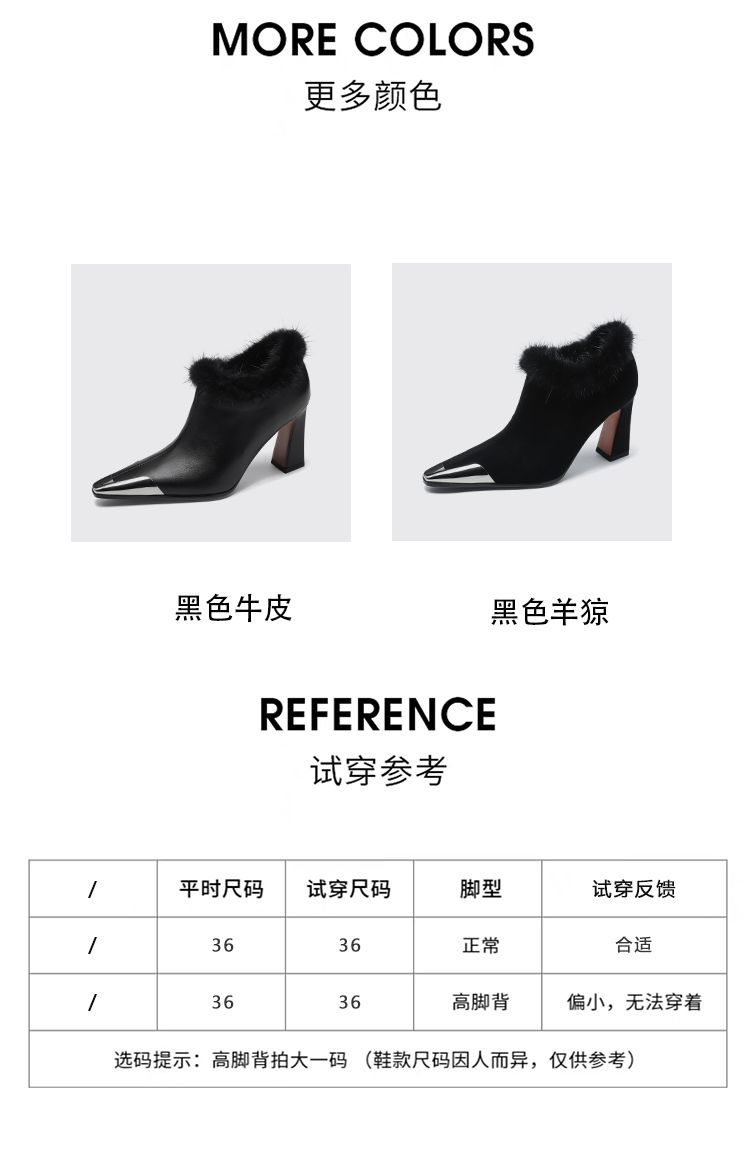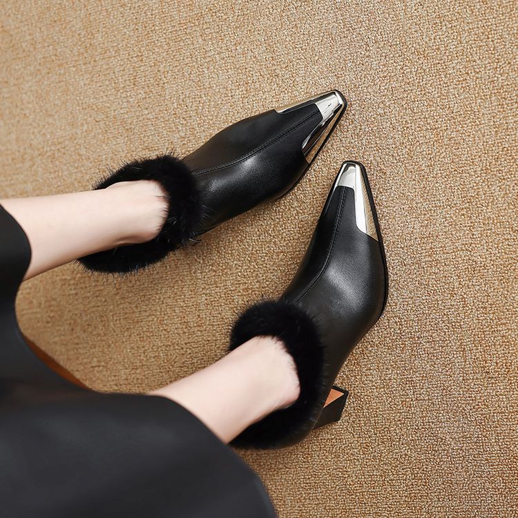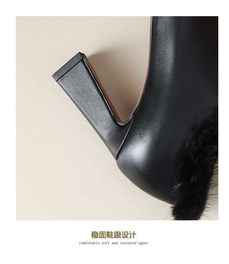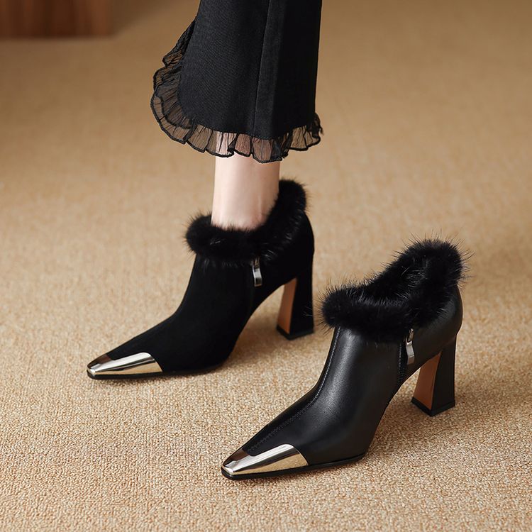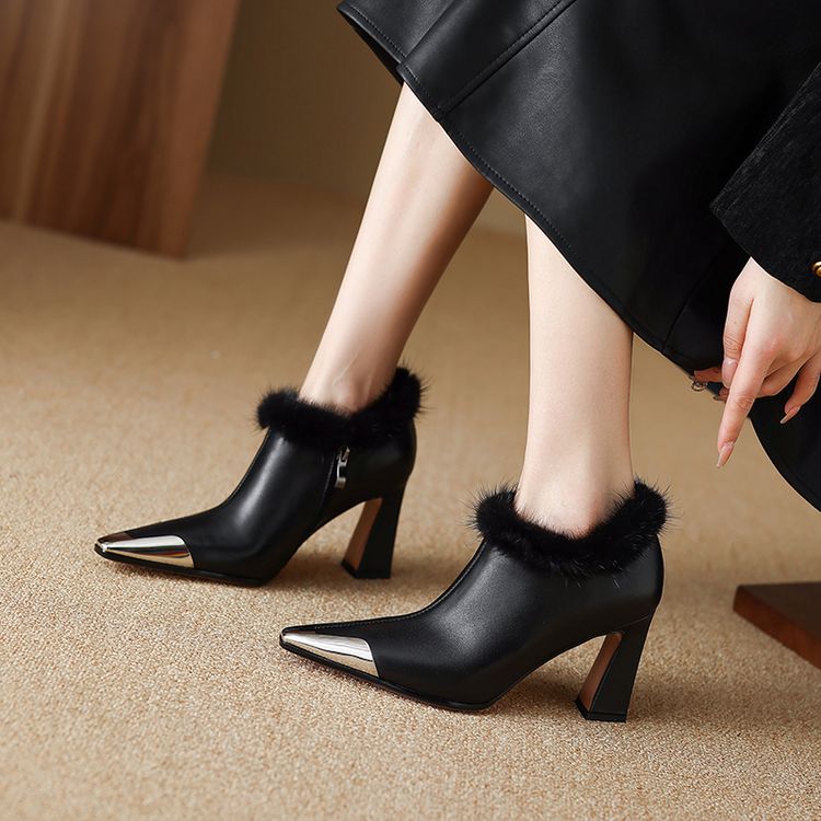 【预售5天】羊翻皮金属尖头高跟鞋,加绒貂毛时尚粗跟裸靴XH&M933