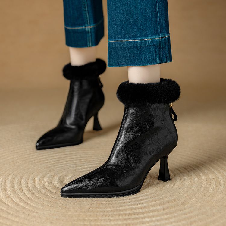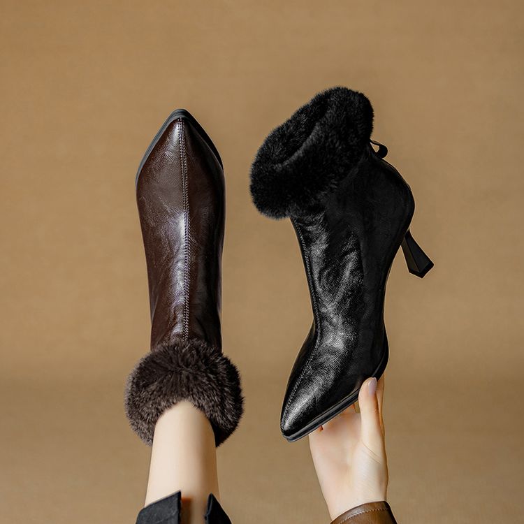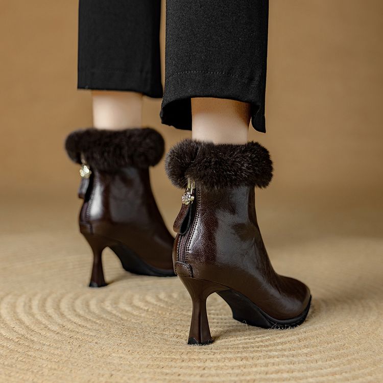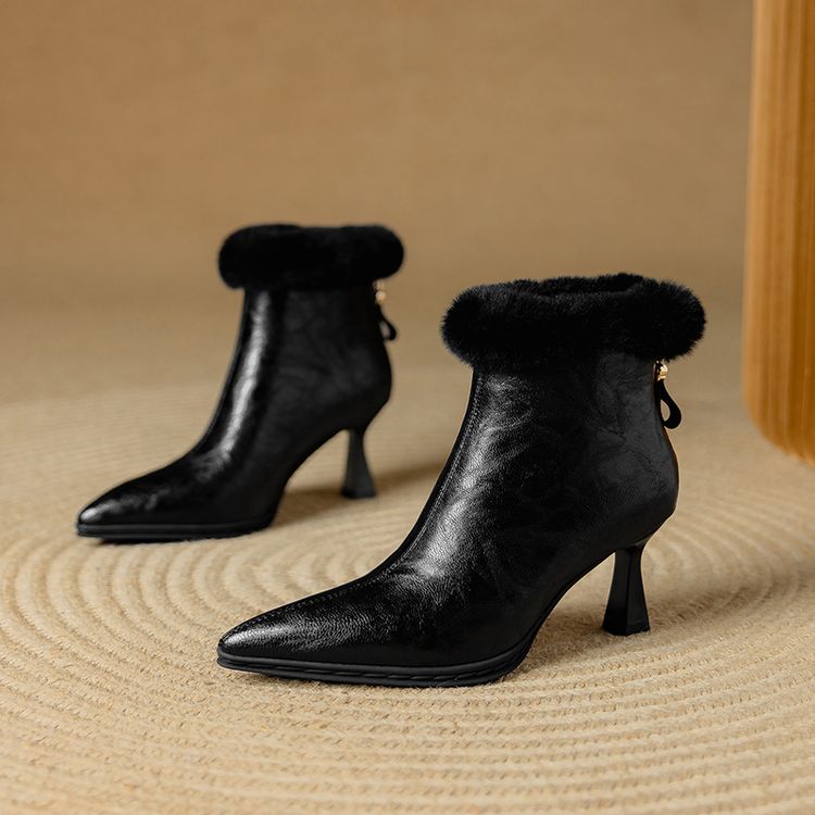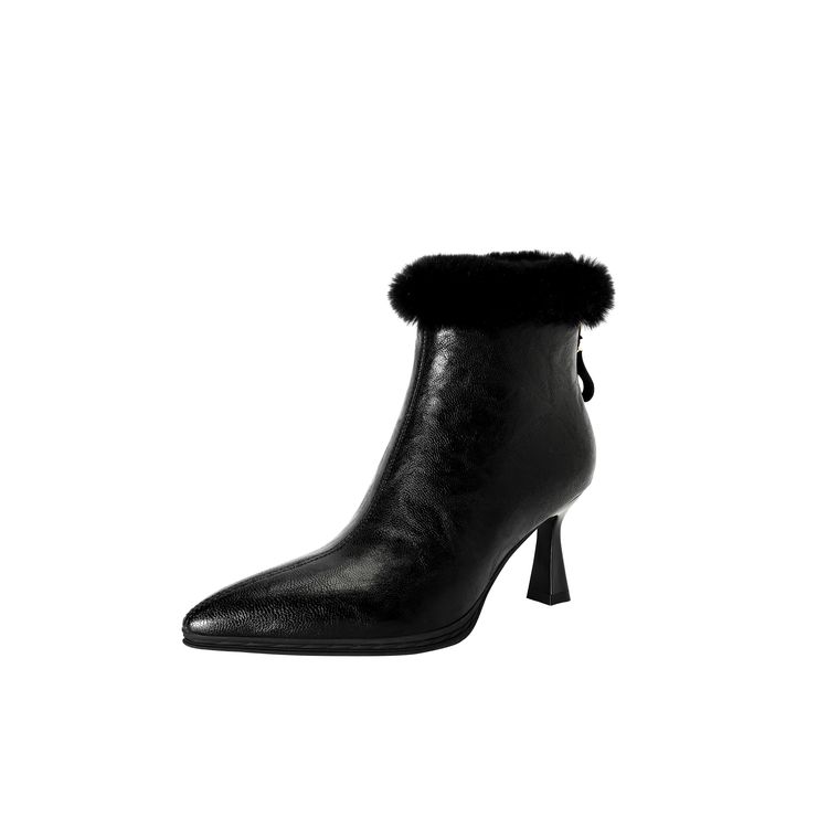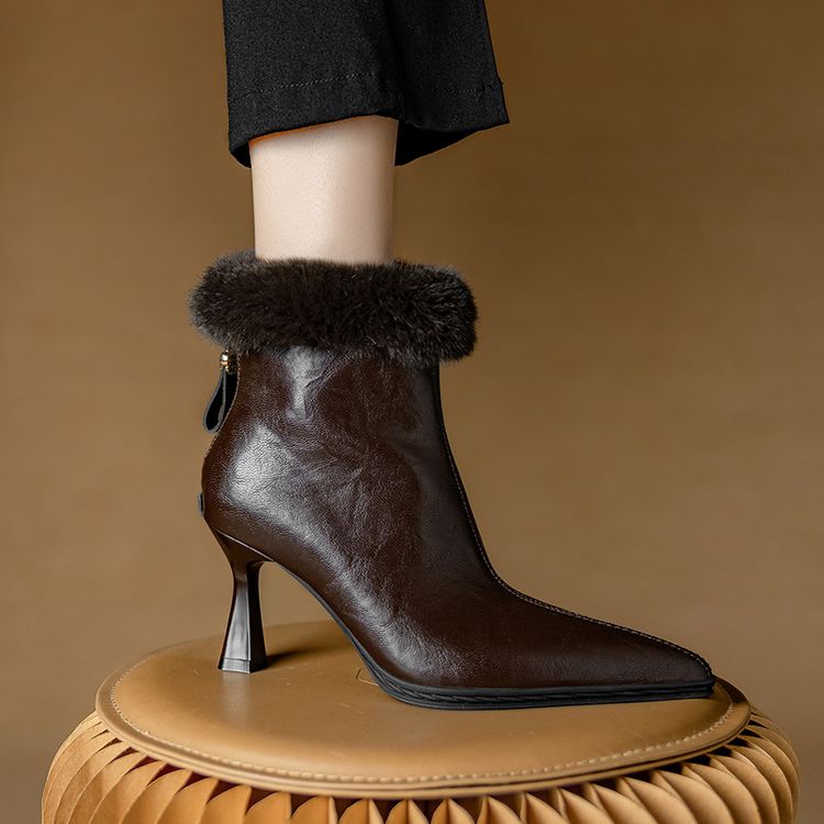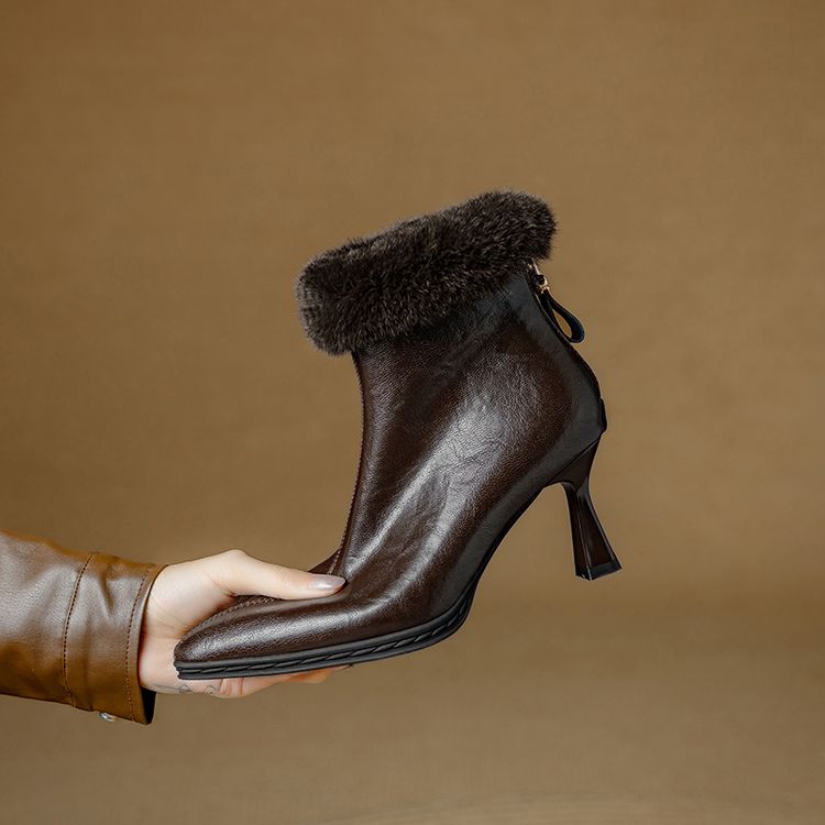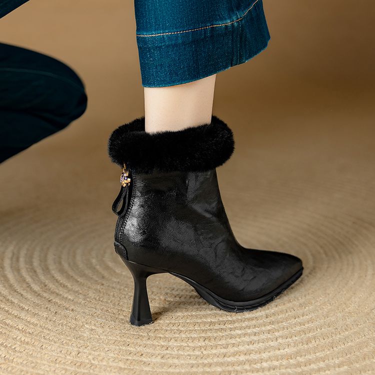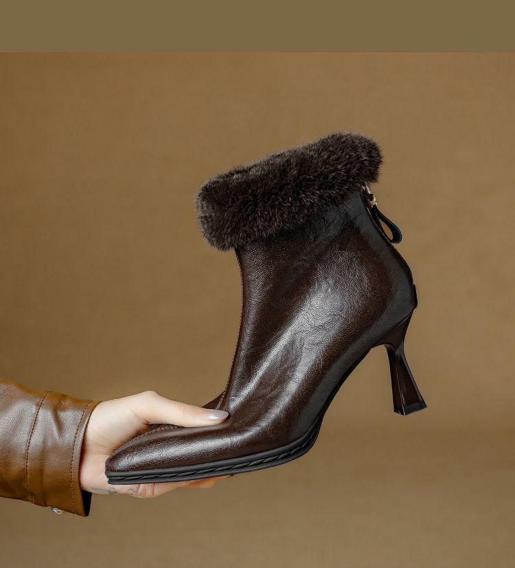 【预售5天】真皮尖头细跟小短靴女秋冬新款高跟软底毛毛牛皮加绒马丁靴DB&M6118