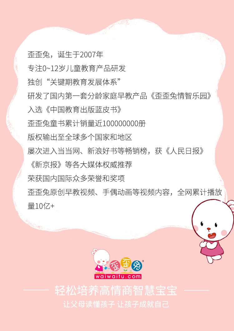 - 歪歪兔,诞生于2007年,专注0-12岁儿童教育产品研发。原创童书销量逾1亿册,音视频播放总量10亿+。