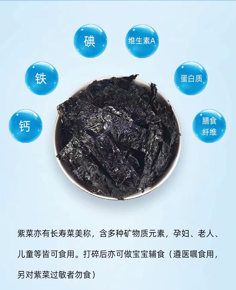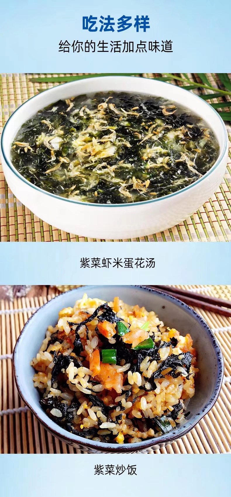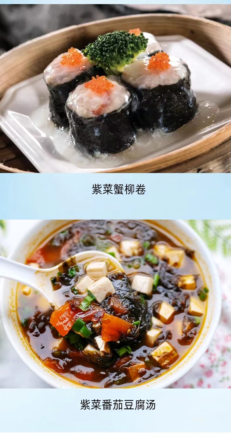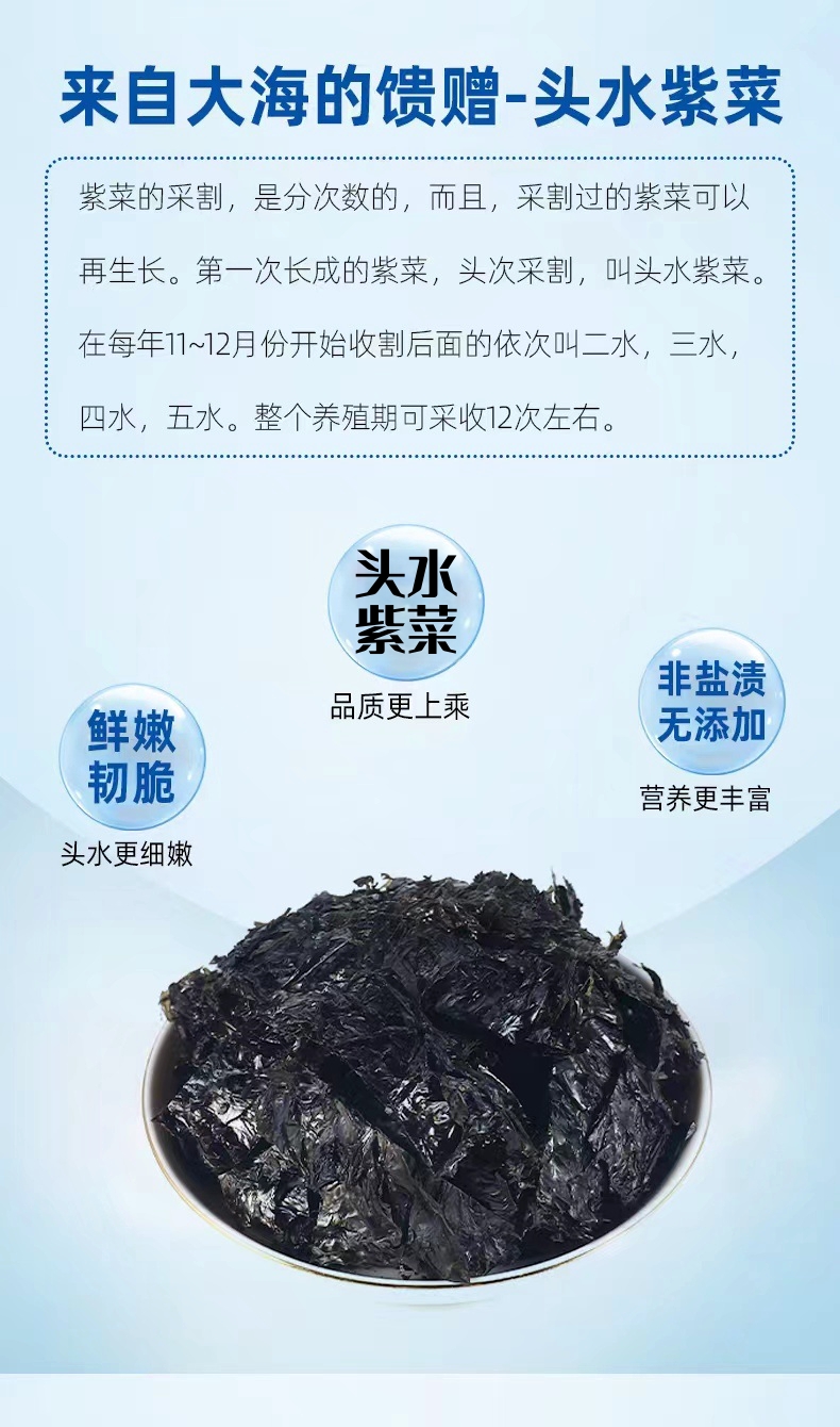 采割后,8小时内完成所有清洗加工!就是要“鲜”! 头茬紫菜干净无沙,可以免洗直接下锅,无需泡发。