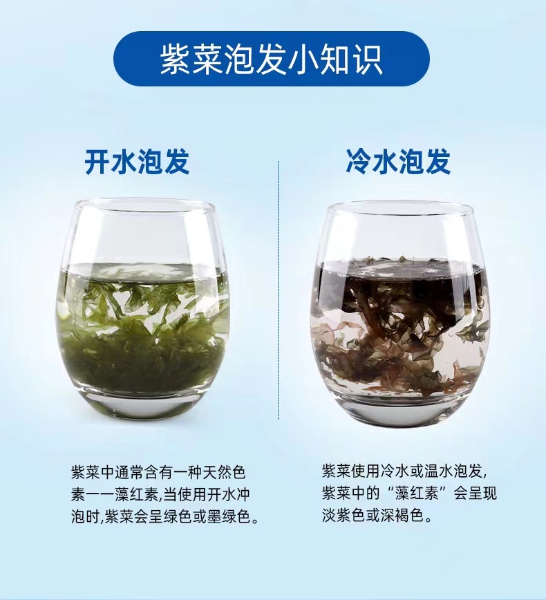冷水泡发后,紫菜里的藻红素蛋白会溶解在水中,因此会呈现紫色。而用开水煮,都市购实惠的头茬紫菜是绿色的。这也是优质紫菜区别市面紫菜的特征!