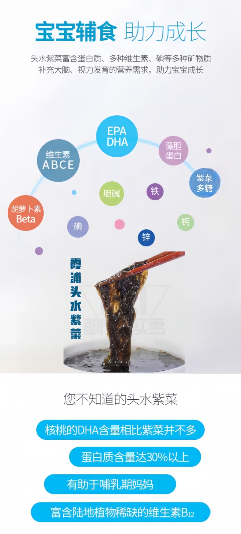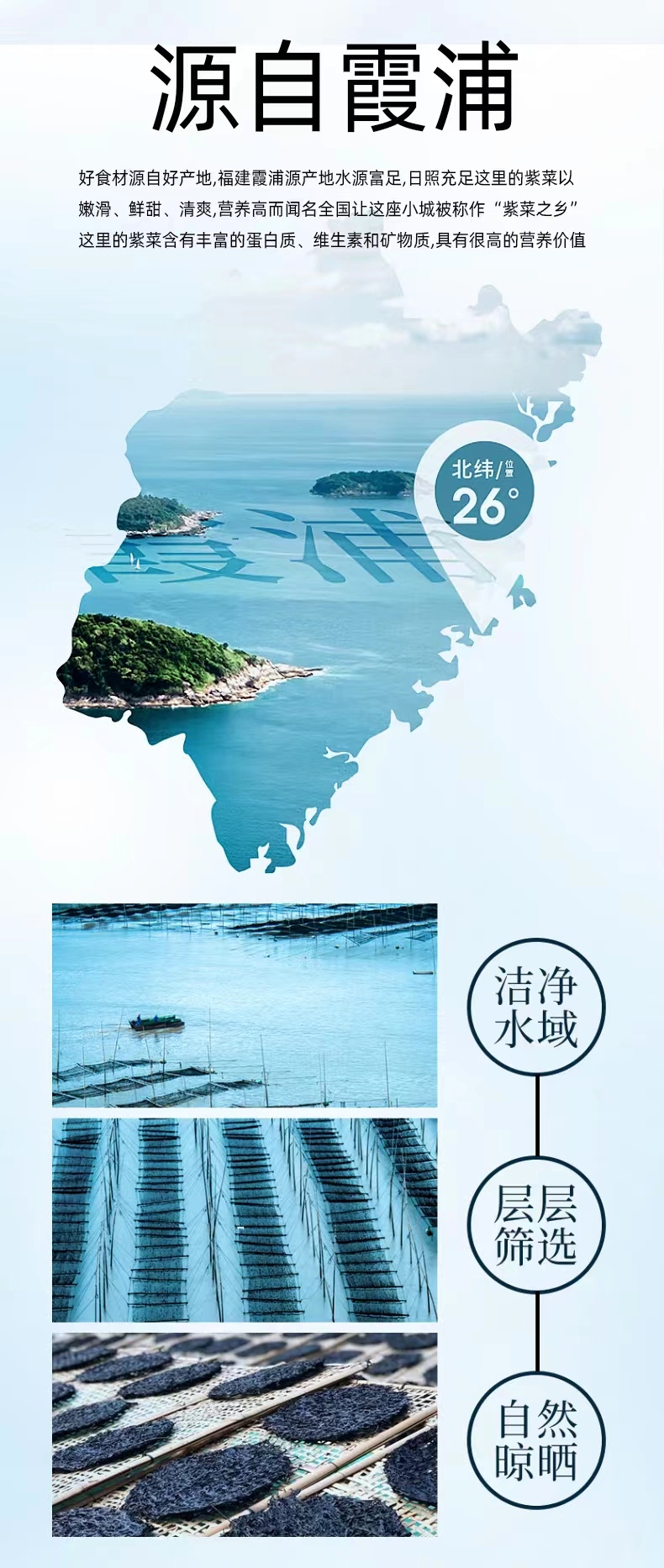 众多天然独立港湾,亚热带季风湿润气候及独有的水温、水质条件造就了霞浦紫菜爽口、滑嫩和高质。