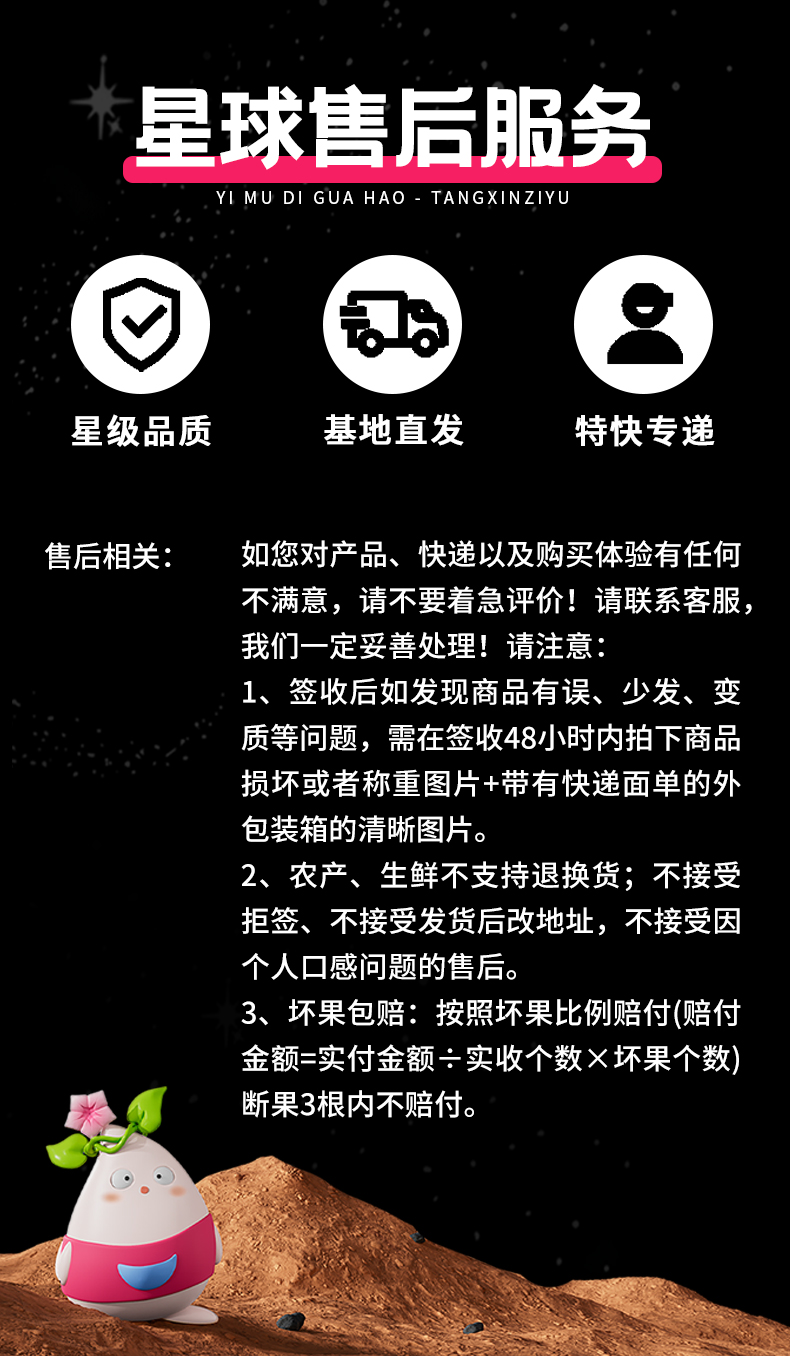 【售后说明】收到货24小时内有任何质量问题,都可以拍照联系客服进行售后理赔,因客户原因导致转寄、延派、误派、擅自拒收、退货,口感问题等不在理赔范围。