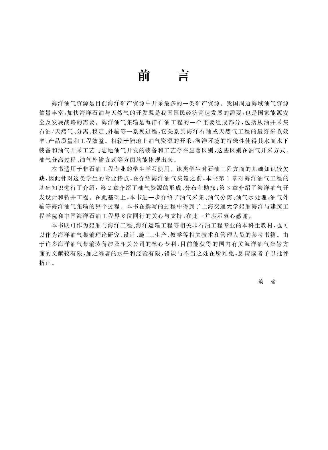 本书在介绍海洋石油工程重要知识的基础上,详细阐述了油气采集、油气分离、油气水处理、油气外输、海洋环境保护等海洋油气集输中的一系列工艺过程以及相关的技术方法。 本书可作为船舶海洋工程、海洋运输工程等相关专业学生学习海洋石油工程知识的主要教材,也可以作为从事海洋油气集输研究、设计、施工和生产等方面的技术和管理人员的参考书籍。