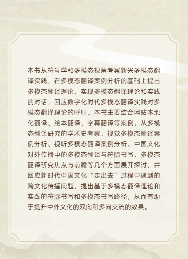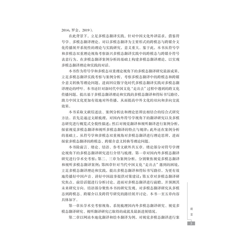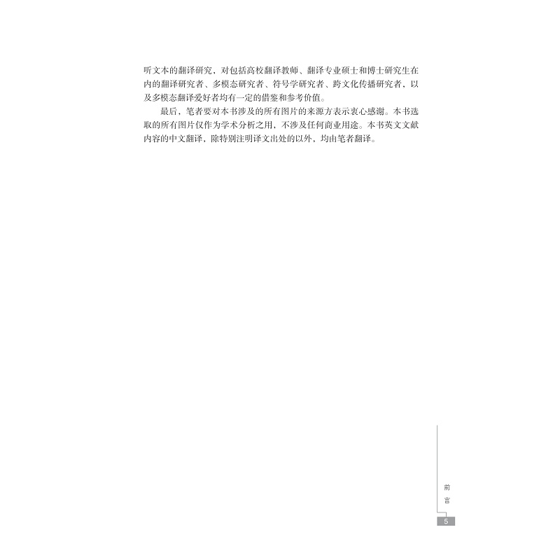本书从符号学和多模态视角考察新兴多模态翻译实践,在多模态翻译案例分析的基础上提出多模态翻译理论,实现多模态翻译理论和实践的对话,回应数字化时代多模态翻译实践对多模态翻译理论的呼吁。本书主要结合网站本地化翻译、绘本翻译、字幕翻译等案例,从多模态翻译研究的学术史考察、视觉多模态翻译案例分析、视听多模态翻译案例分析、中国文化对外传播中的多模态翻译与符际书写、多模态翻译研究焦点与前瞻等几个方面展开探讨,并回应新时代中国文化“走出去”过程中遇到的跨文化传播问题,提出基于多模态翻译理论和实践的符际书写和多模态书写路径,从而有助于提升中外文化的双向和多向交流的效果。