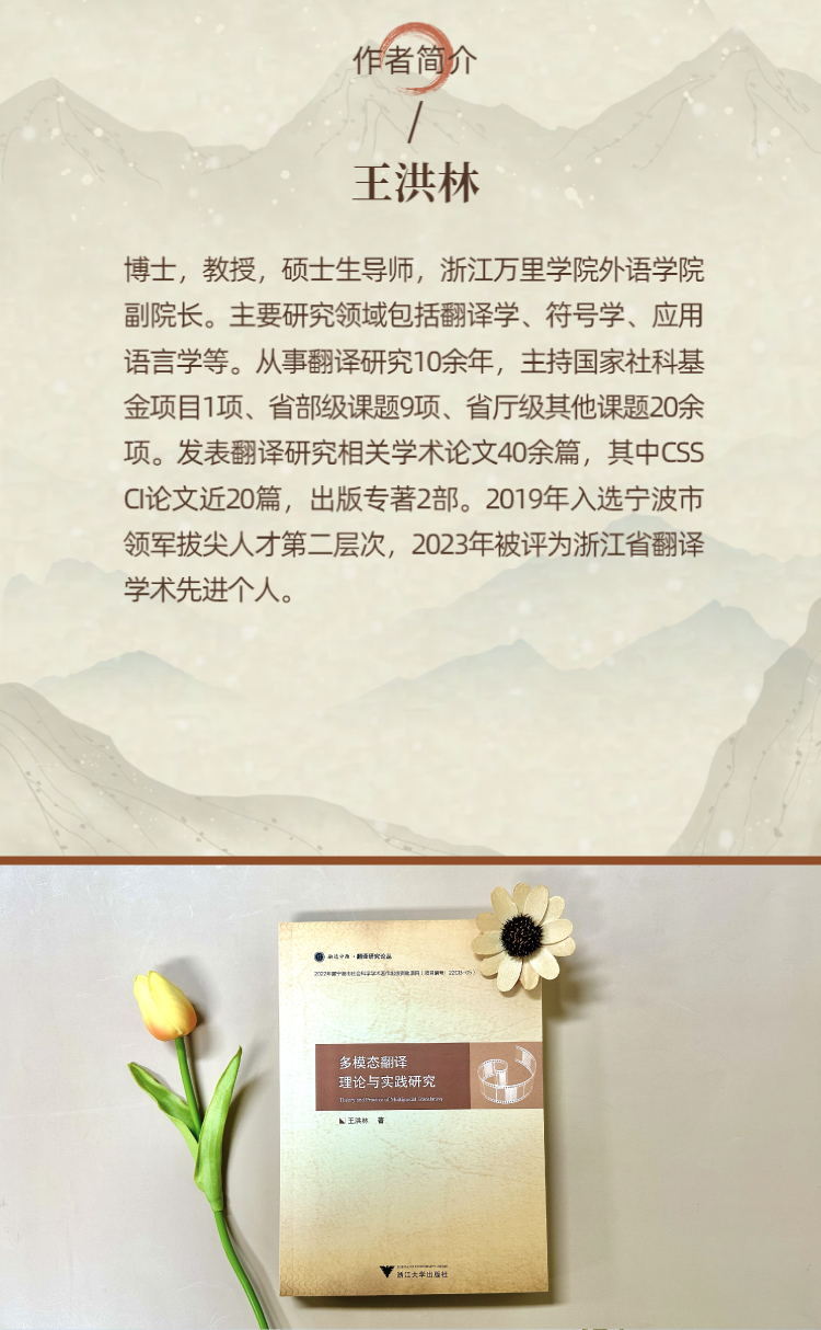 王洪林,博士,教授,硕士生导师,浙江万里学院外语学院副院长。主要研究领域包括翻译学、符号学、应用语言学等。从事翻译研究10余年,主持国家社科基金项目1项、省部级课题9项、省厅级其他课题20余项。发表翻译研究相关学术论文40余篇,其中CSSCI论文近20篇,出版专著2部。2019年入选宁波市领军拔尖人才第二层次,2023年被评为浙江省翻译学术先进个人。