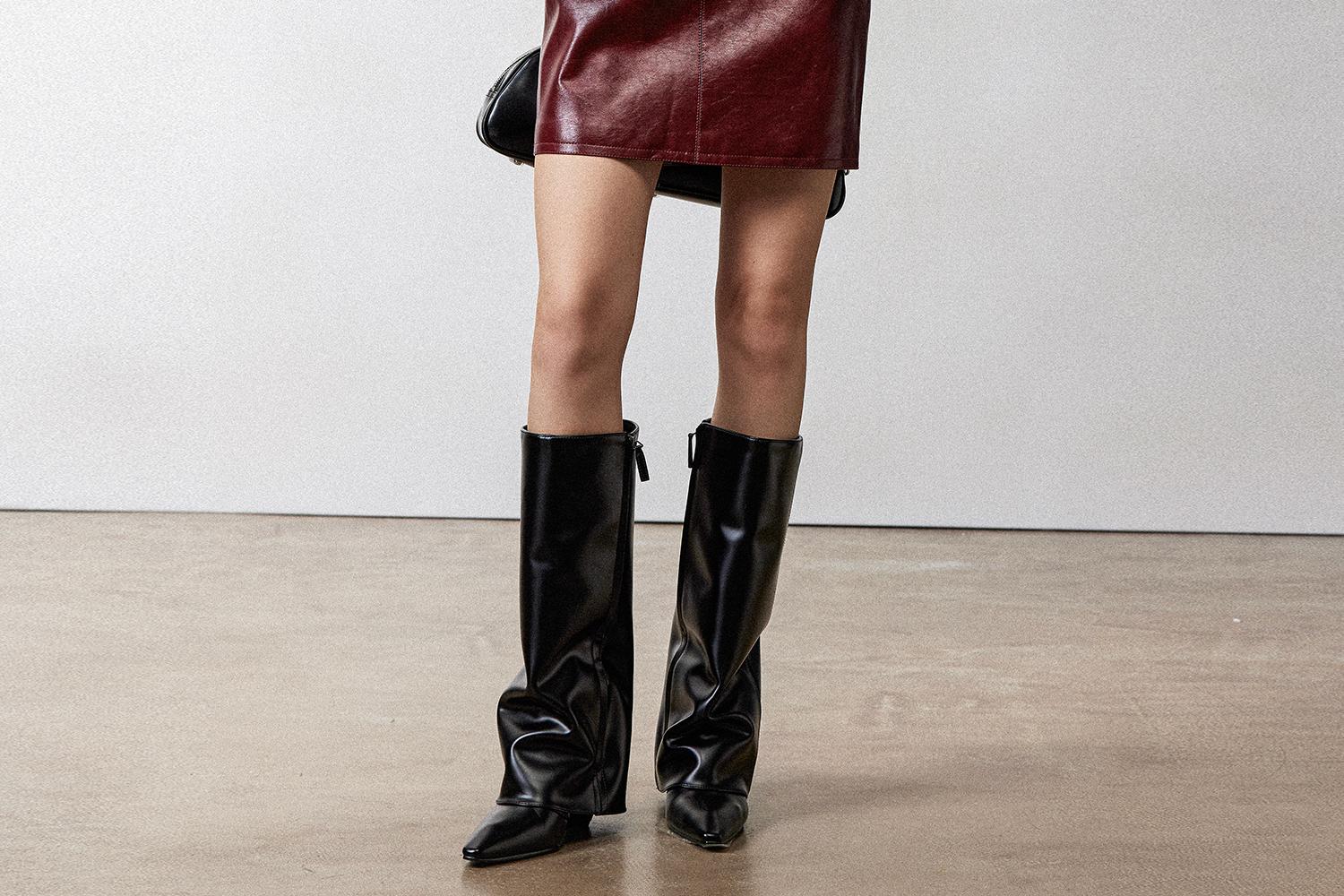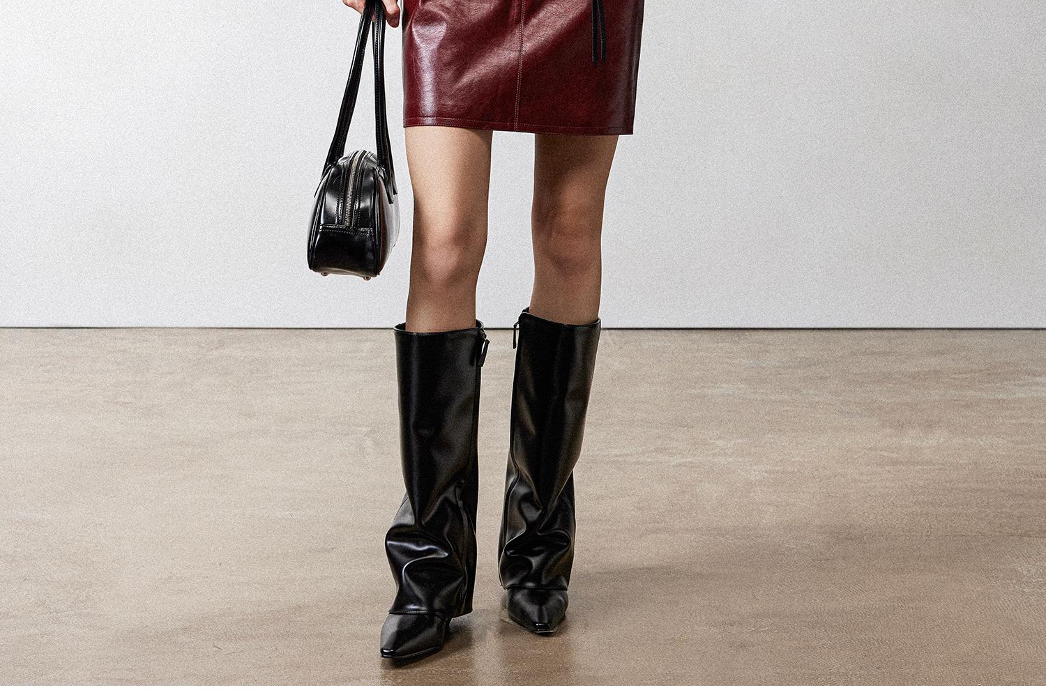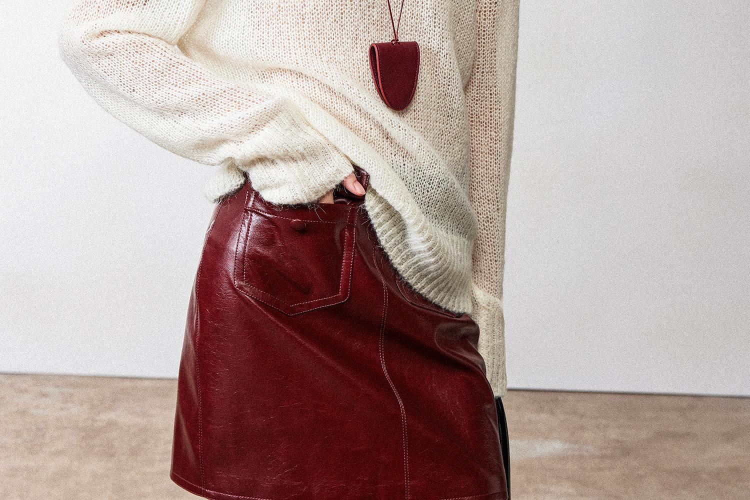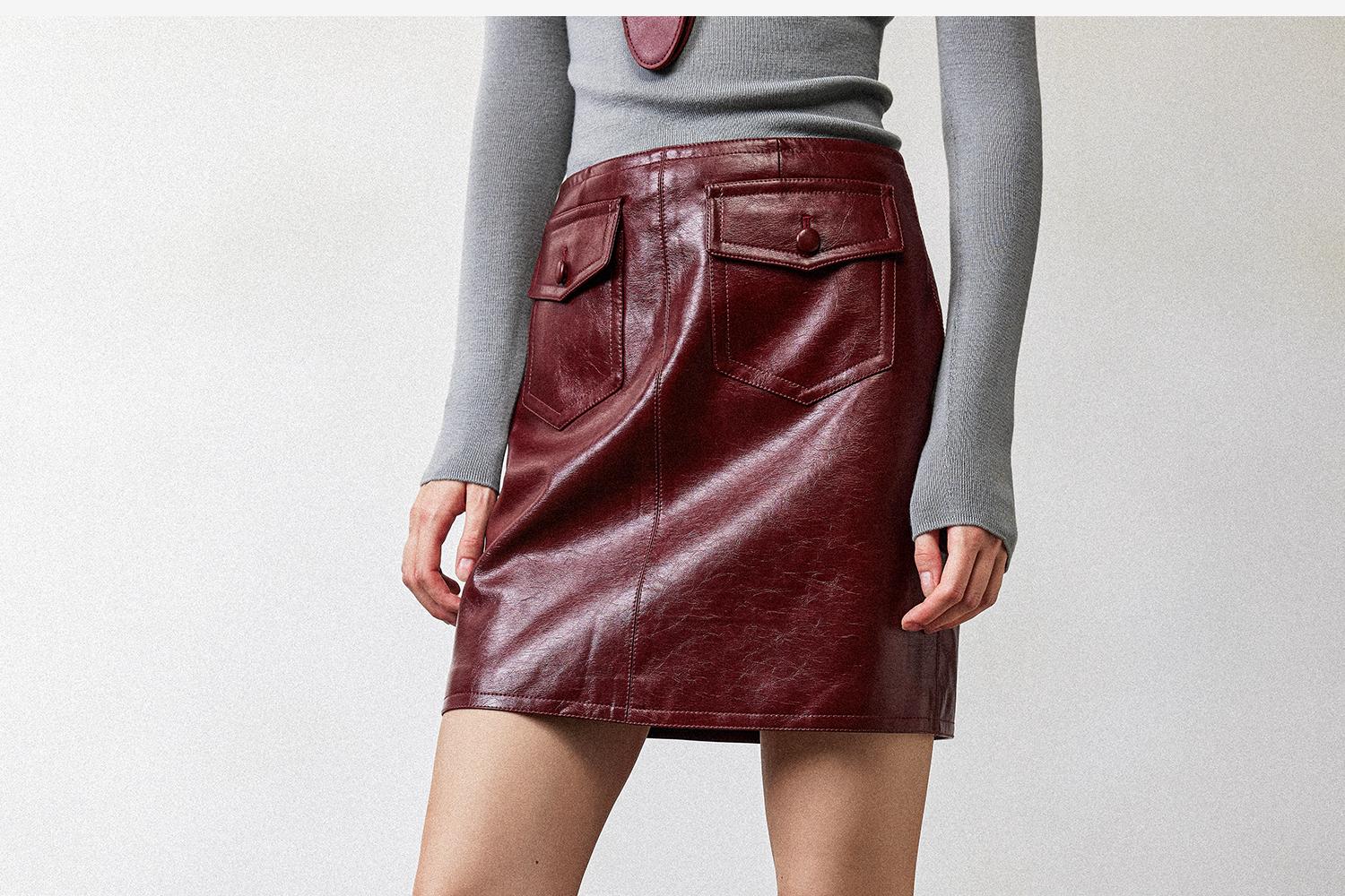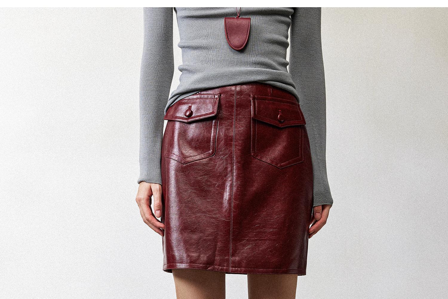 西嘉职场海妖风时髦优雅安可拉红PU油蜡皮半裙女2024秋冬小短裙(货号:BQ2404032)