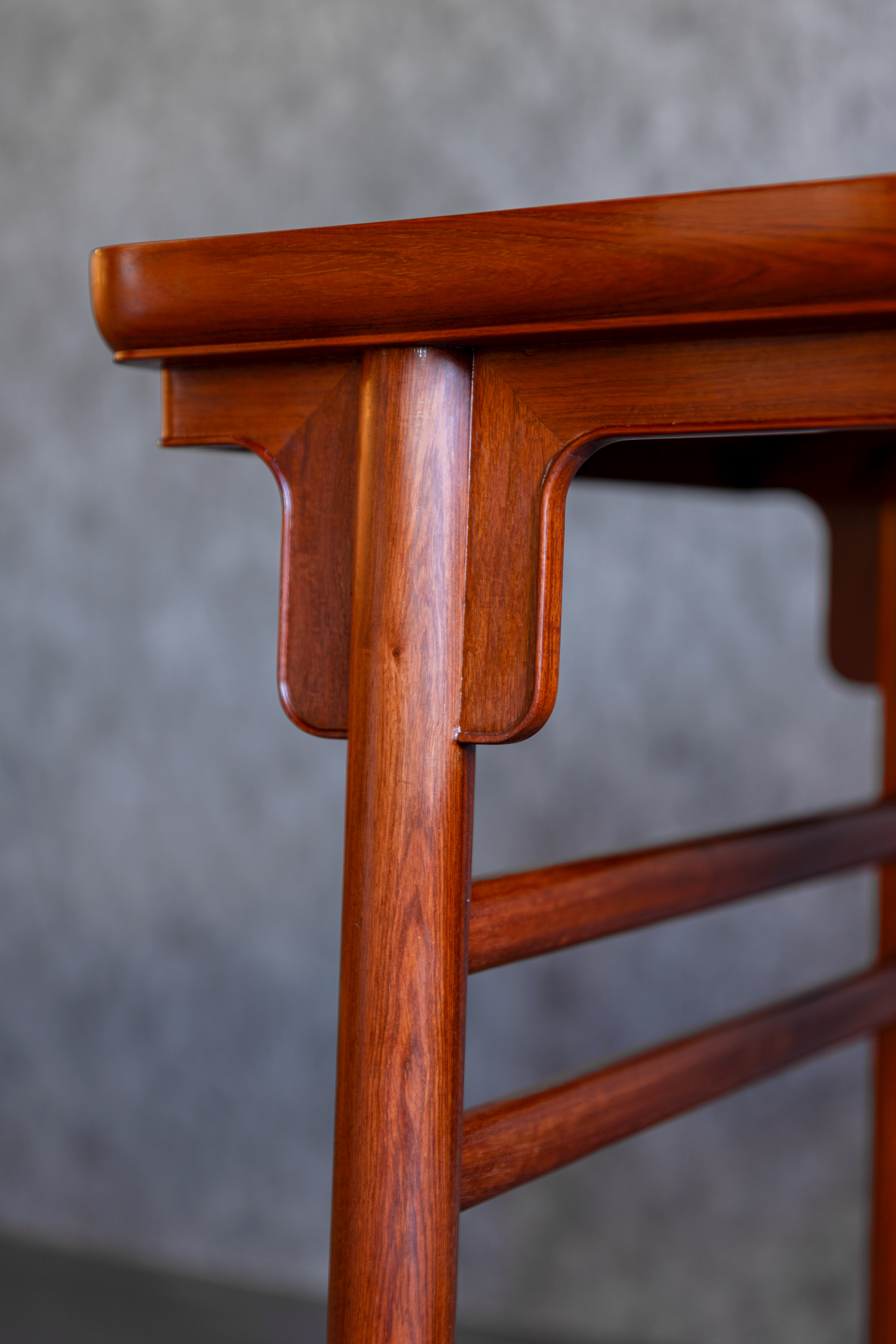 圆腿足,刀牙板,牙条起极细灯草线强调边缘,牙板和侧面堵头牙板做成大圆转角,与边框呼应,更显精致、细腻,腿足间装椭圆形双枨,整体可谓神来之笔。