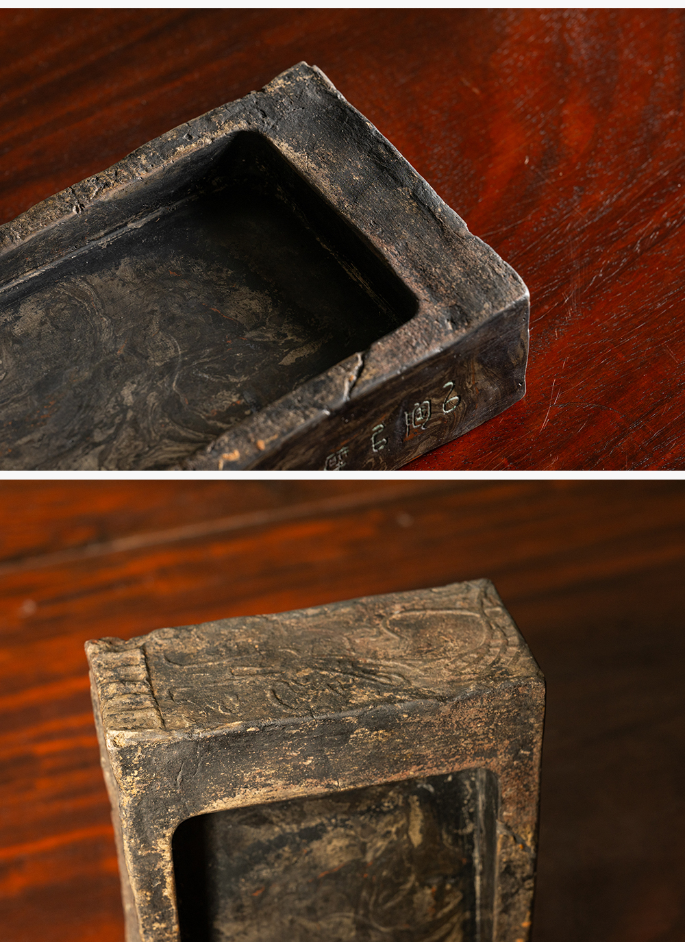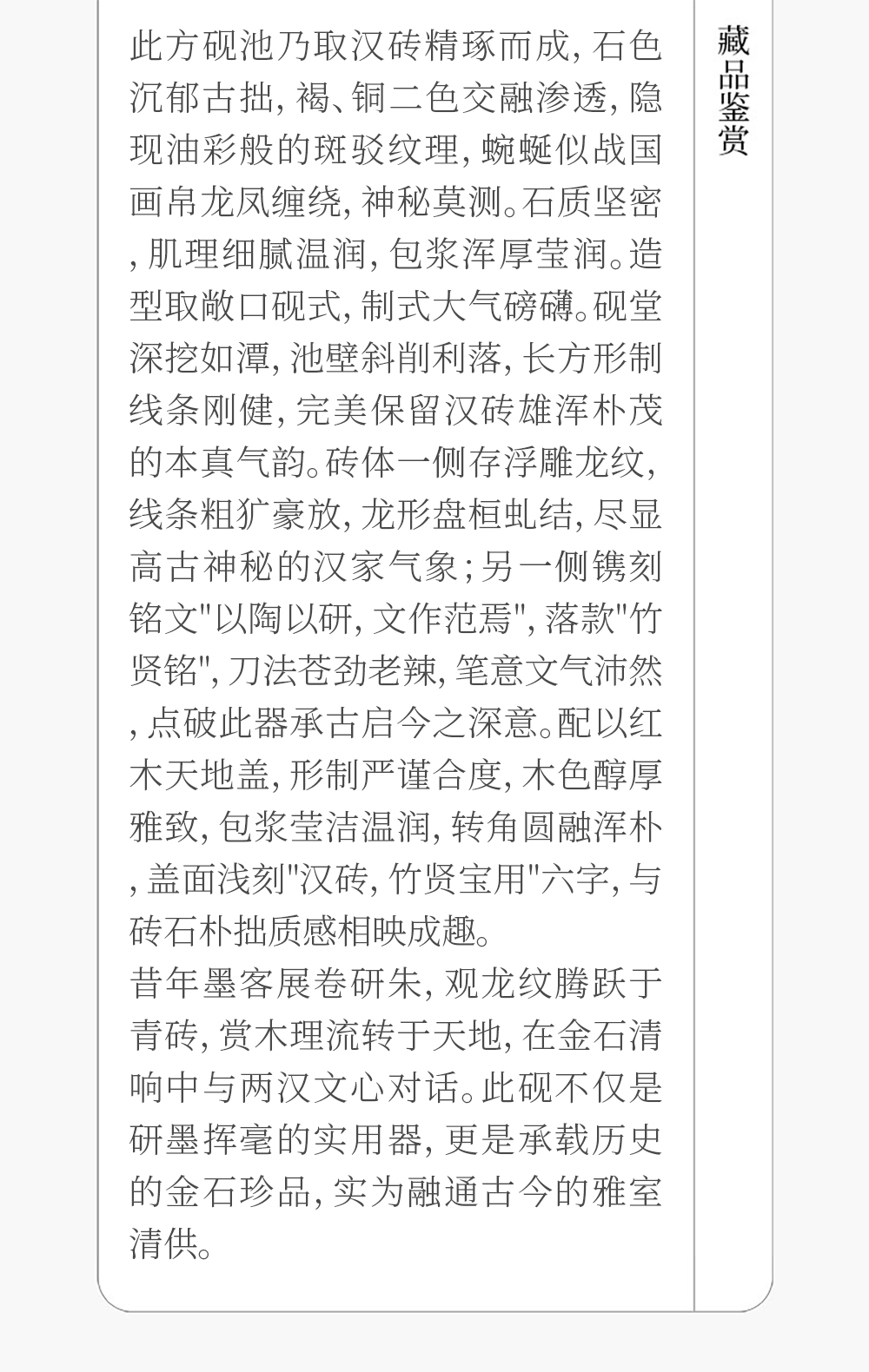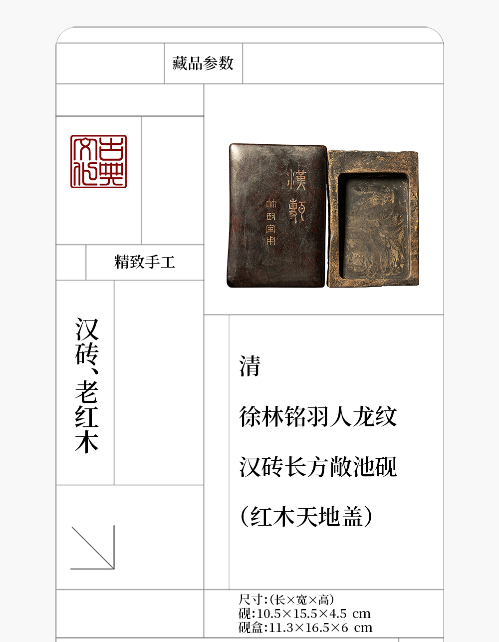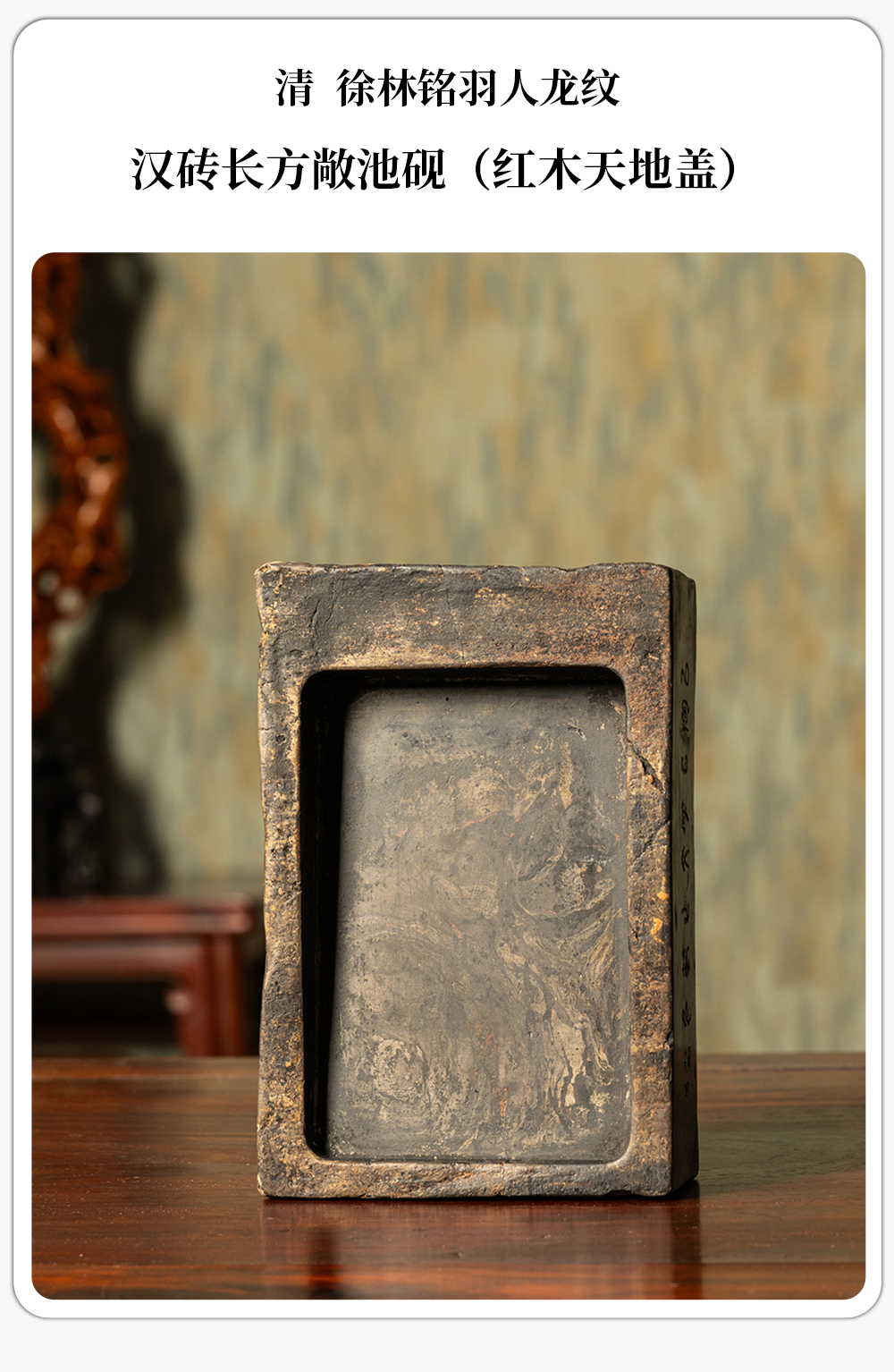 清 徐林铭羽人龙纹汉砖长方敞池砚(红木天地盖)