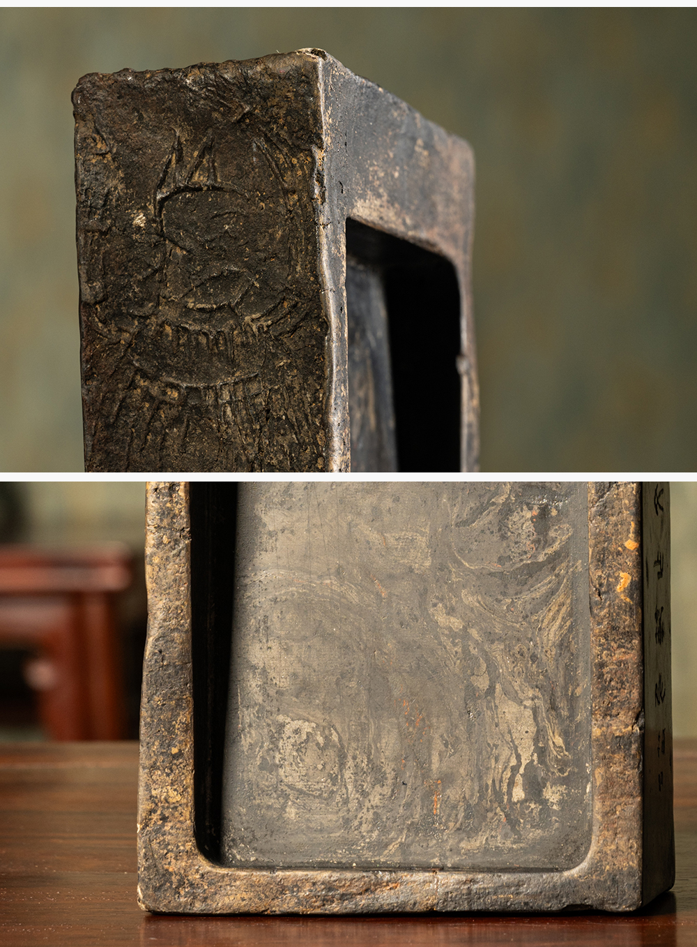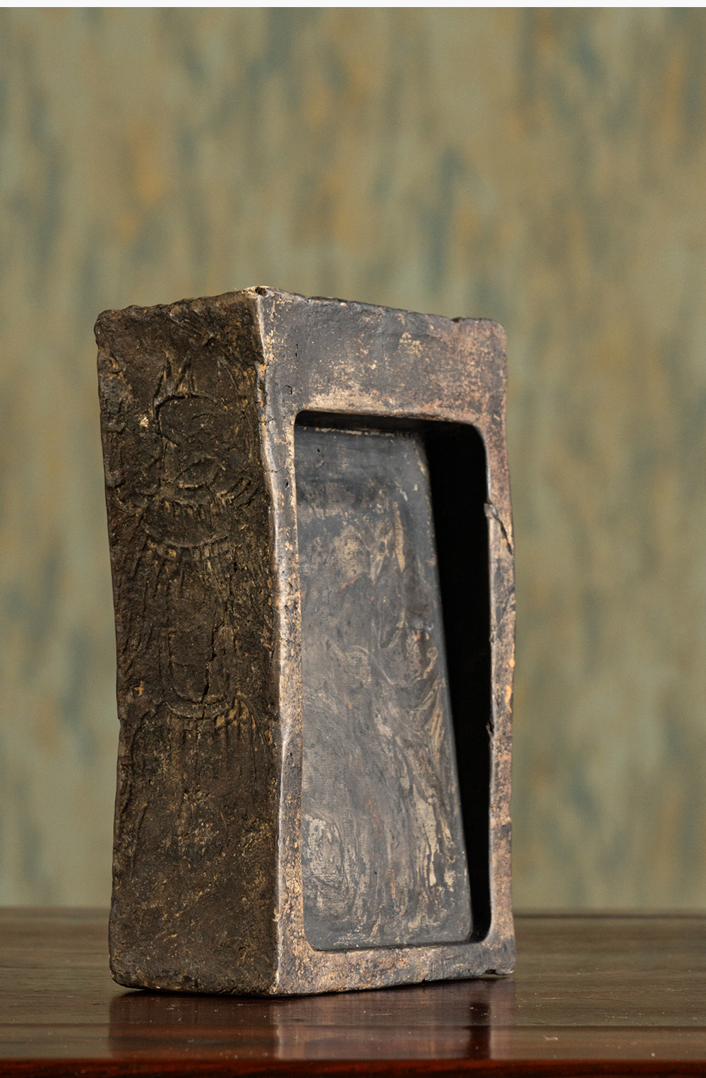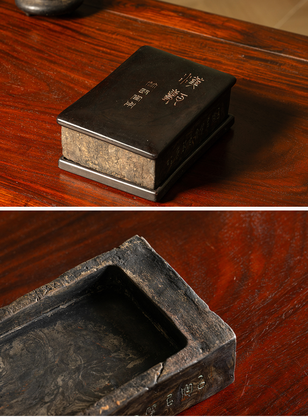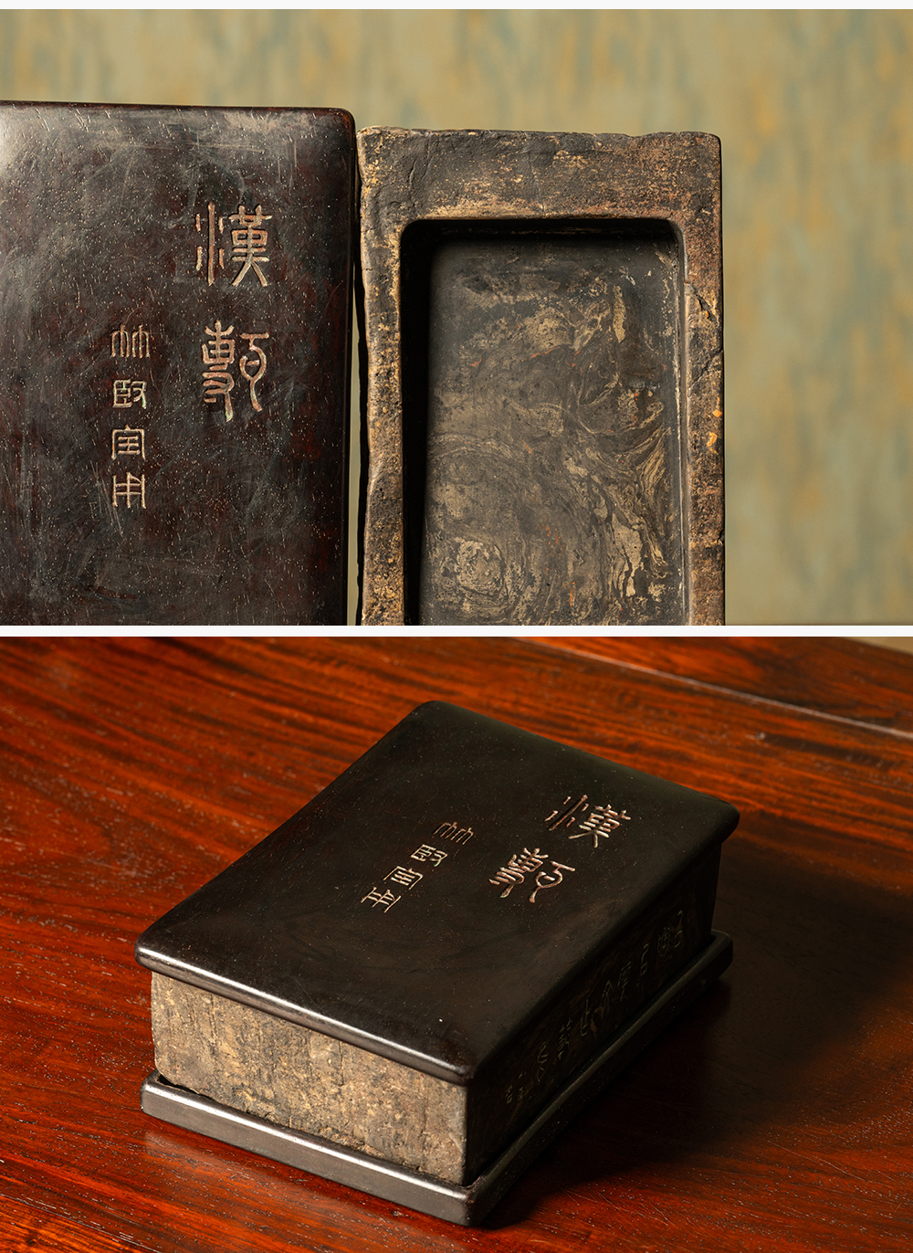 清 徐林铭羽人龙纹汉砖长方敞池砚(红木天地盖)