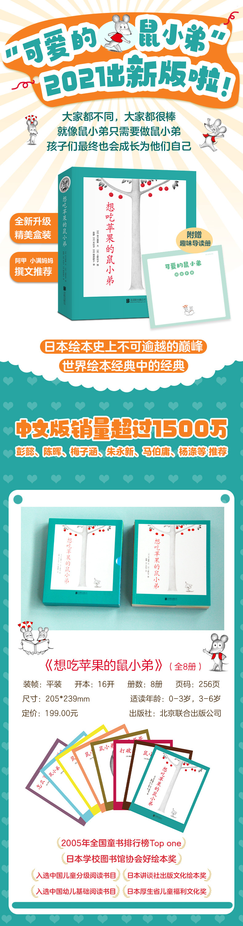 “想吃苹果的鼠小弟”(全8册)属于经典绘本故事,囊括了8个“可爱的鼠小弟”系列中关于自我认知的故事。鼠小弟个子小、力气小、胆子小、本领小——小小的鼠小弟怎么能吃到高高树上的苹果?打破了杯子,要勇敢承认吗?没法吹小号,怎么在音乐会上演出?长大了以后做什么……怎样看待自己和别人的差异,怎样认识自己?“想吃苹果的鼠小弟”系列故事帮助每个孩子接受自己,做自己喜欢的事情、适合的事情、感到快乐的事情。