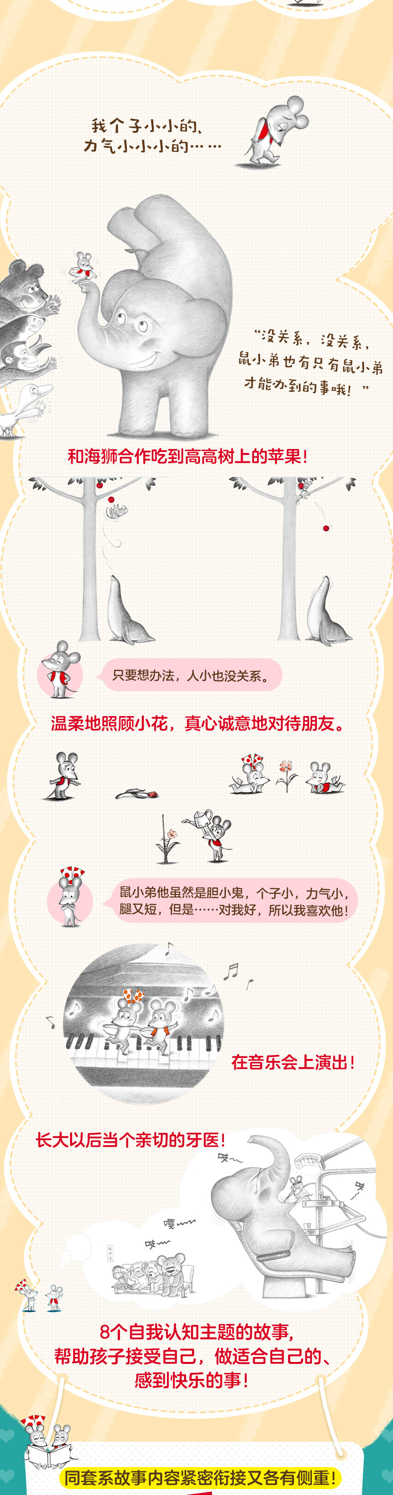 2)8个故事内容紧密衔接又各有侧重,《打破杯子的鼠小弟》教会孩子勇敢与坦诚,《鼠小弟与大象哥哥》让小朋友认识自我,《鼠小弟,长大以后做什么?》里自我实现的故事带孩子寻找未来的理想与职业……同样主题、不同侧重的故事,互相阐发互相补充,让孩子在不知不觉中形成和发展健康自我!