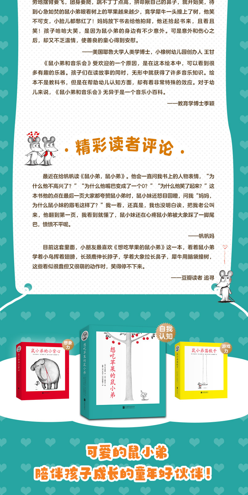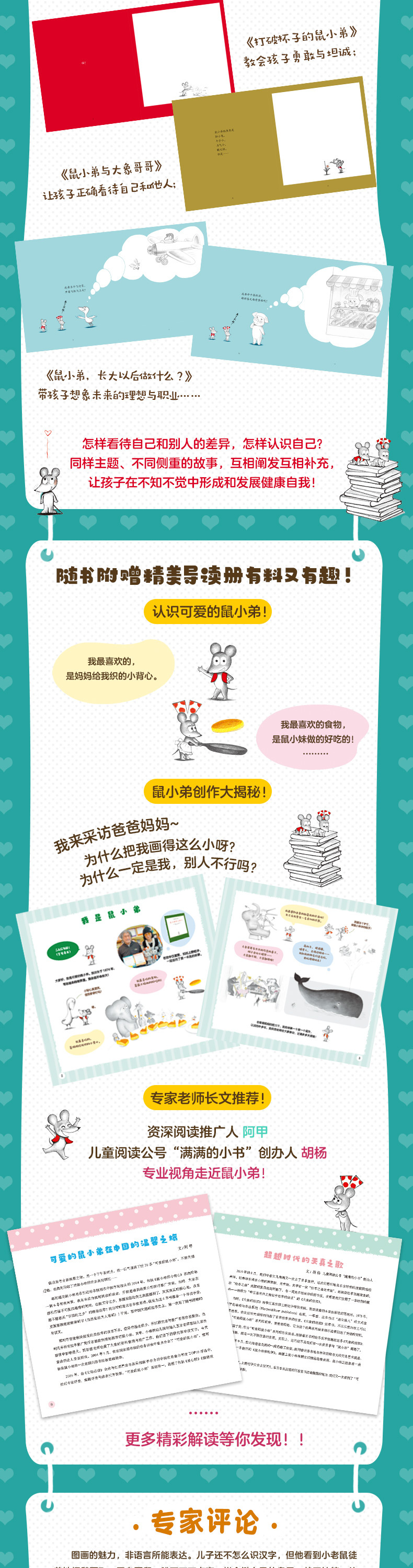 4) “可爱的鼠小弟”系列绘本可以帮助孩子学习说话,学习认字!学龄前是孩子的语言敏感期,把握这一时期学习语言将会提升孩子理解力、阅读力。语言学习需要情境与重复两大要素,“可爱的鼠小弟”简单重复的语言帮助孩子在开始接触文字符号时熟练记忆,在合适的情景和反复练习中,让孩子形成条件反射,自然而然熟记语言!鼠小弟译者猿渡静子老师就曾说道,“《可爱的鼠小弟》是儿子八个月大时我给他读的书。他现在已经读过500多本绘本,能自己阅读文字书,至今我没有刻意教他认字。老师们称赞他的理解与表达能力远超同龄的孩子。”