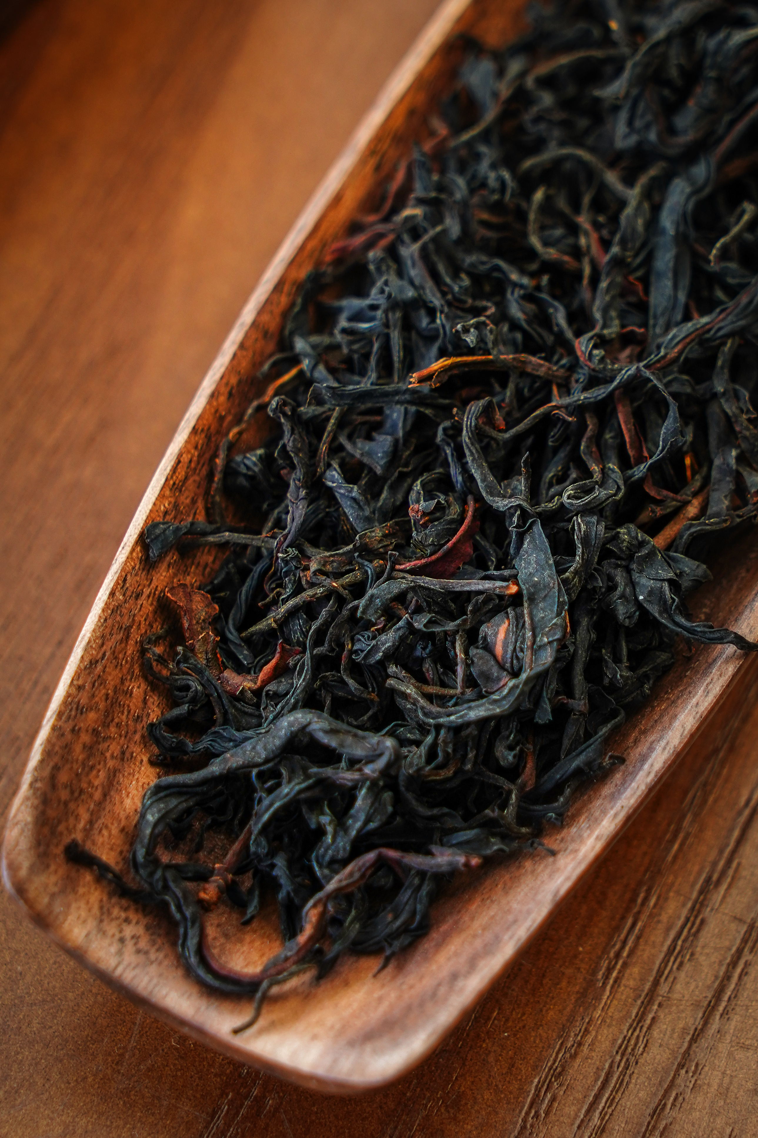 普通野生红干茶叶底显部分褐红色,而这款(千年野生红)条索则是乌黑油润,这是野生红树大的特征之一