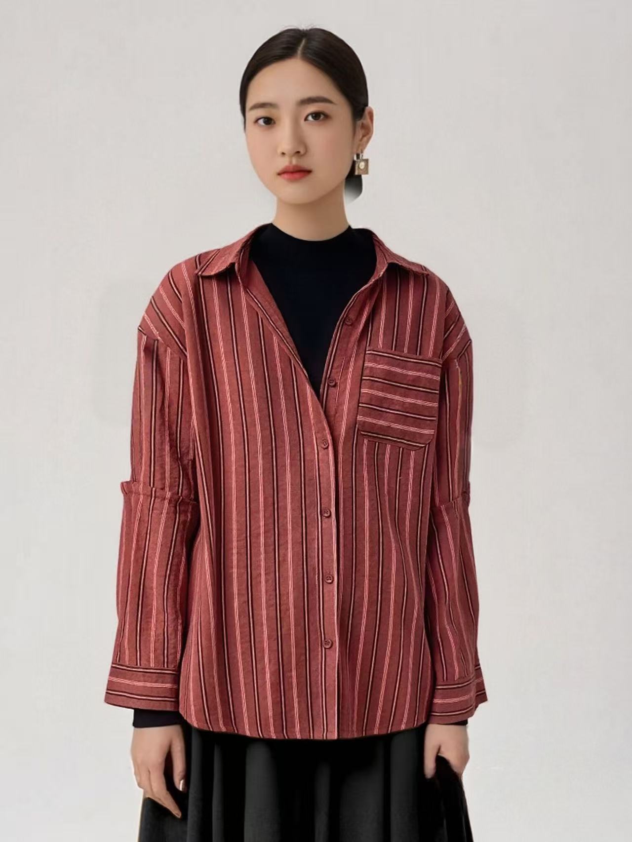 【秋新品】古泥7771红色条纹秋季侧开叉单件衬衫-喜出
