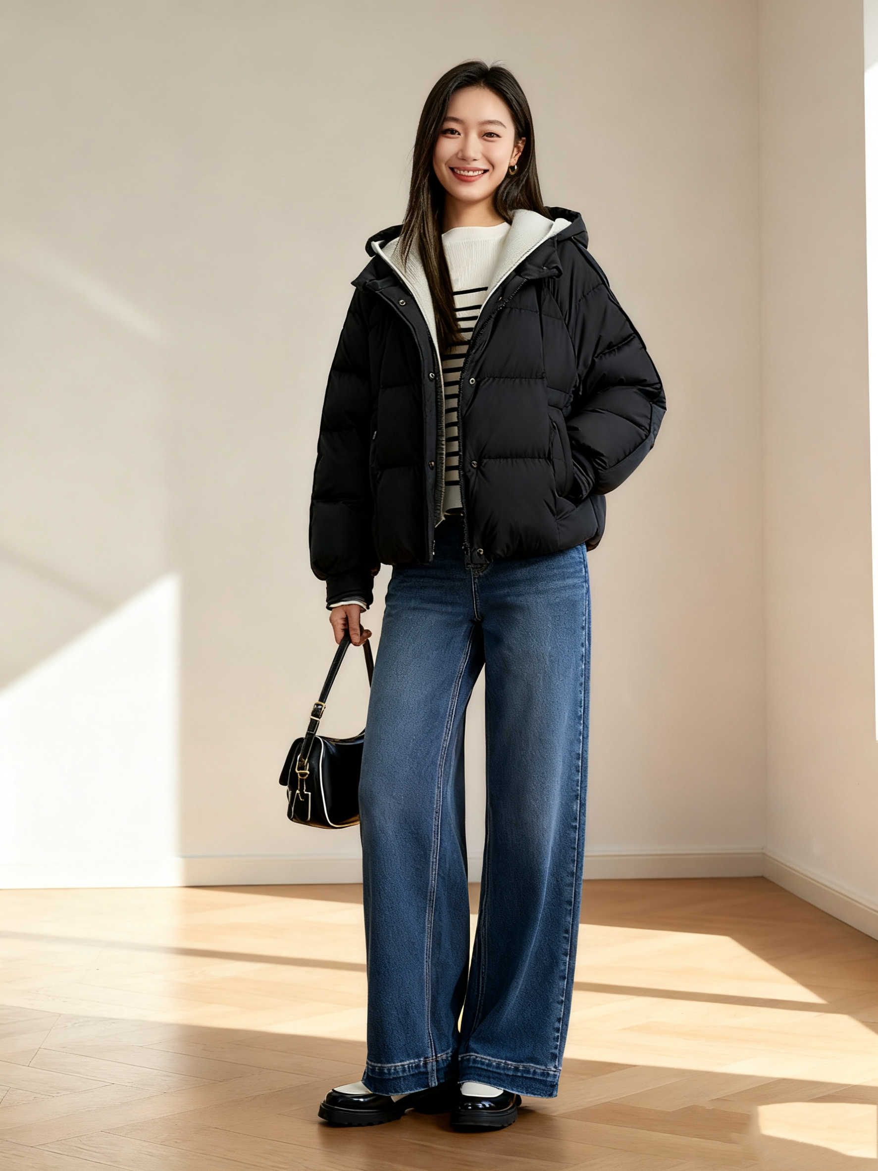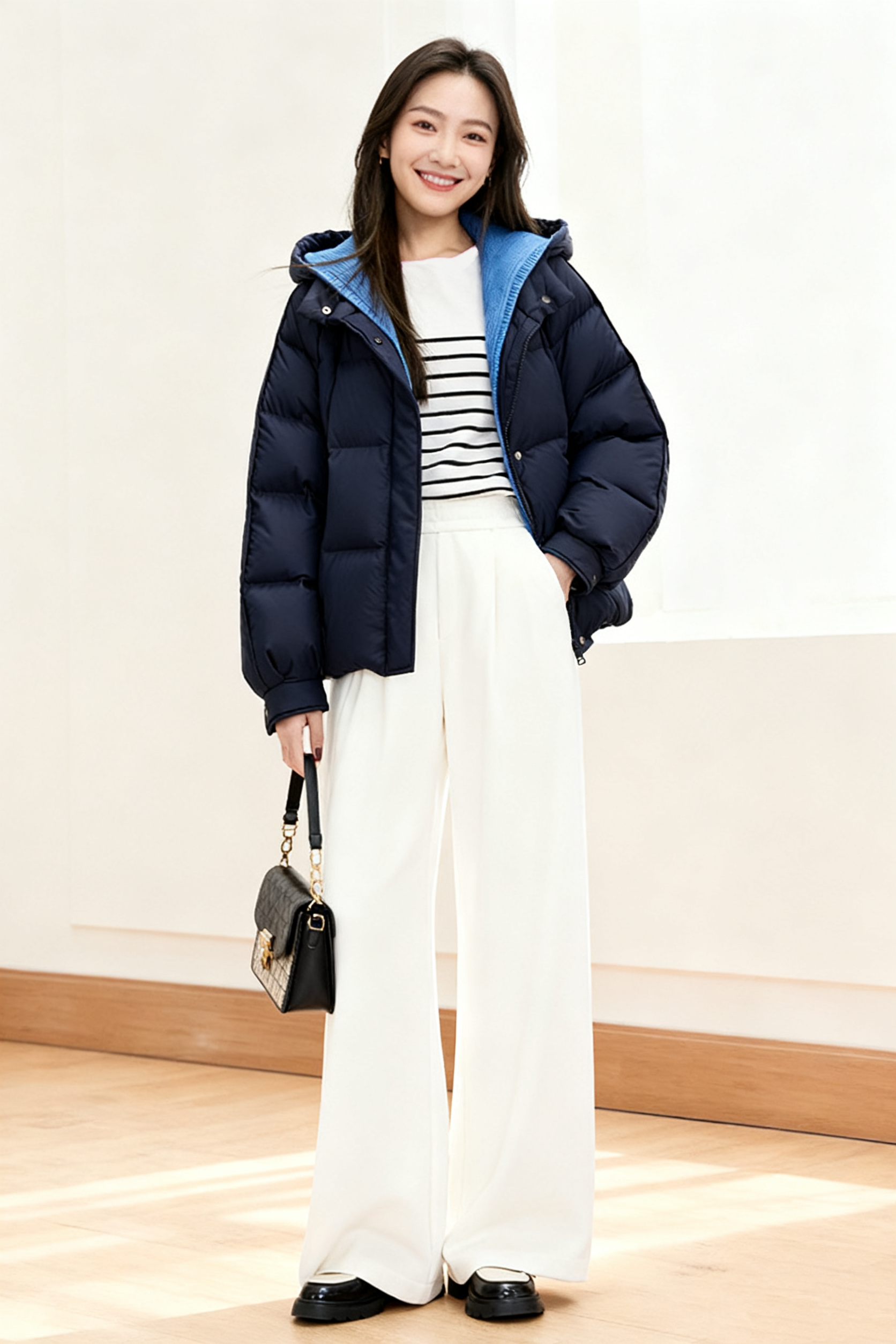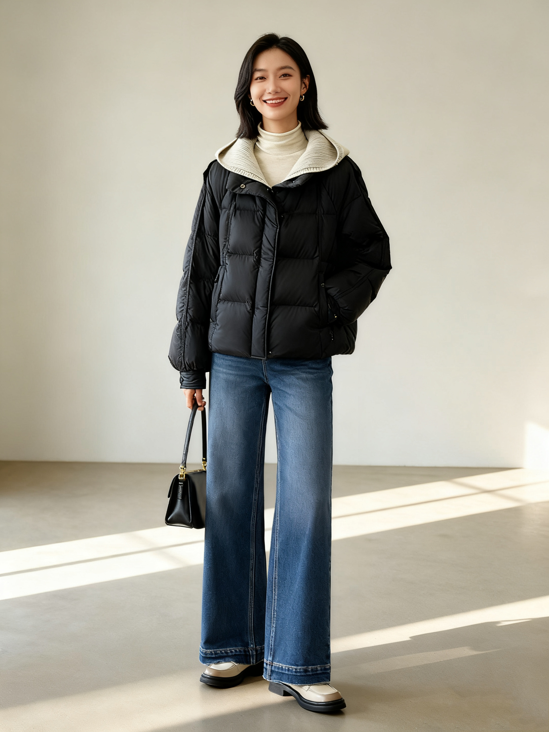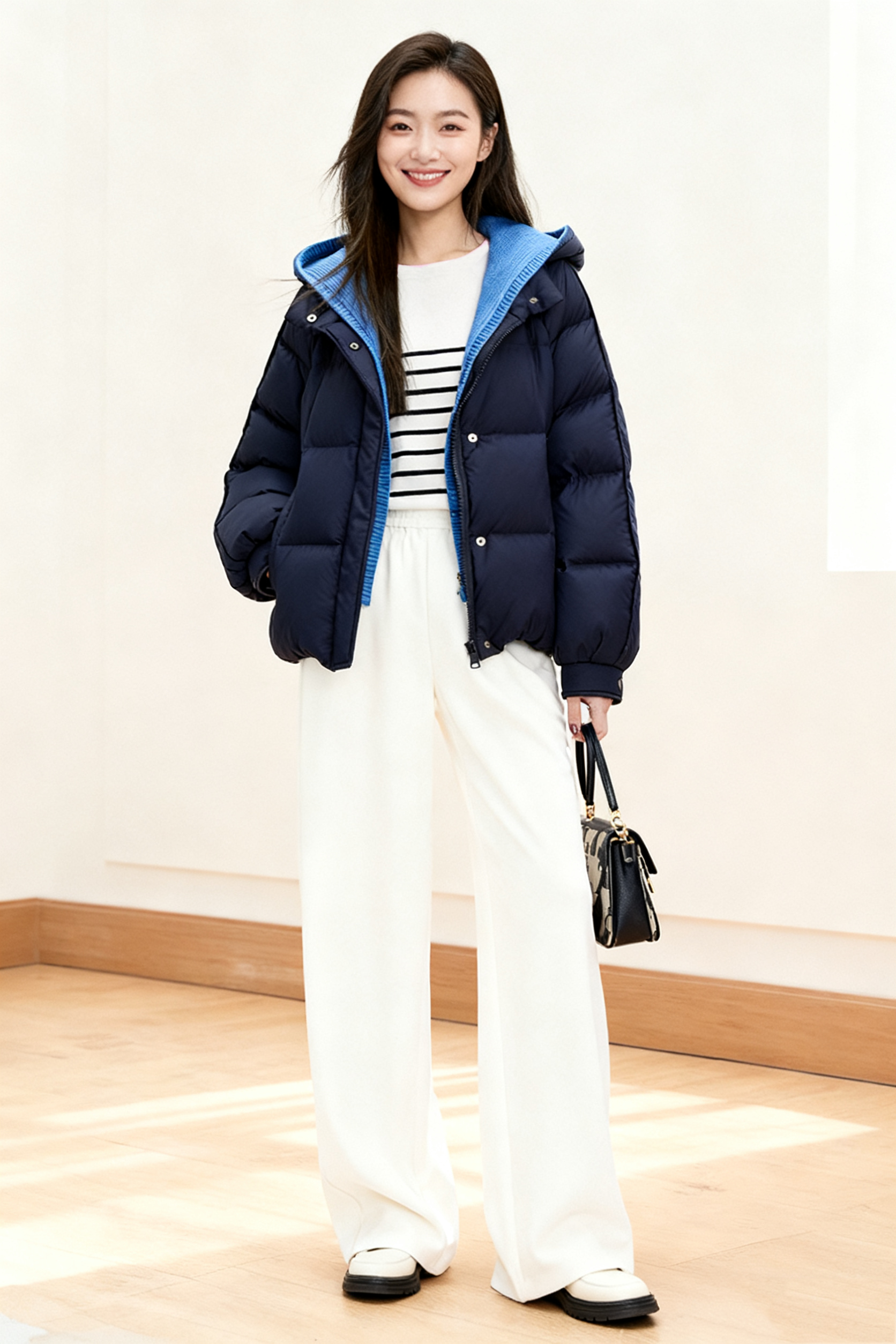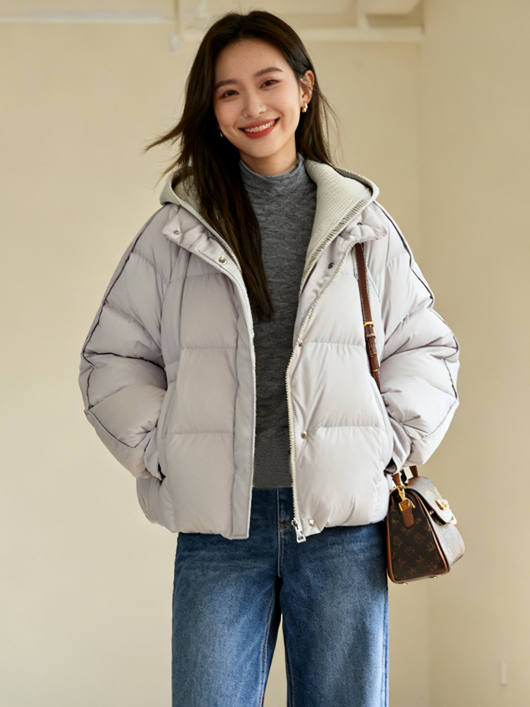 [烟花]可脱卸帽羽绒服, 90%鸭绒,轻盈温暖。[庆祝]插肩袖+短款,提升腰线,对小个子友好。[太阳]帽子可随心拆卸,轻松切换不同风格,解锁冬日多种时髦可能[礼物]