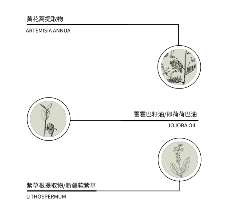 我们的灵感,源于自然中那些富有生命力的植物。比如大名鼎鼎的青蒿素,即来源于黄花蒿。它生长在荒郊野外,极不起眼,却经常蓬勃地连成一片,展现着坚韧的生命力。我们将其中的精粹,融入经典的紫草配方之中。