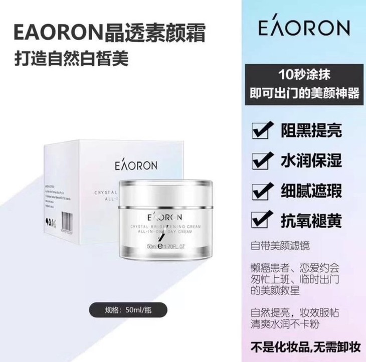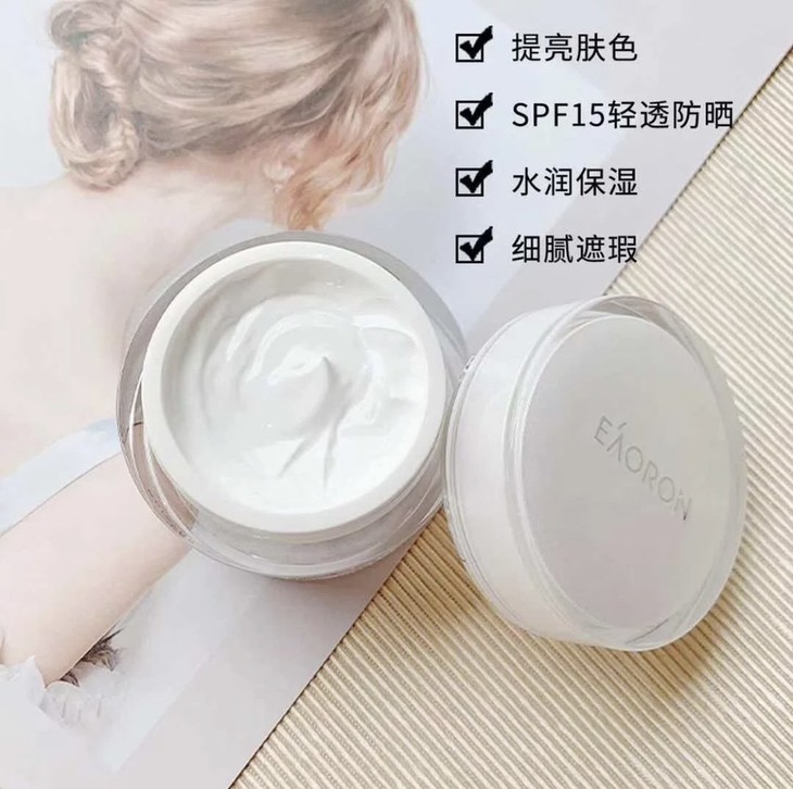 Eaoron素颜霜 50ml👍素颜美肌的秘密🤫。它具有亮肤、美白、防晒、匀净肤色的作用。上脸柔肤效果很棒,天生好皮肤既视感。主打澳洲纯天然护肤成分🌿,VC含量非常丰富,比蓝莓中的VC含量高出100倍,是抗氧化、美白的黄金成分🌟。里面还有SPF 15的防晒值,抵挡日常生活中紫外线完全足够,完美替代面霜和防晒。细腻水润好推开,清爽无油腻感,敏感肌也无压力。