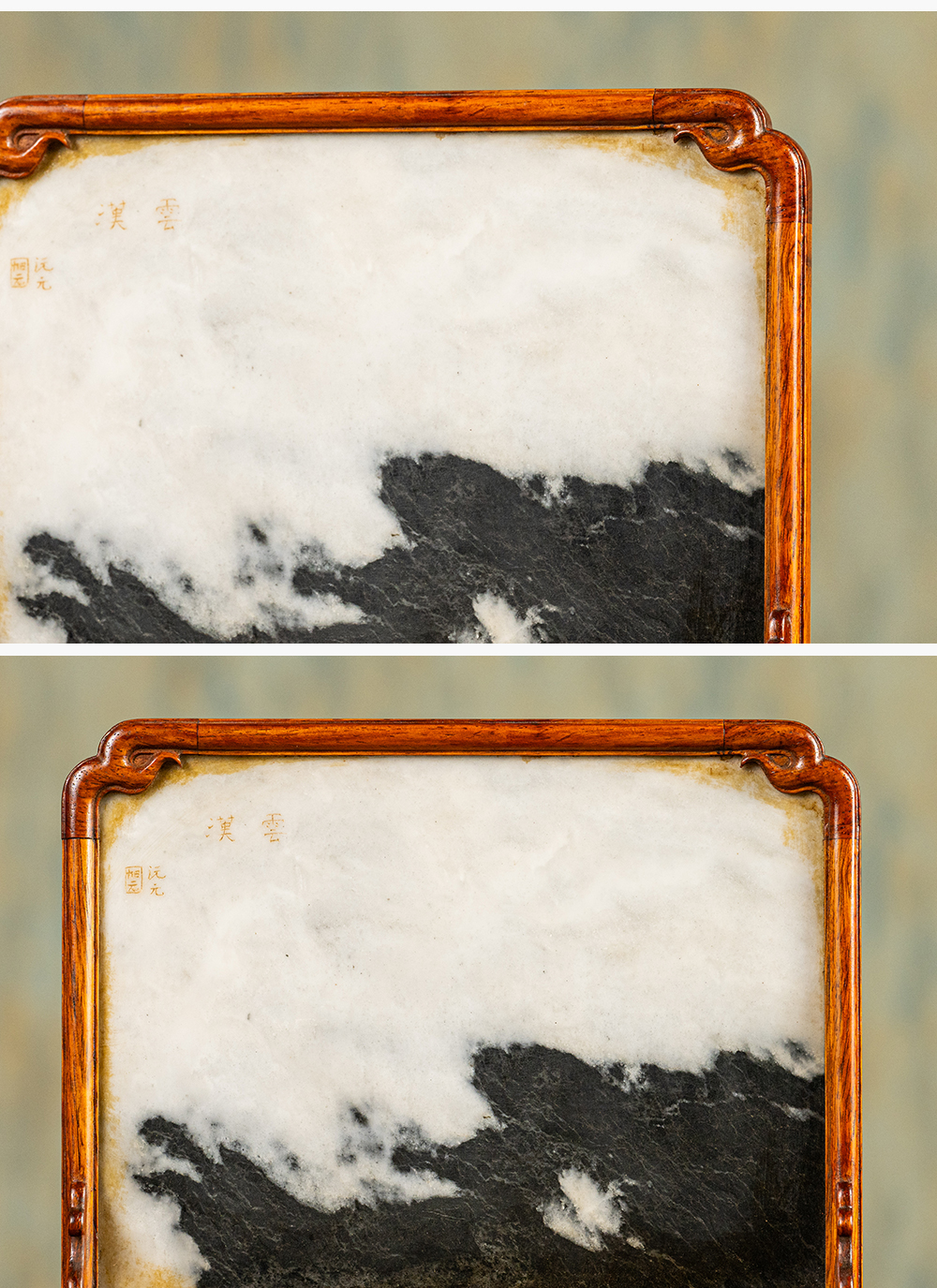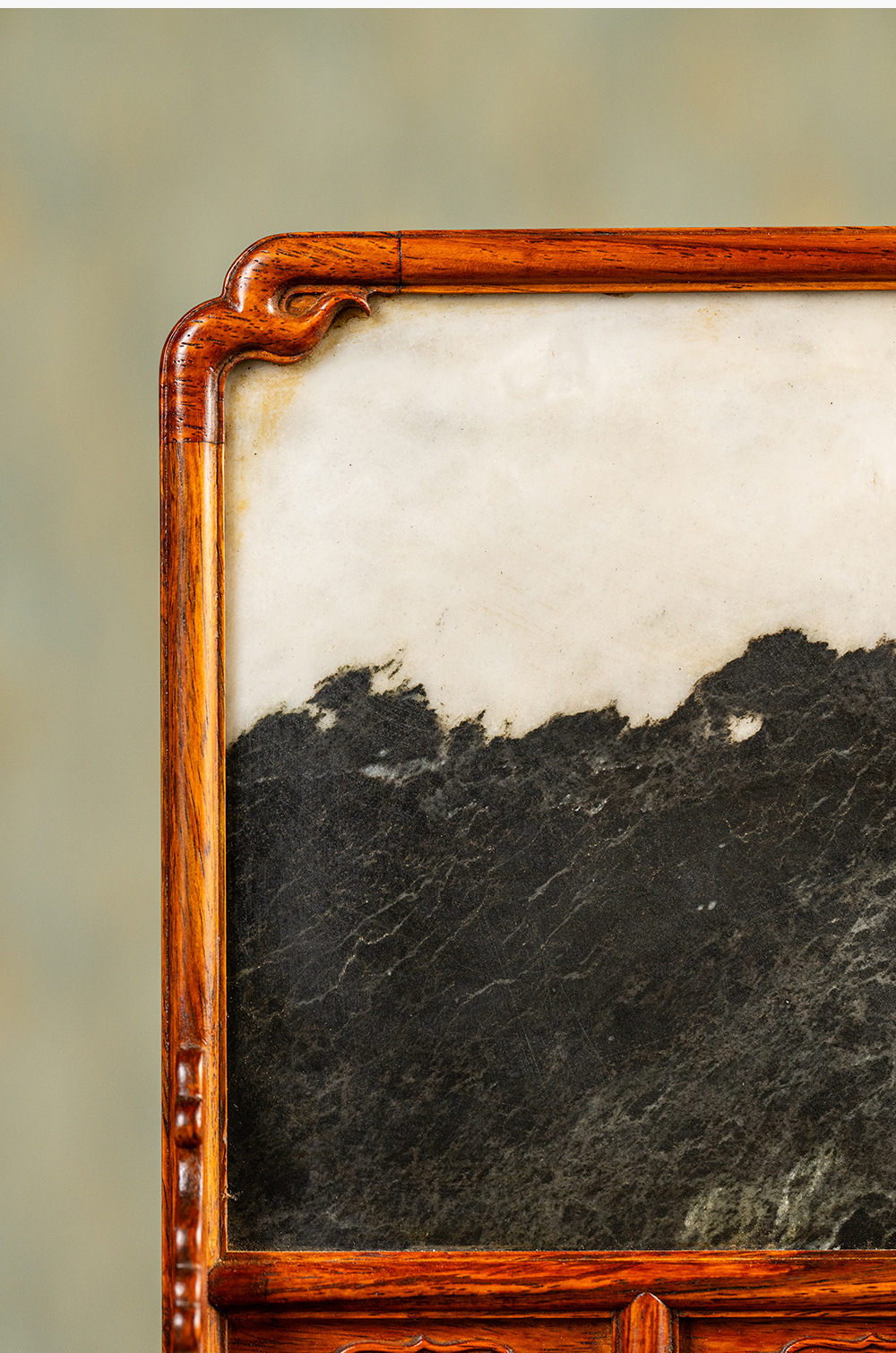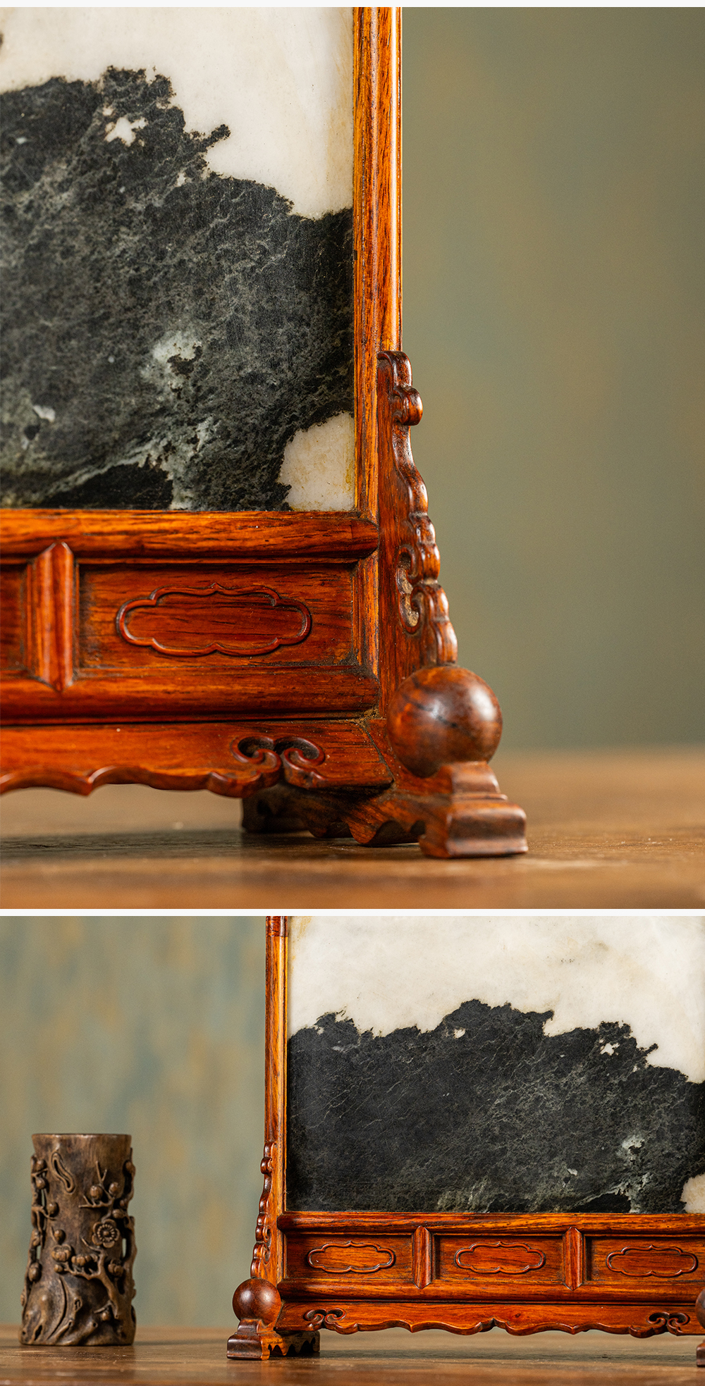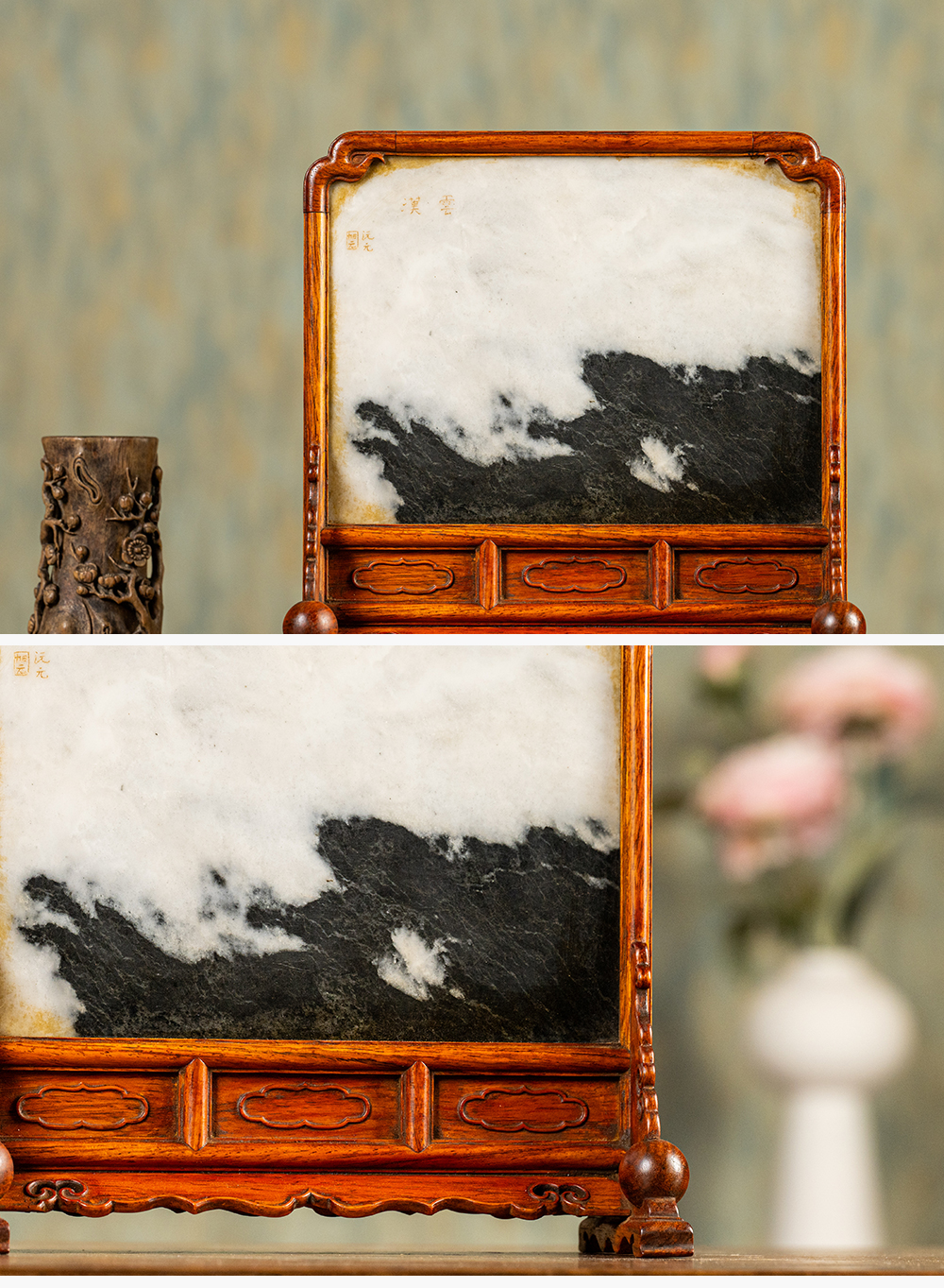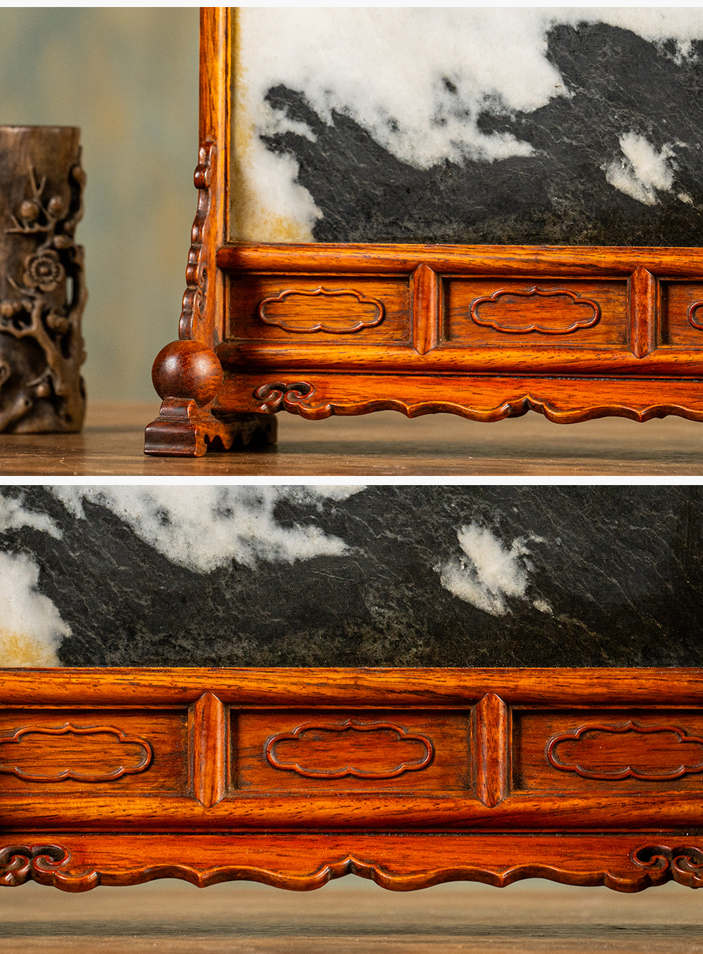 清代 红木镶瘿木嵌寿山石山水人物插屏