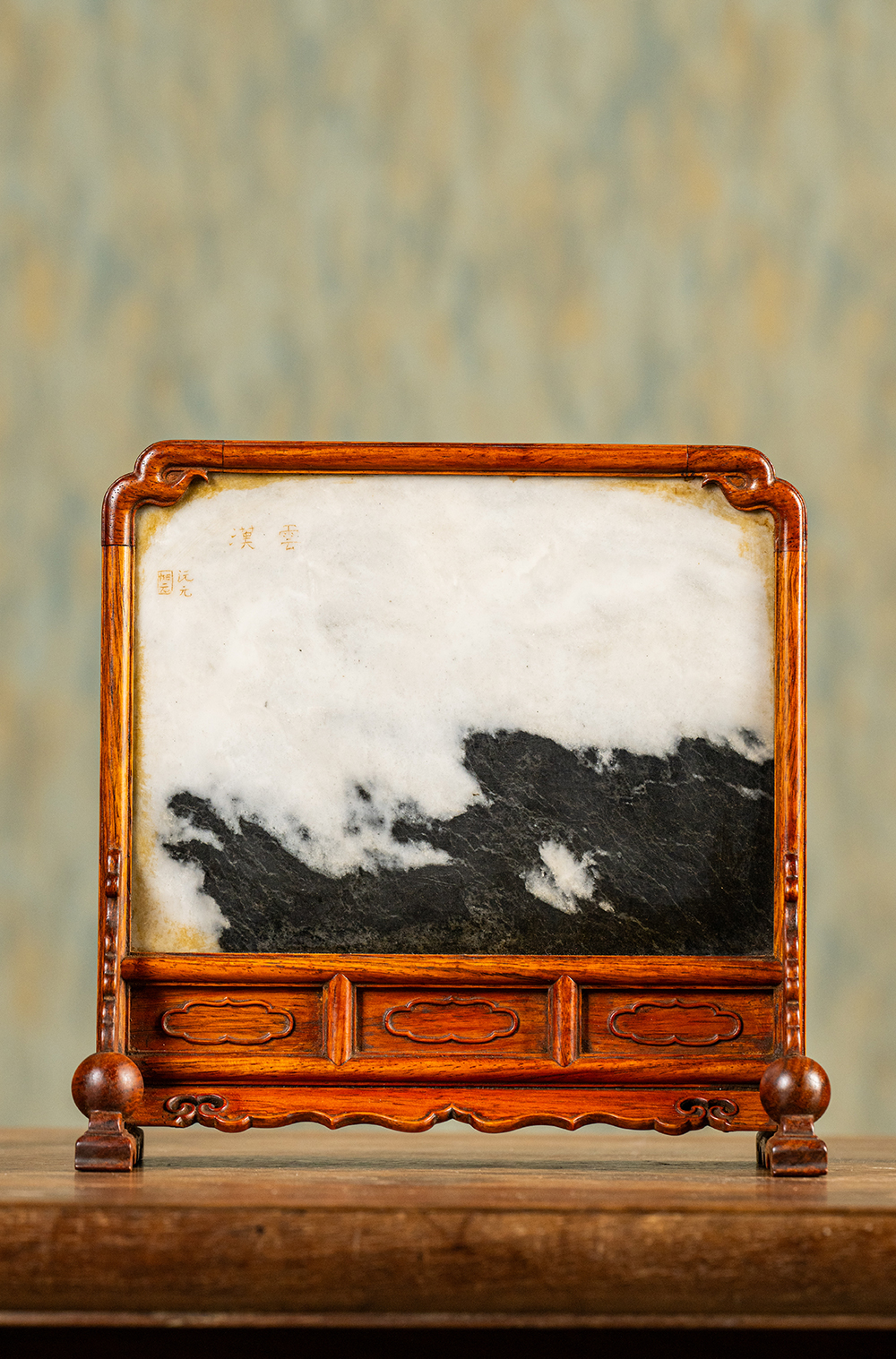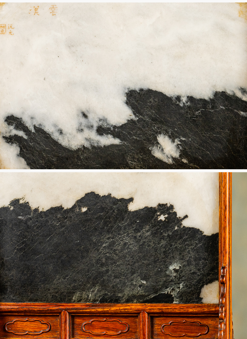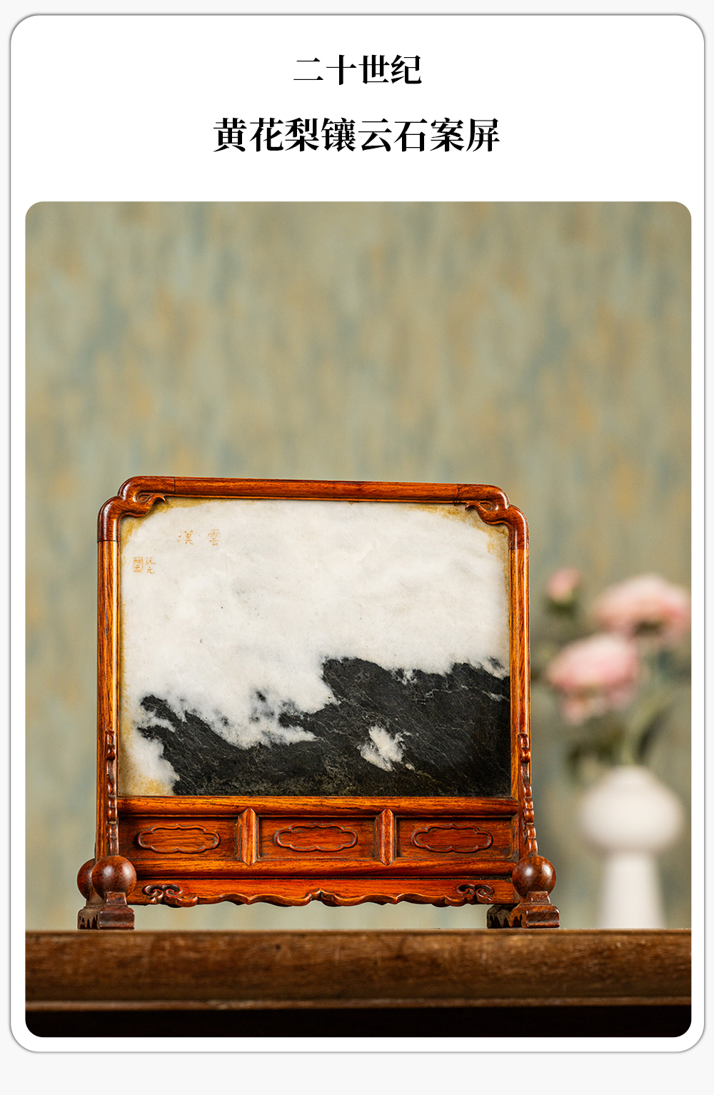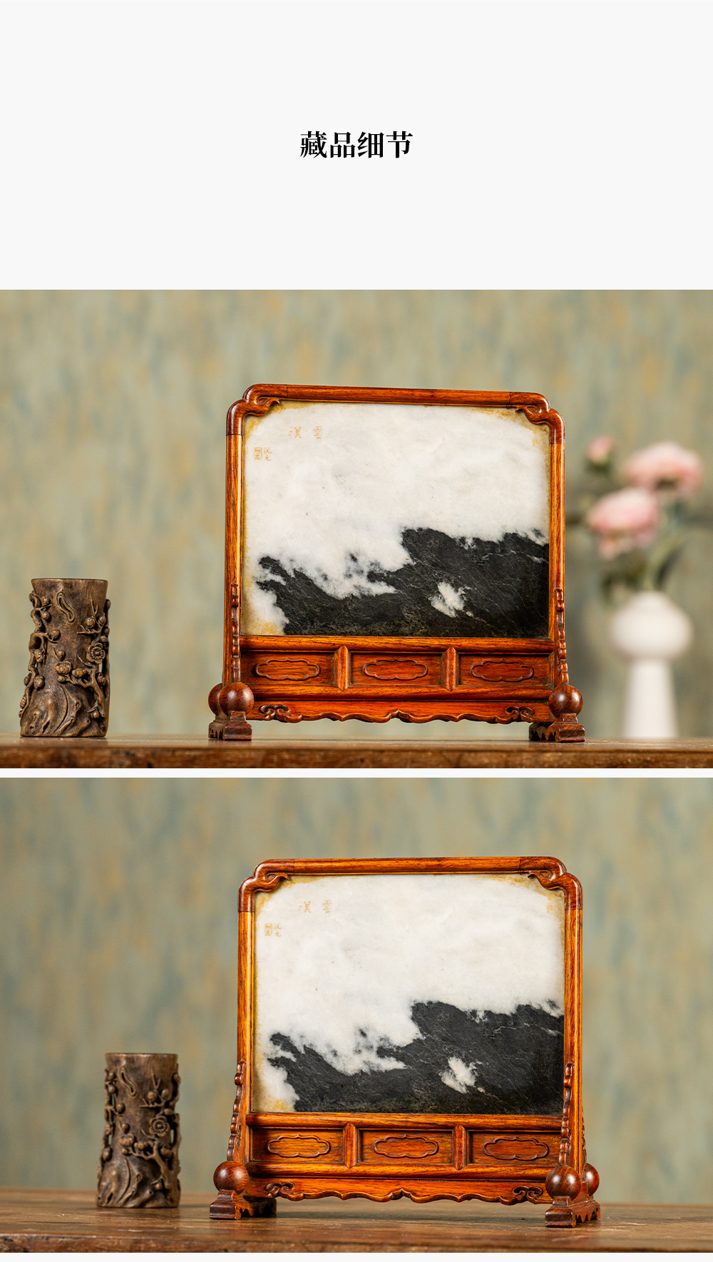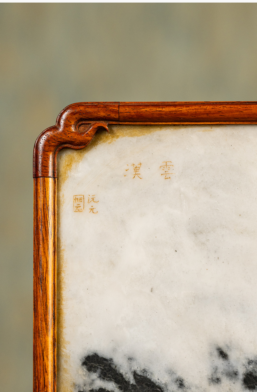 清代 红木镶瘿木嵌寿山石山水人物插屏