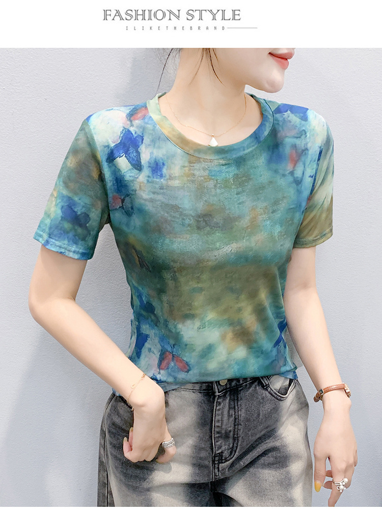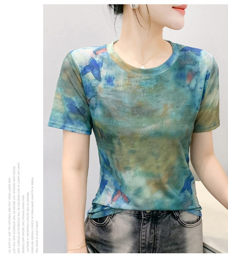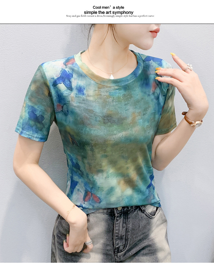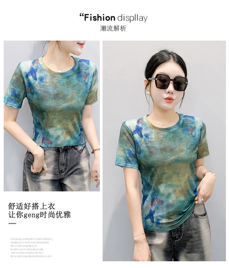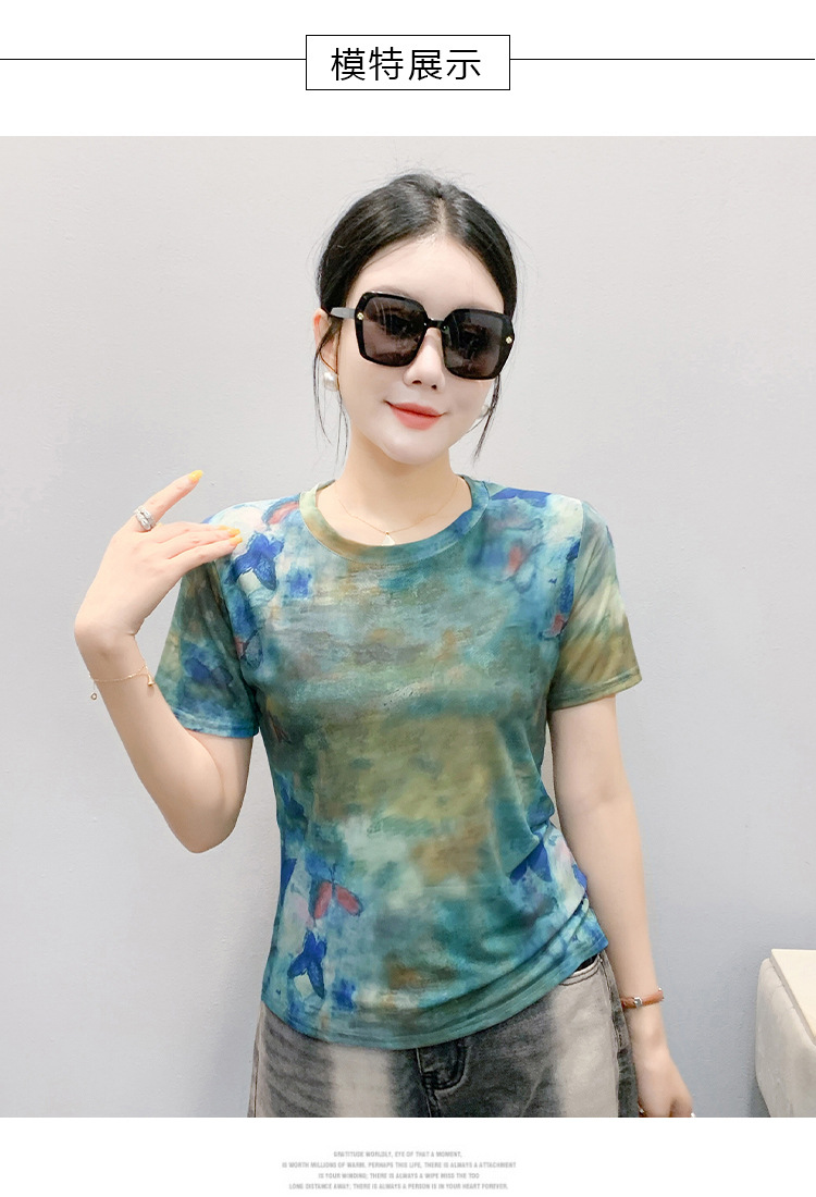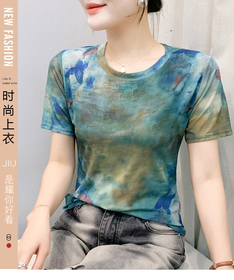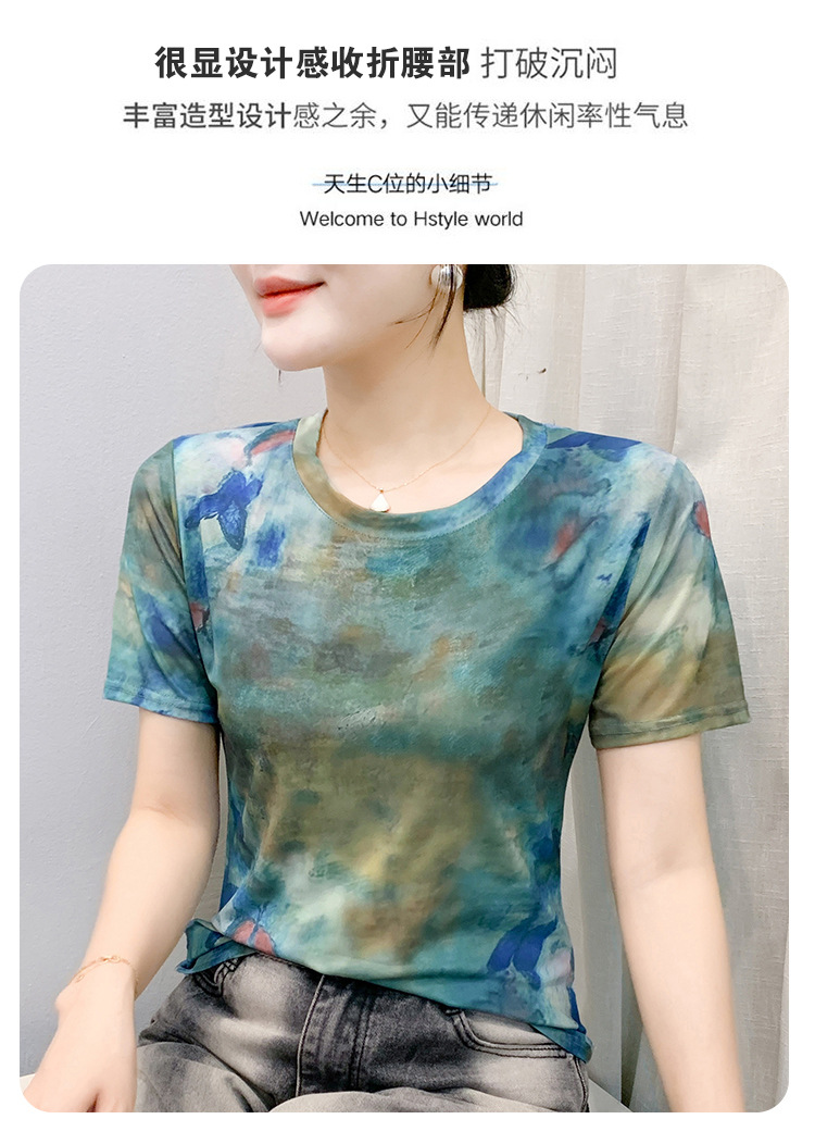 圆领晕染网纱短袖t恤,百搭洋气衣服时尚百搭小衫KQL-311H9057