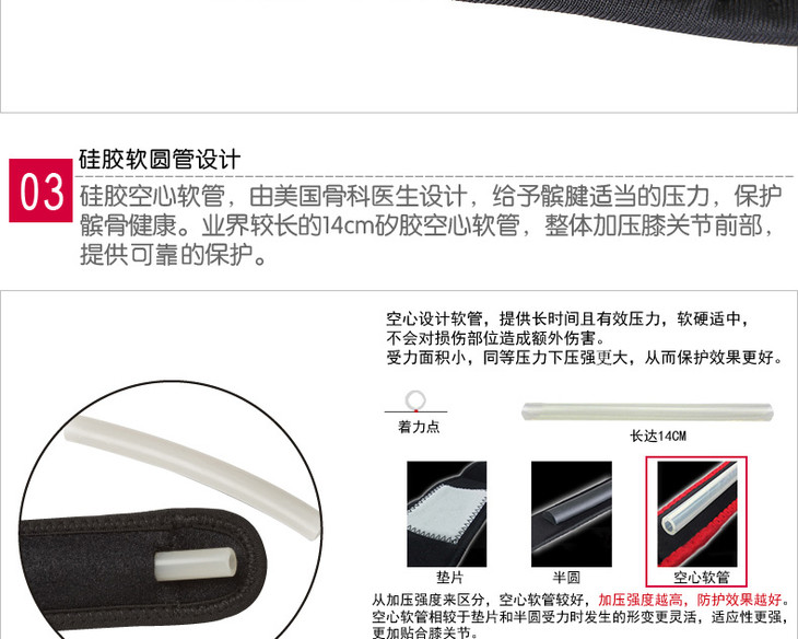 顾客医师设计圆形橡胶软管,给予膑腱适当的压力,有助于维持髌骨正常的滑动。