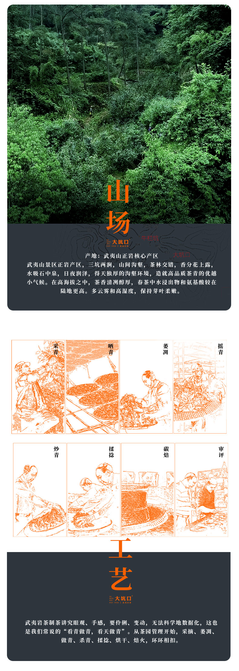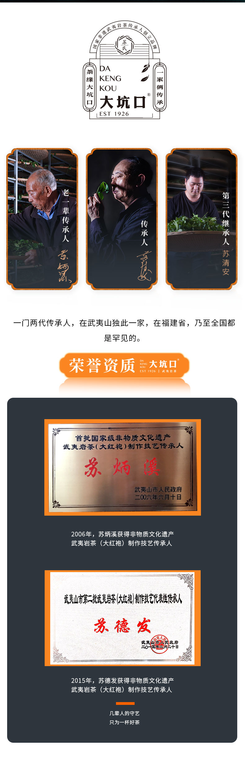 大坑口岩茶有限公司,位于武夷山市-天心村,茶山分布于正岩产区的“三坑、两涧”,由首批非物质文化遗产武夷岩茶制作技艺传承人:苏炳溪和第二批传承人:苏德发先生的精心手工制作,造就了大坑口岩茶的独特品质