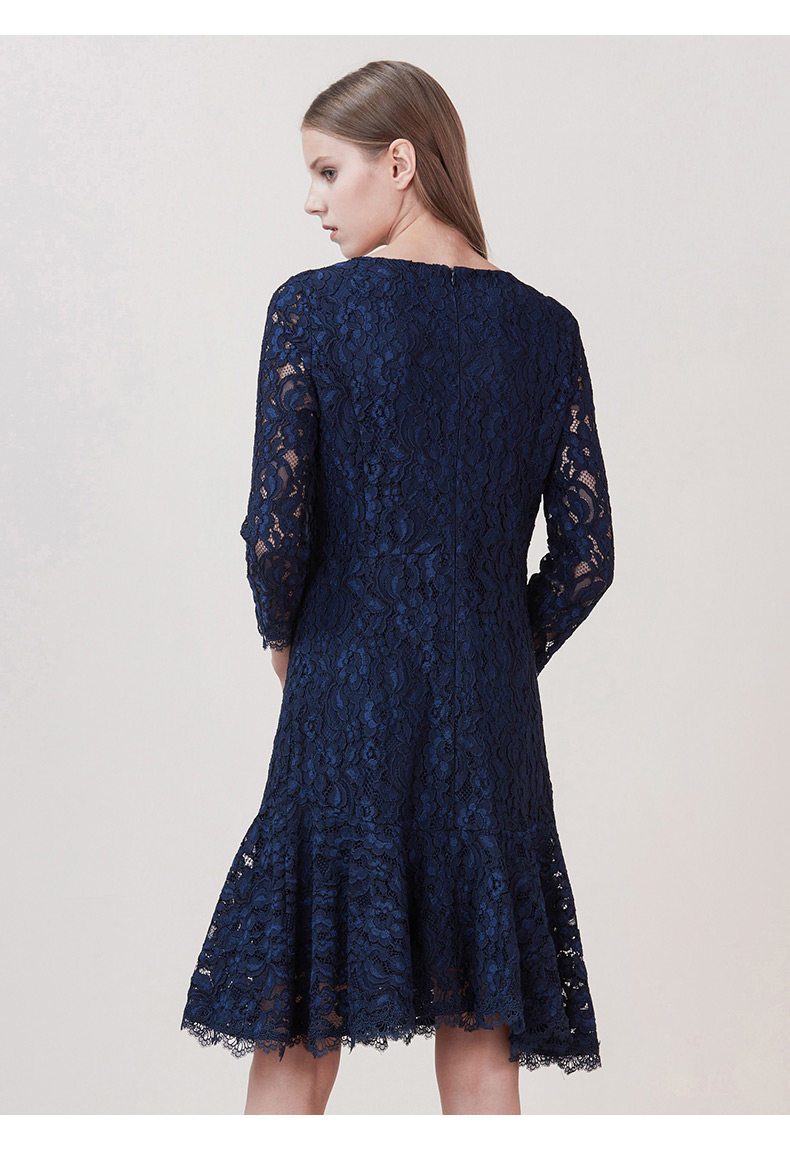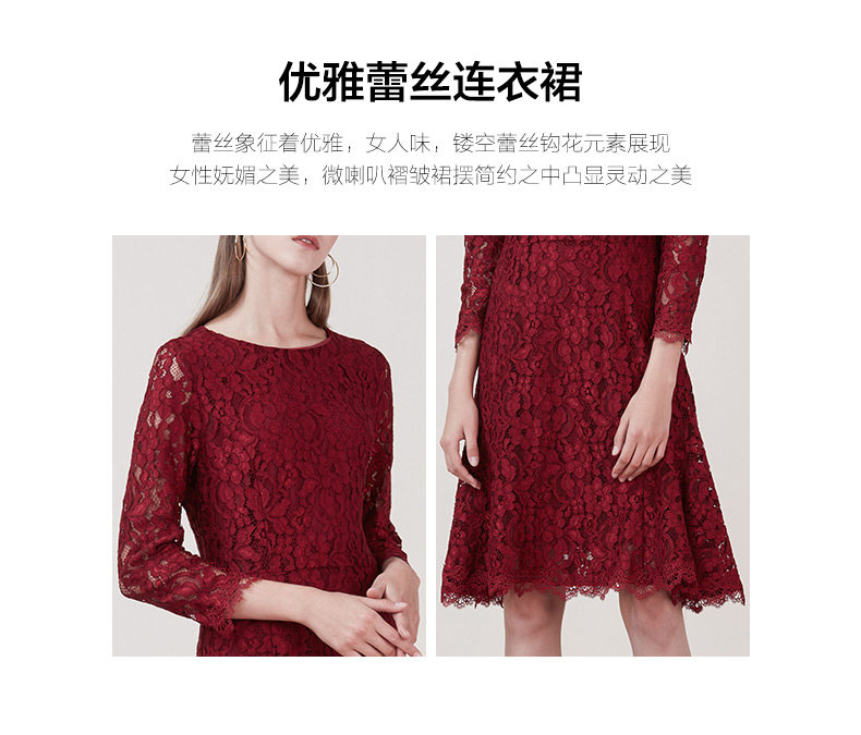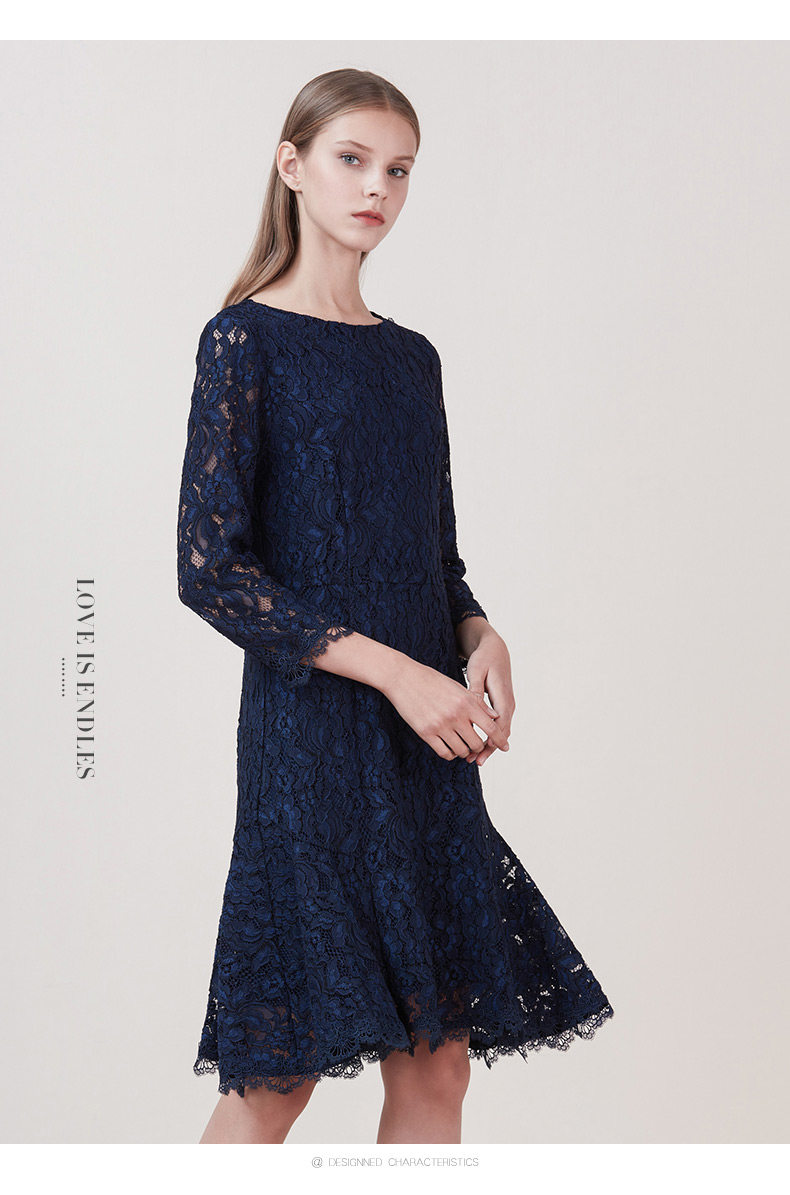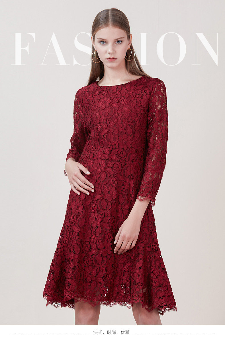 EITIE爱特爱品牌女装新款时尚优雅蕾丝连衣裙圆领低腰中裙5807534