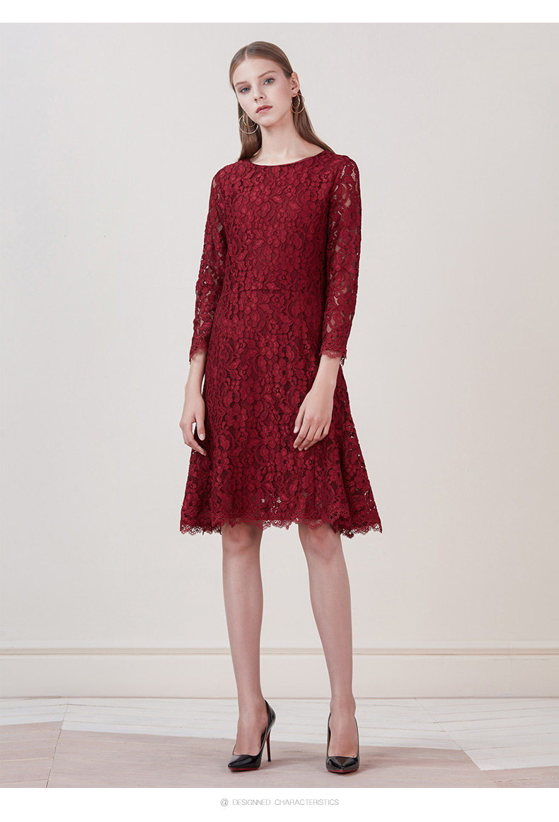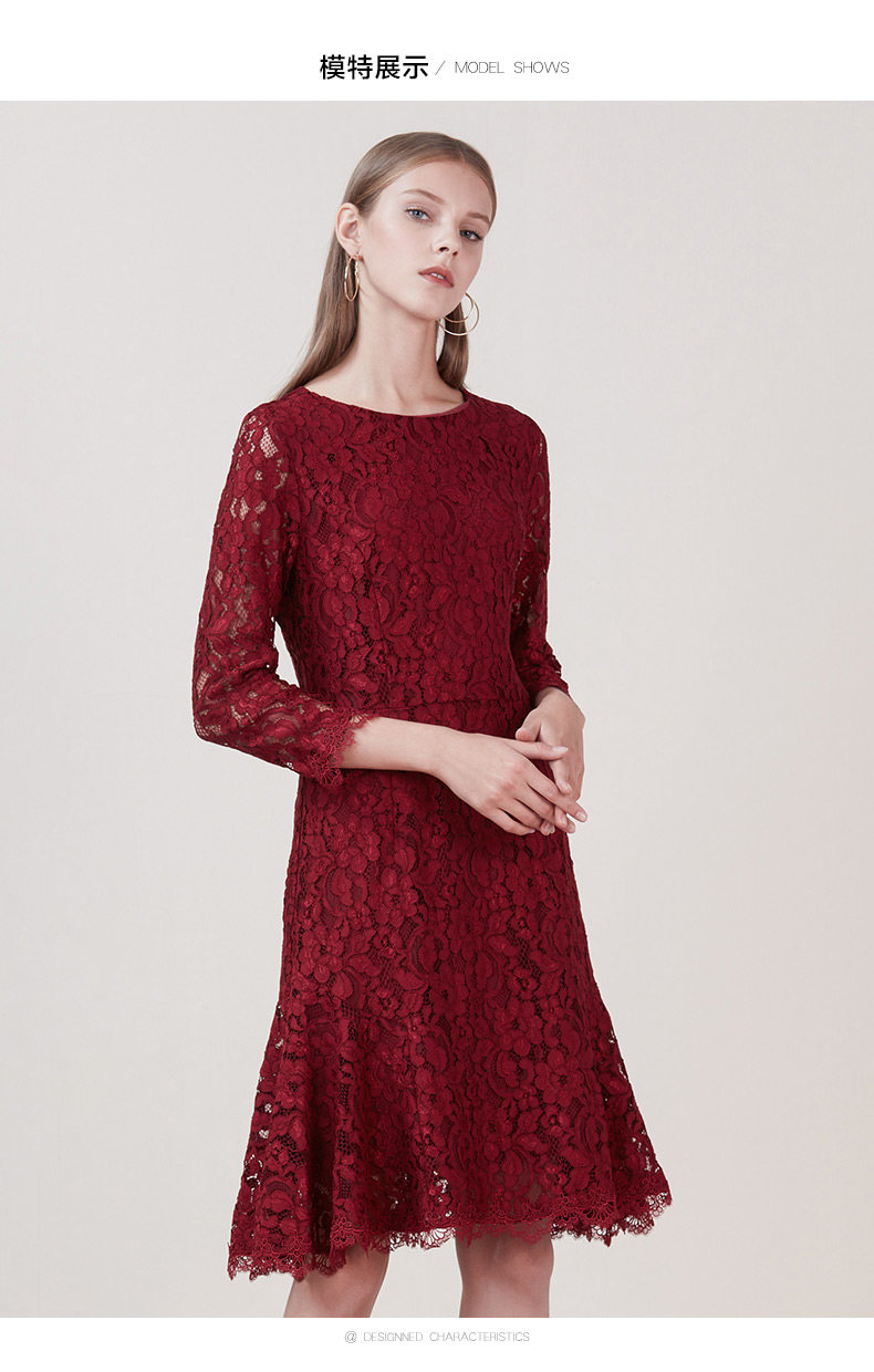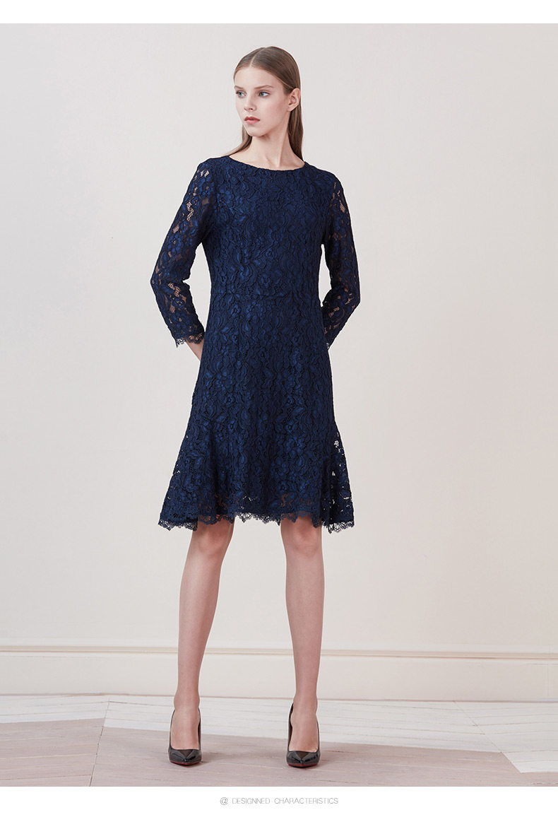 EITIE爱特爱品牌女装新款时尚优雅蕾丝连衣裙圆领低腰中裙5807534