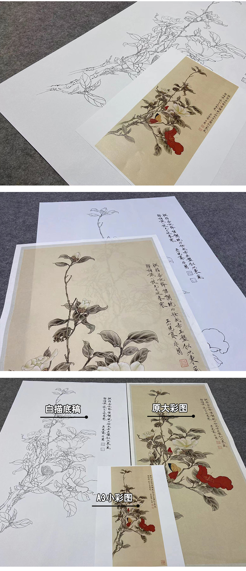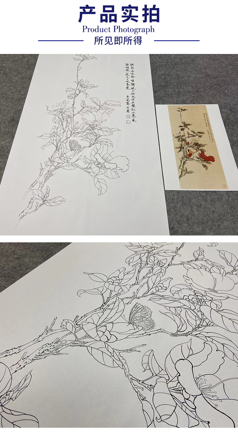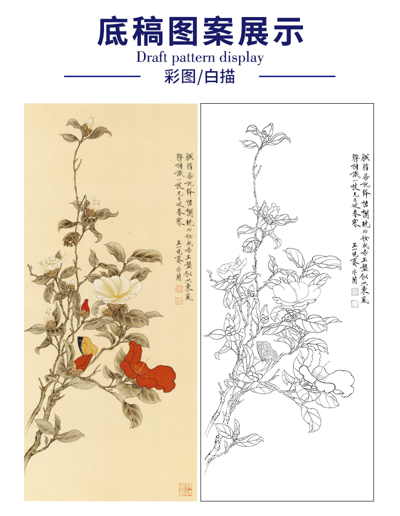 【大彩图】于非闇工笔画白描底稿《红白山茶》山茶花临摹勾线高清打印稿YF03