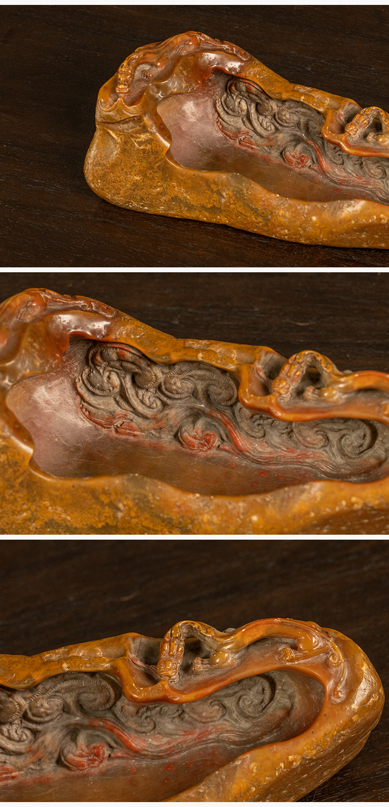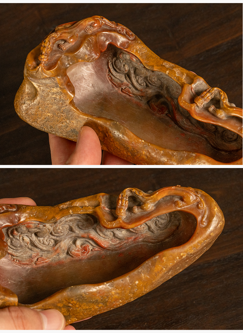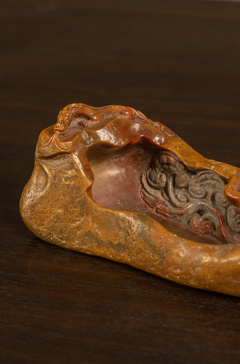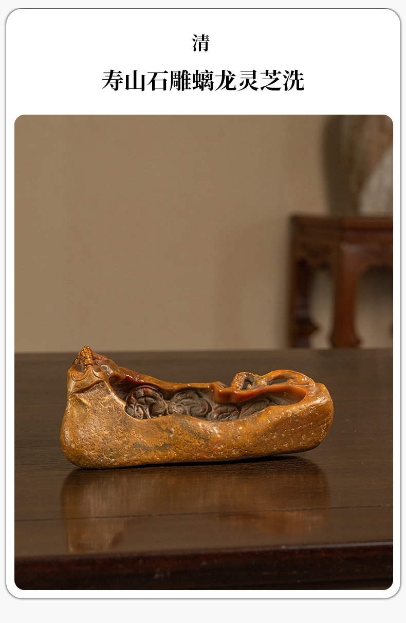 清 寿山石雕螭龙灵芝洗