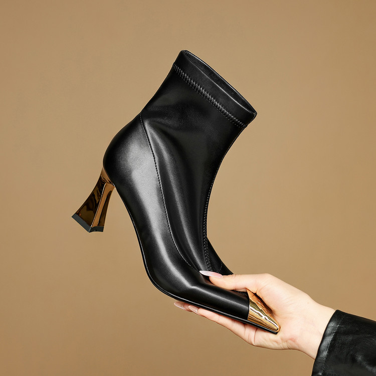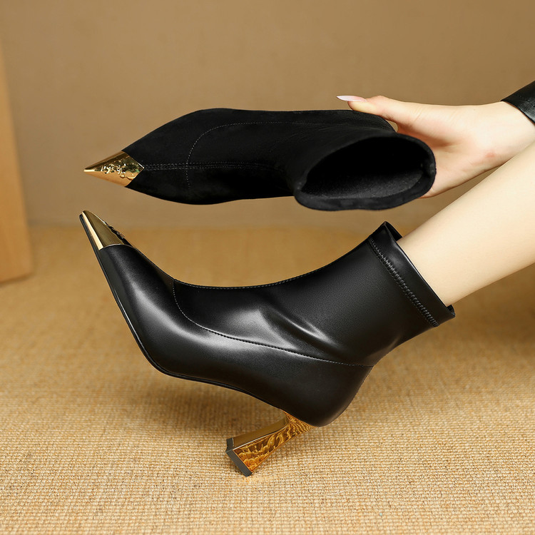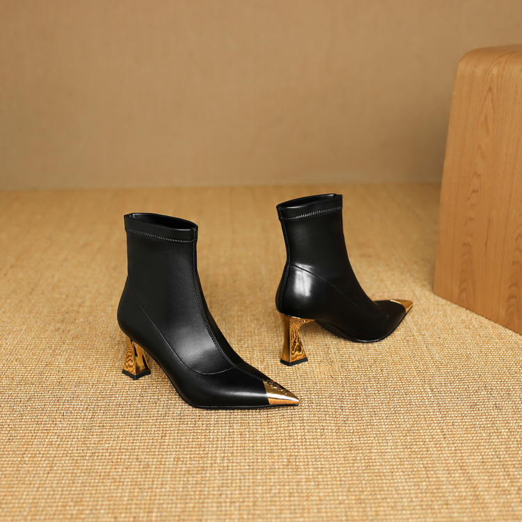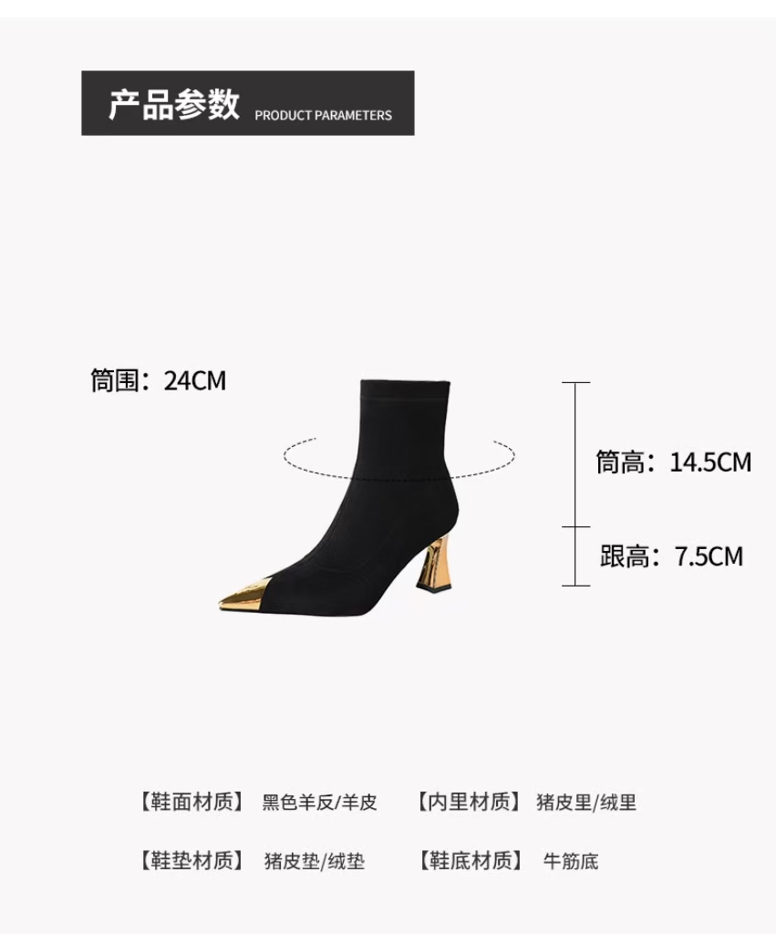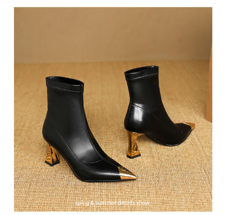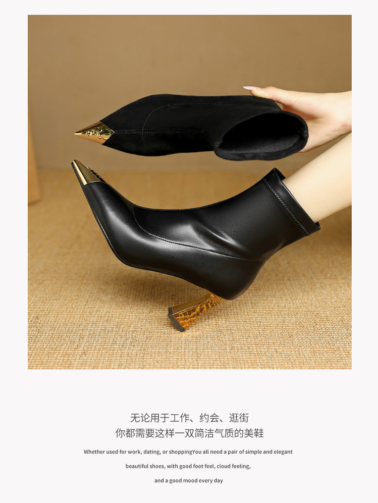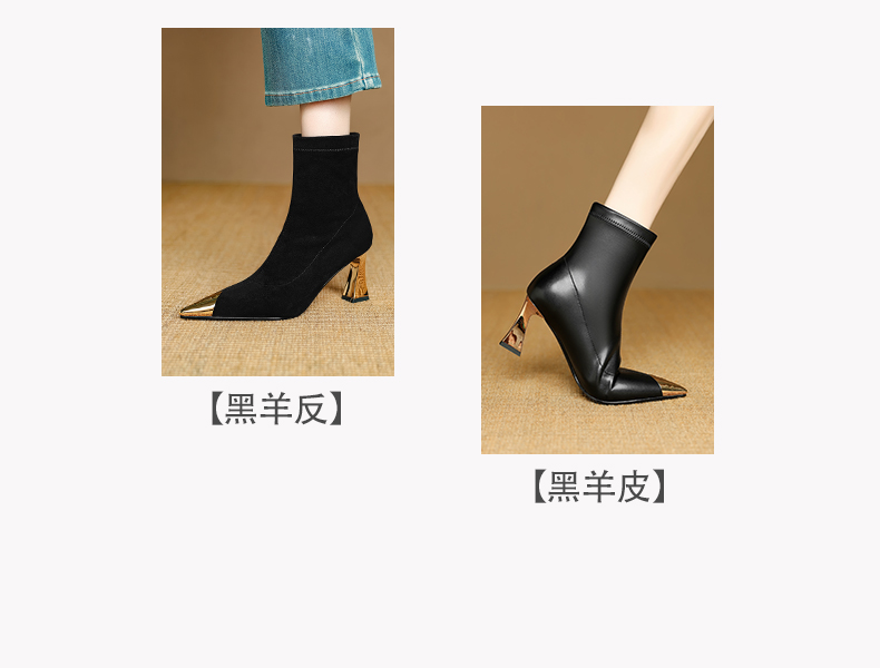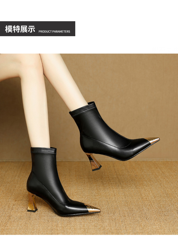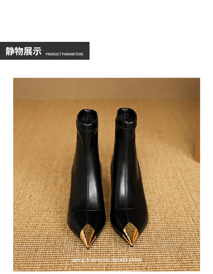 【预售5天】黑色羊皮金属尖头高跟短靴女新款秋冬瘦瘦靴气质百搭通勤靴子DB&M6576