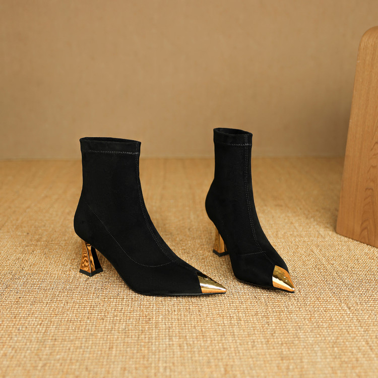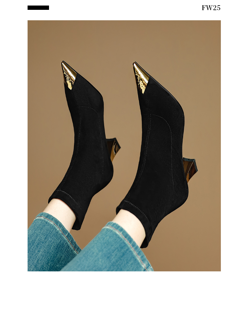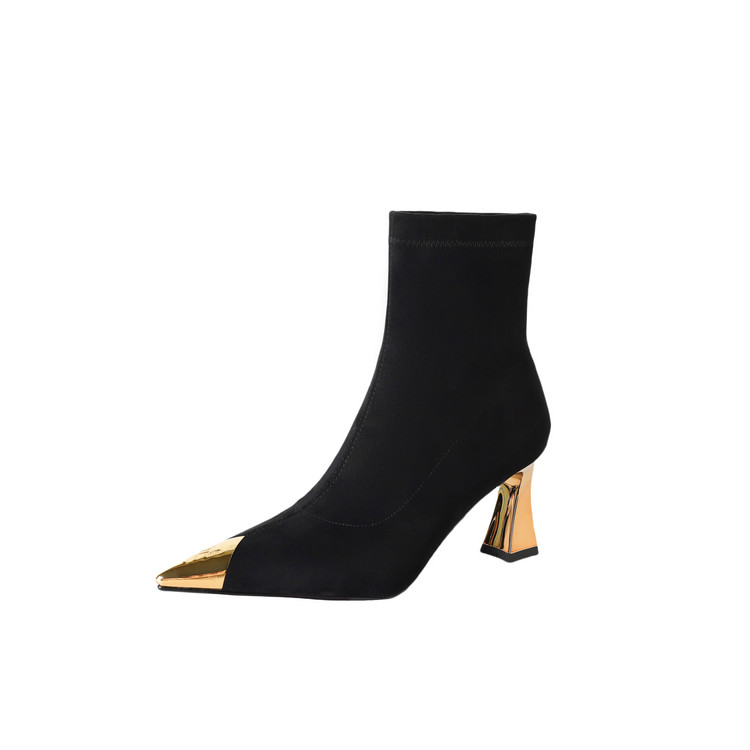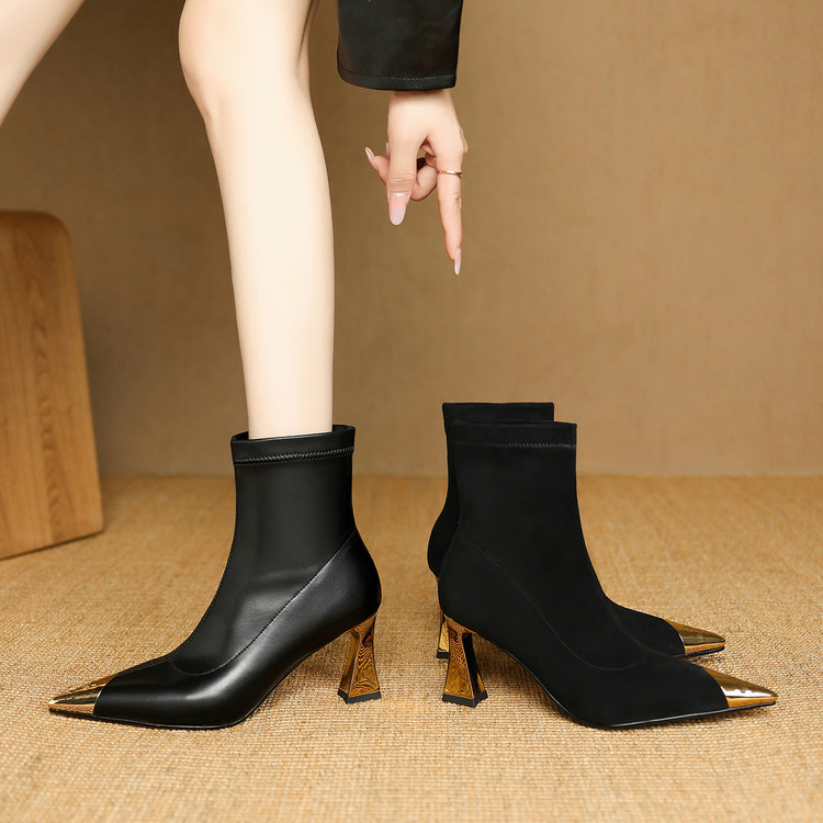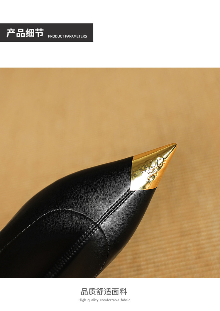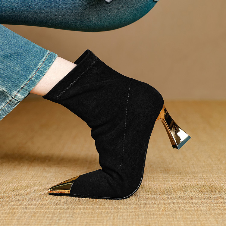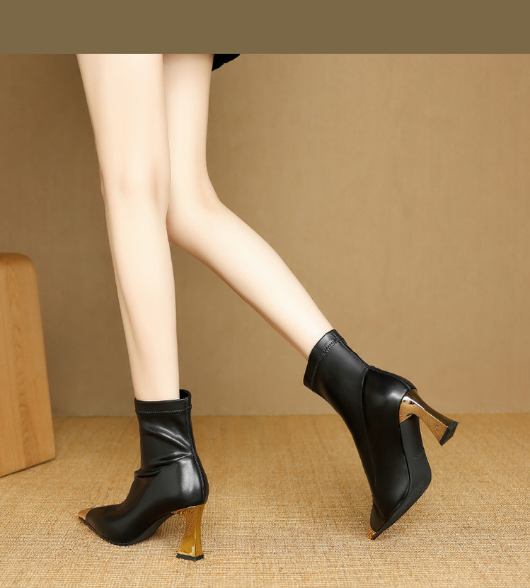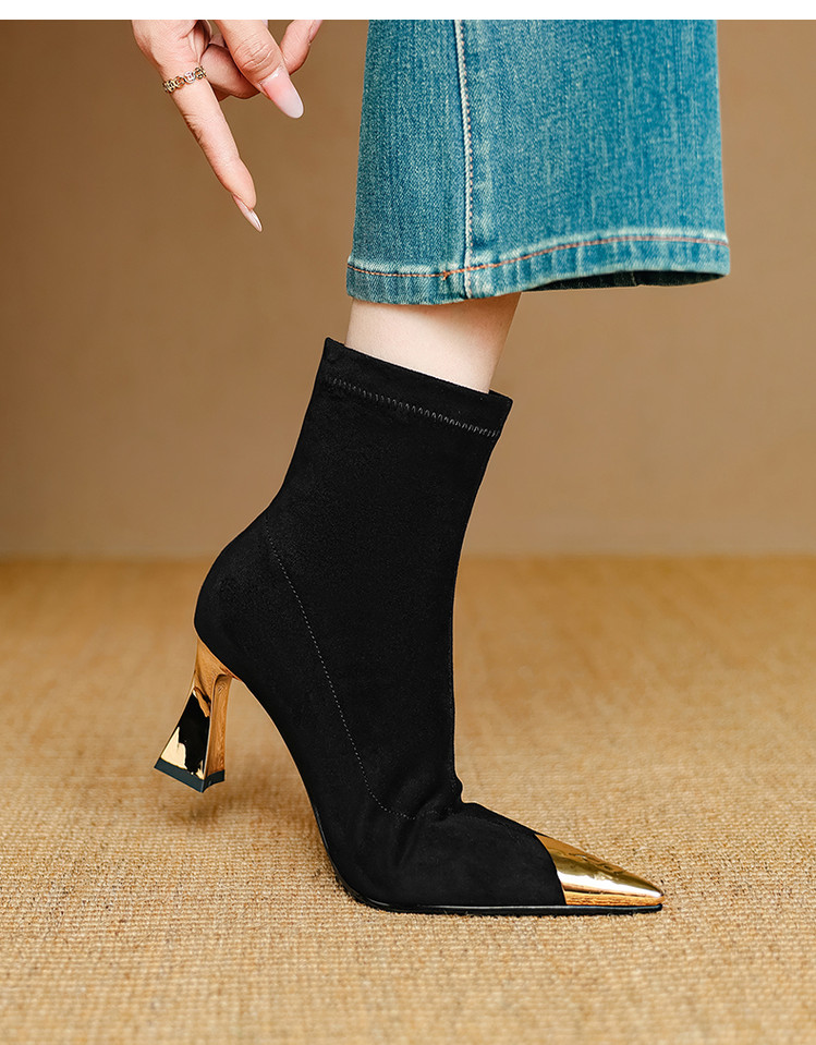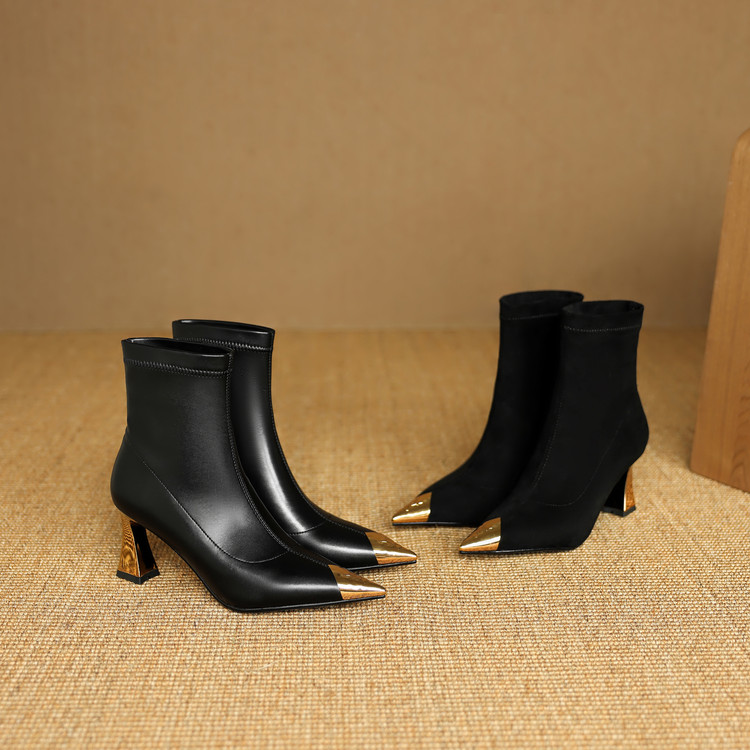 【预售5天】黑色羊皮金属尖头高跟短靴女新款秋冬瘦瘦靴气质百搭通勤靴子DB&M6576