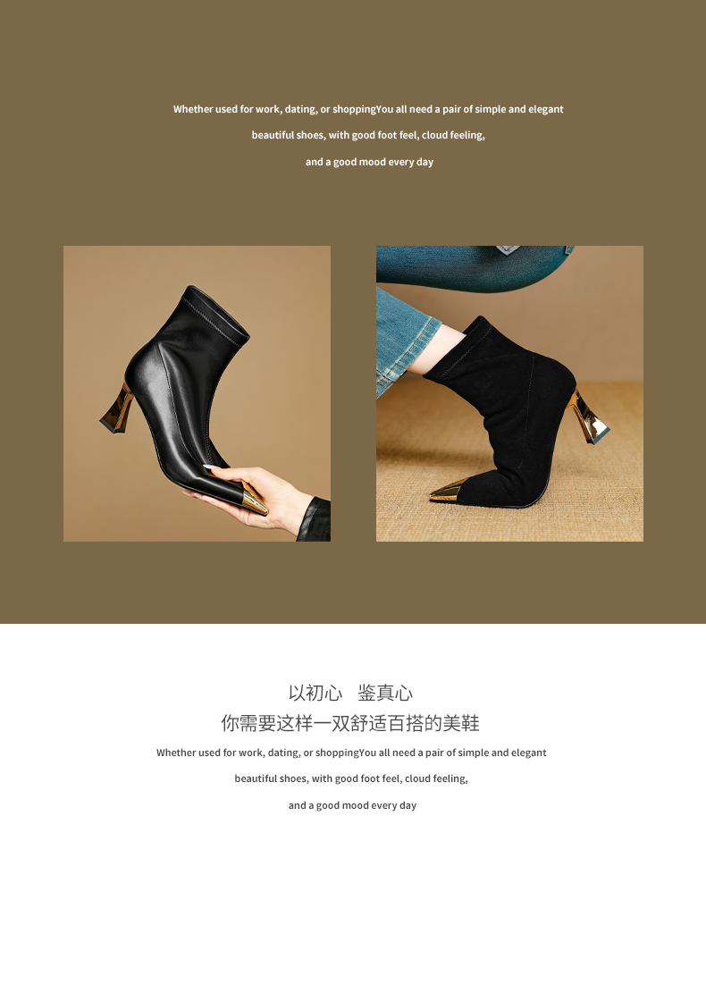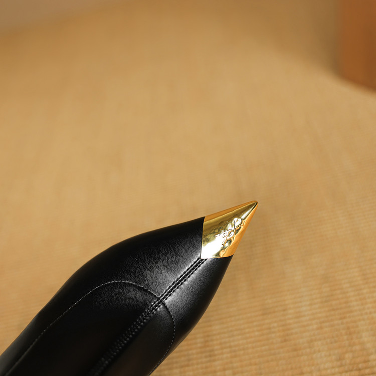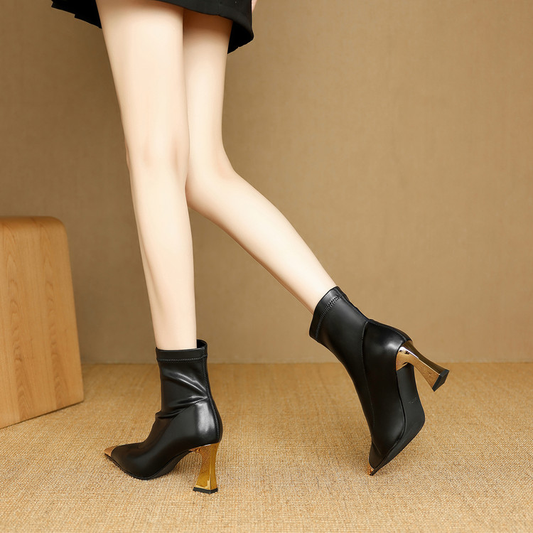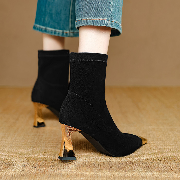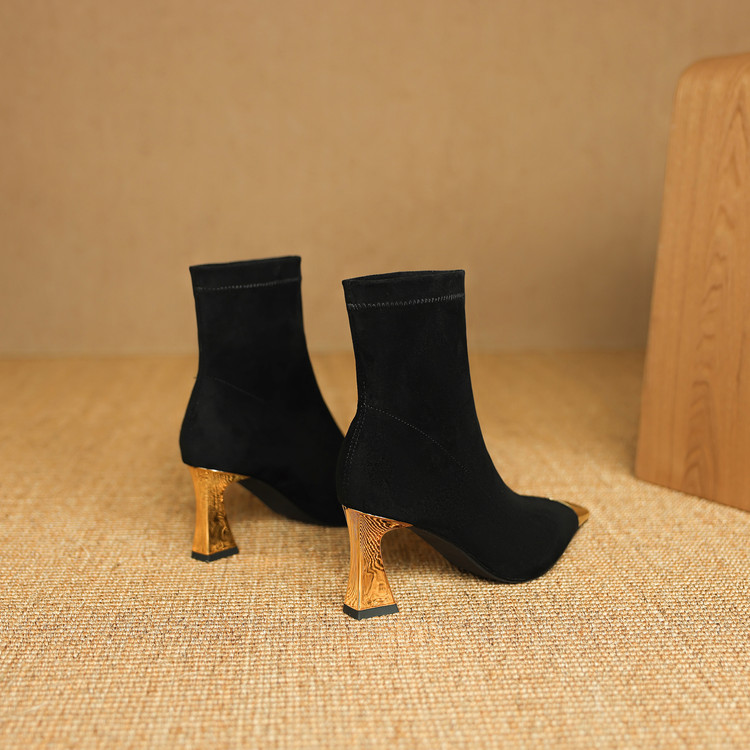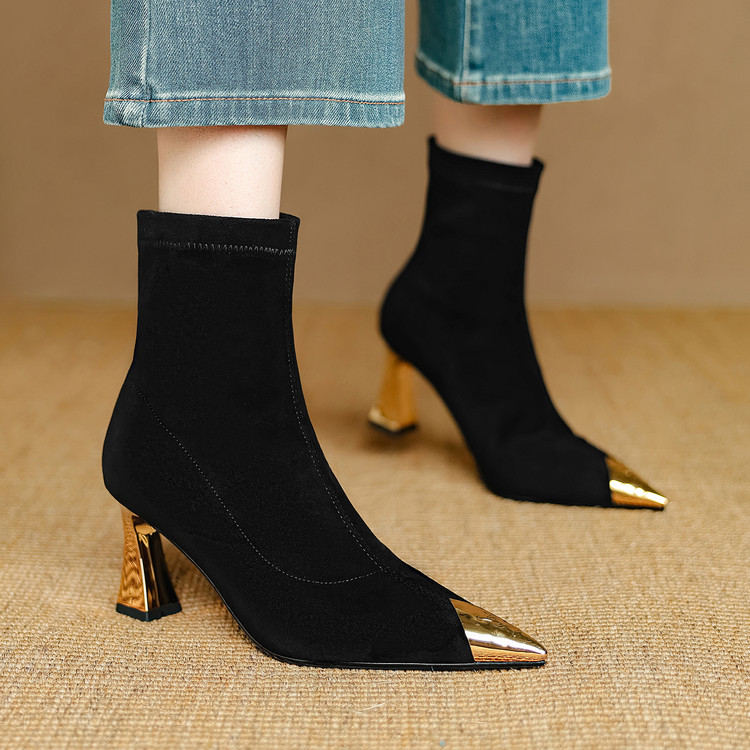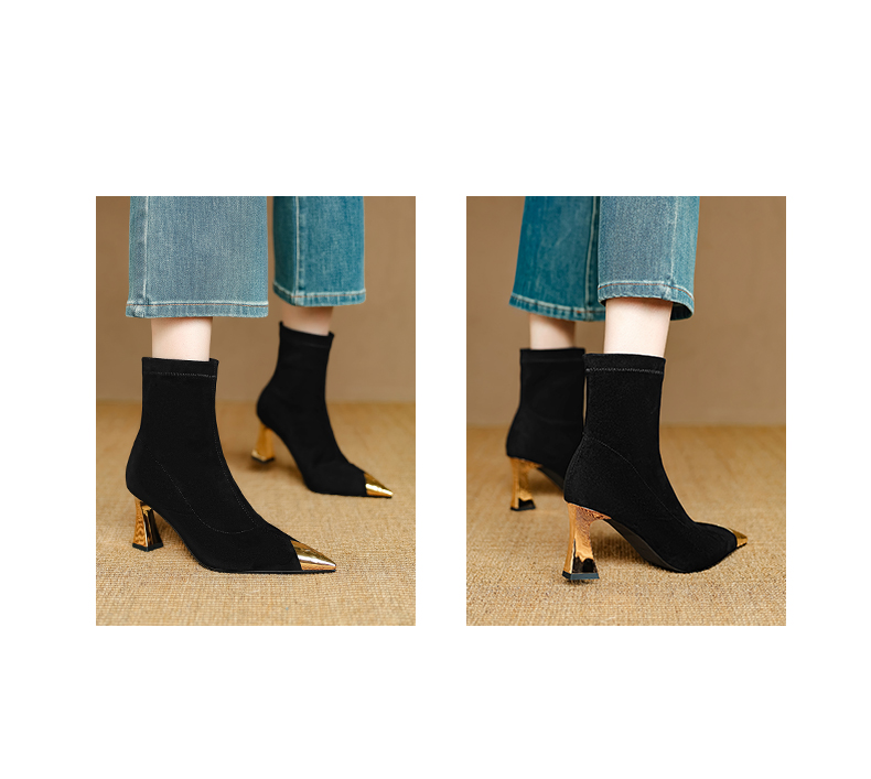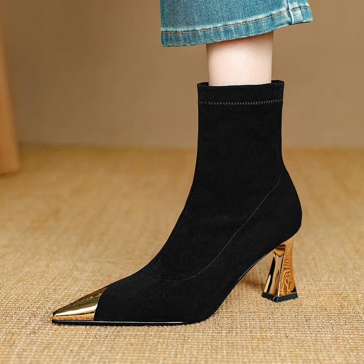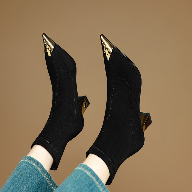 【预售5天】黑色羊皮金属尖头高跟短靴女新款秋冬瘦瘦靴气质百搭通勤靴子DB&M6576
