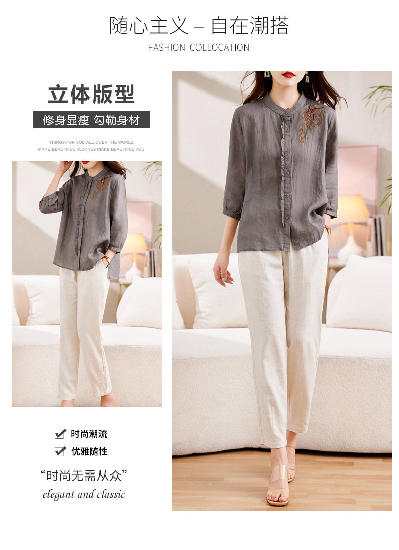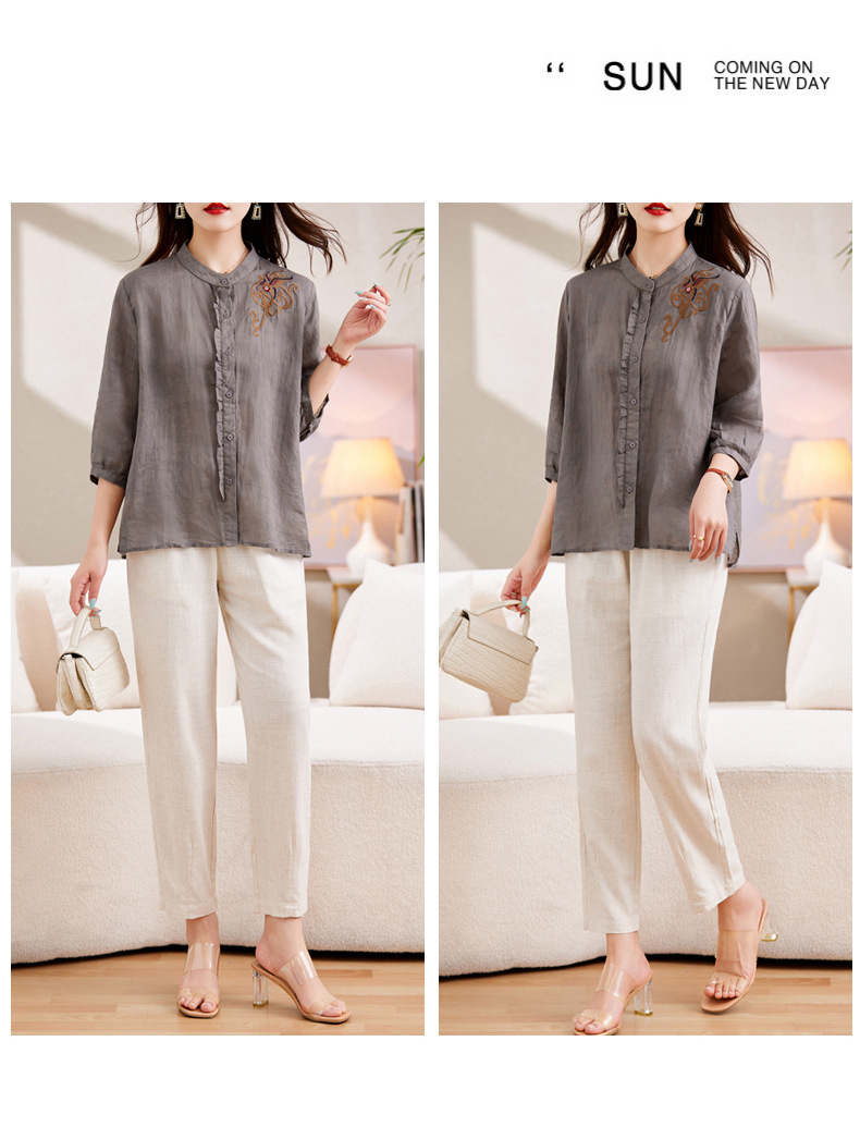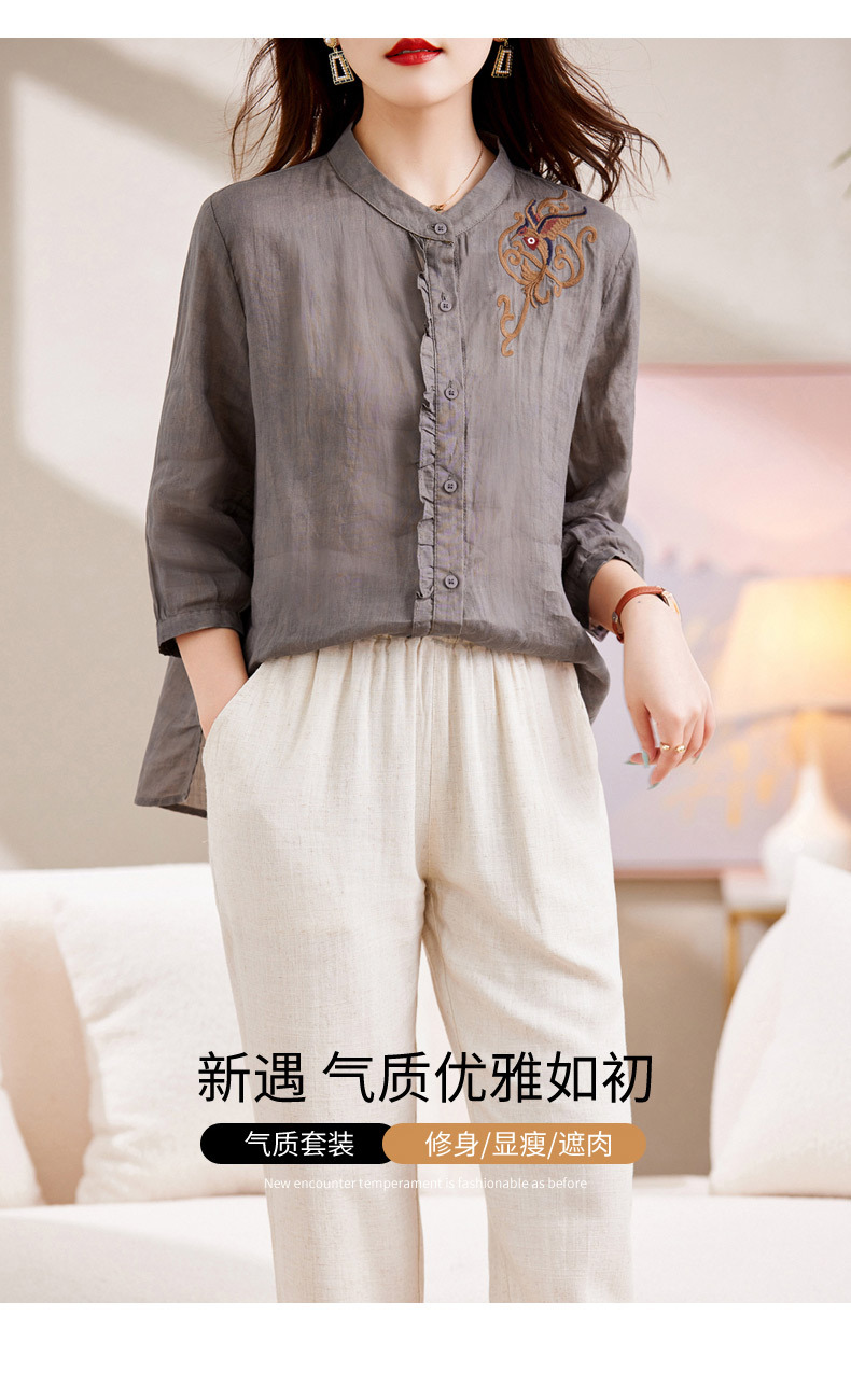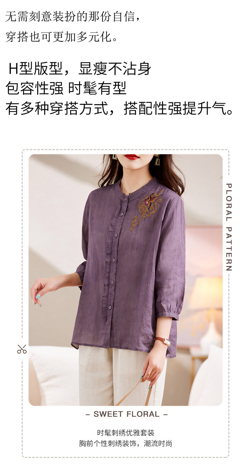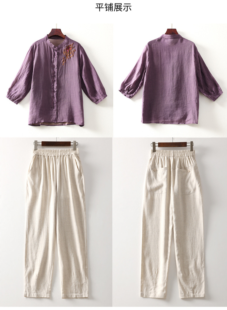 百媚生 绣花苎麻衬衫两件套透气棉麻套装