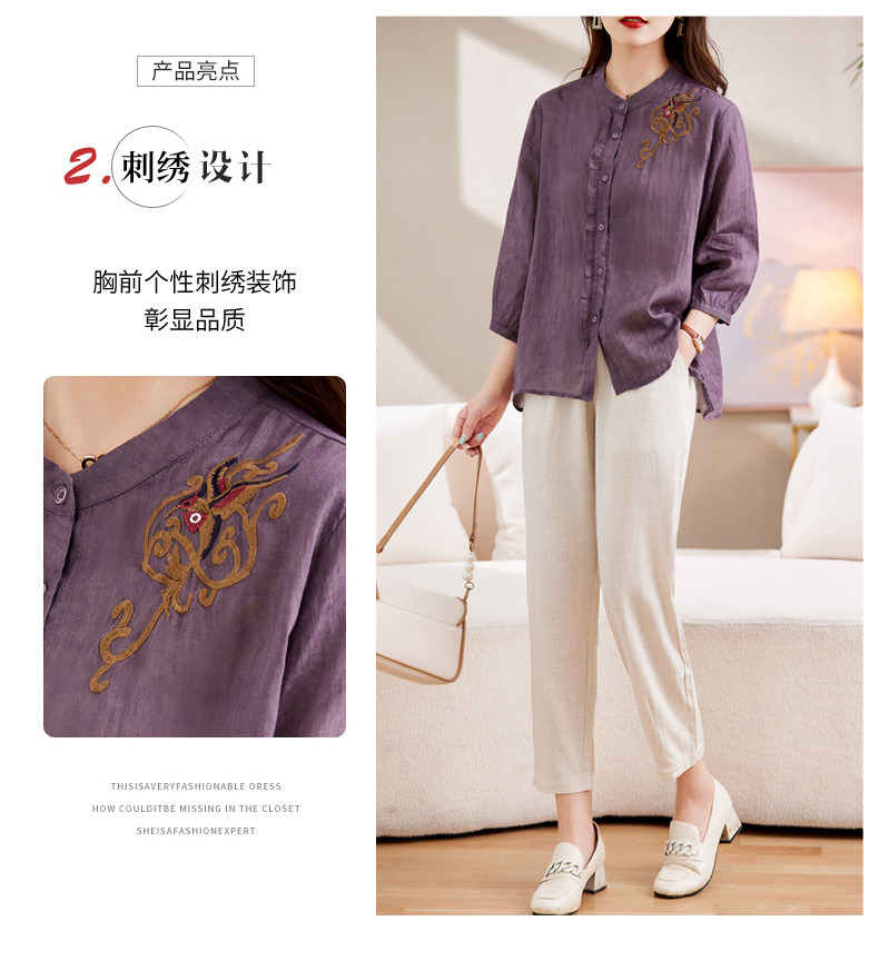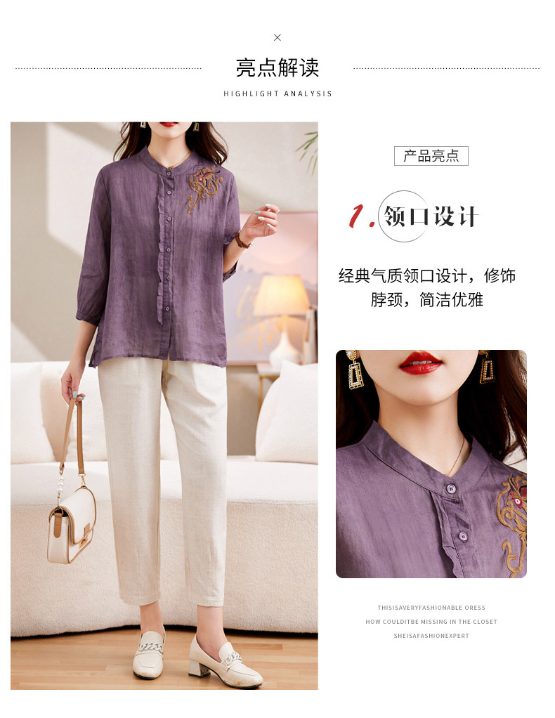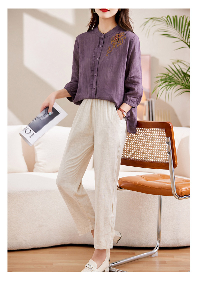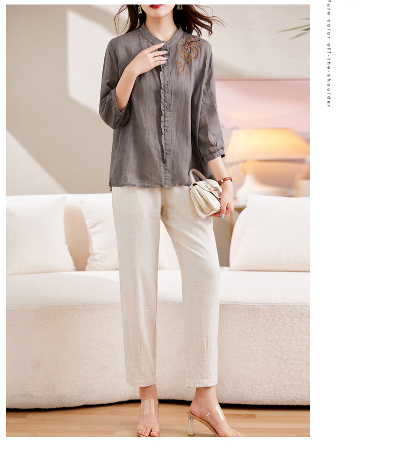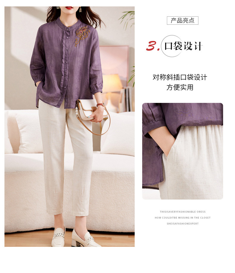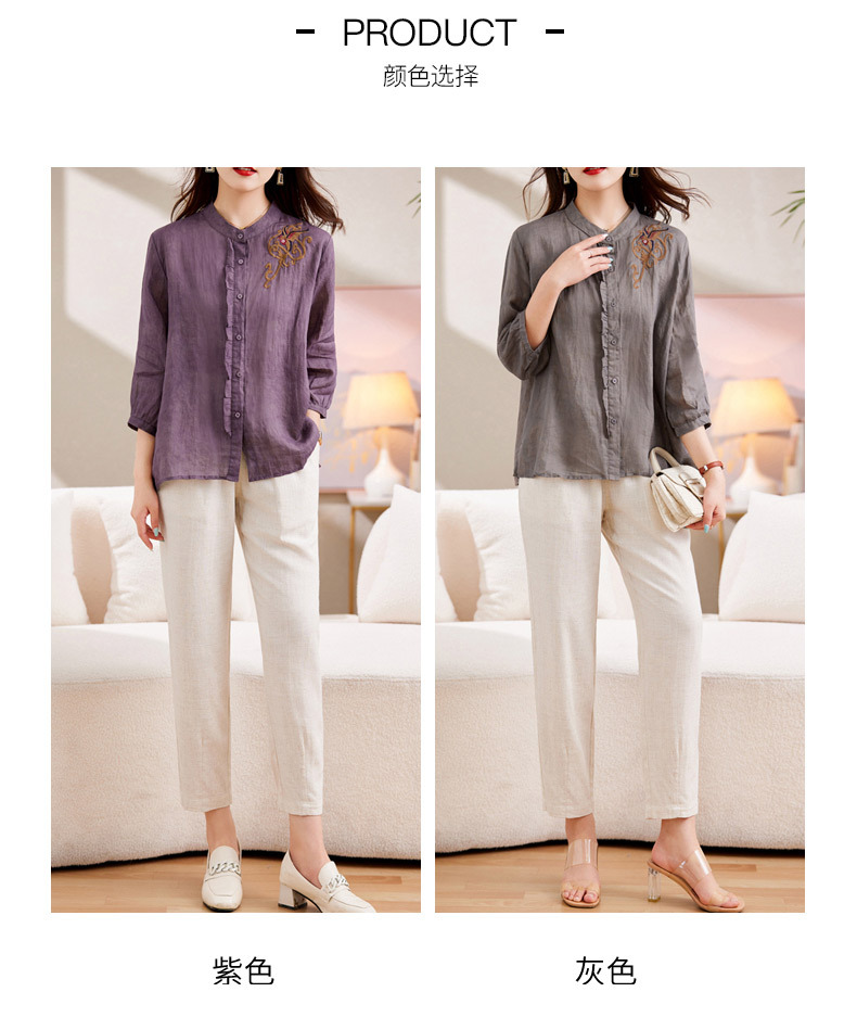 百媚生 绣花苎麻衬衫两件套透气棉麻套装