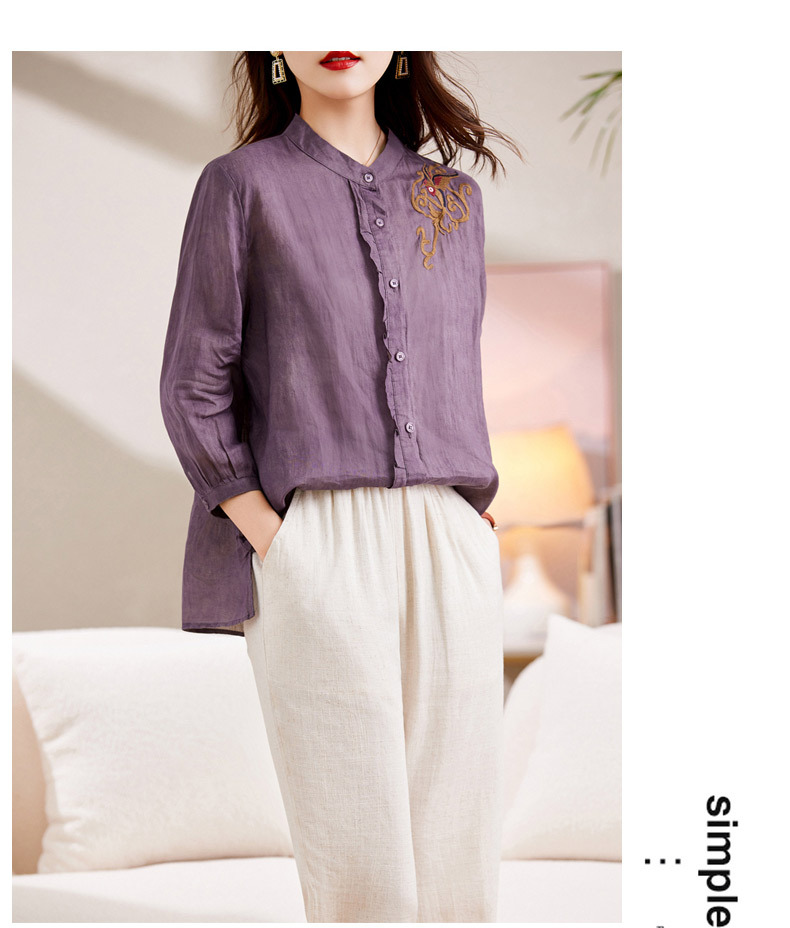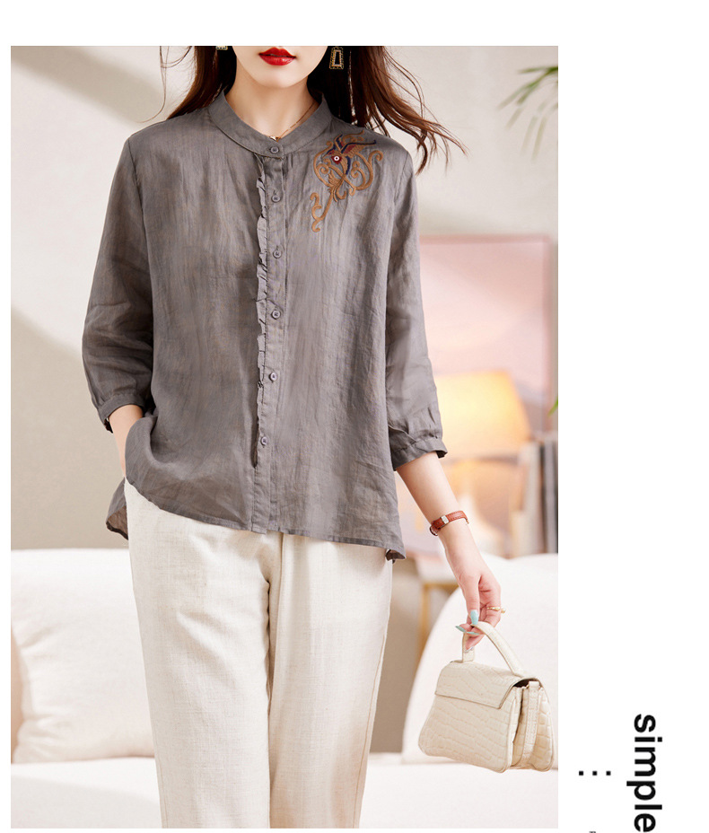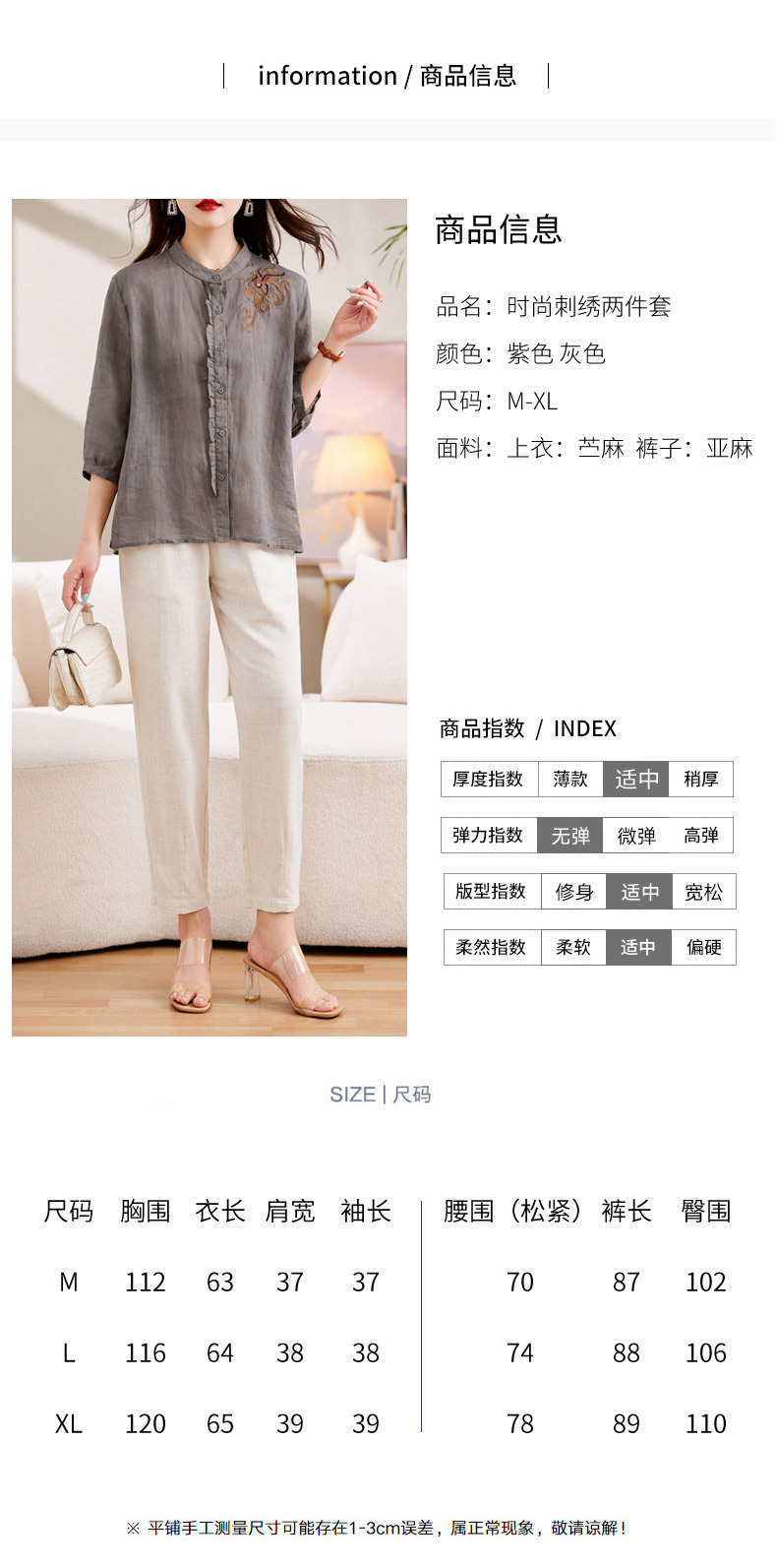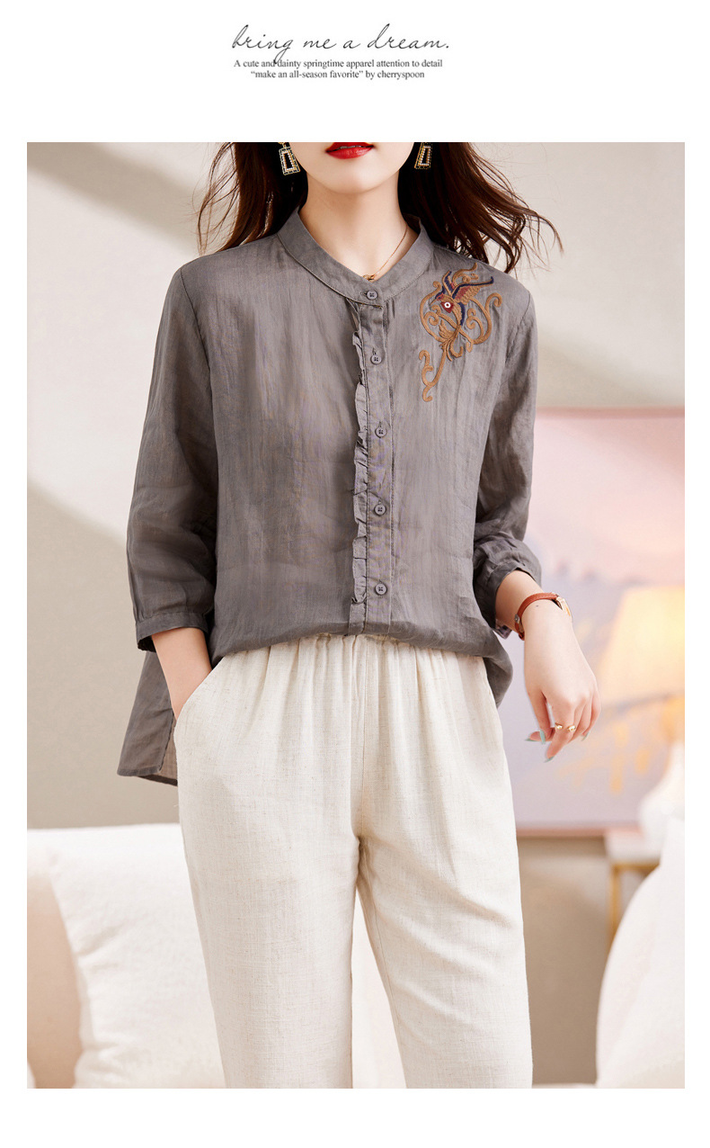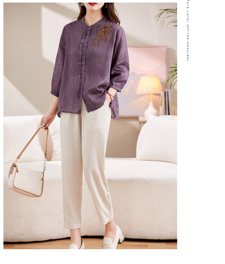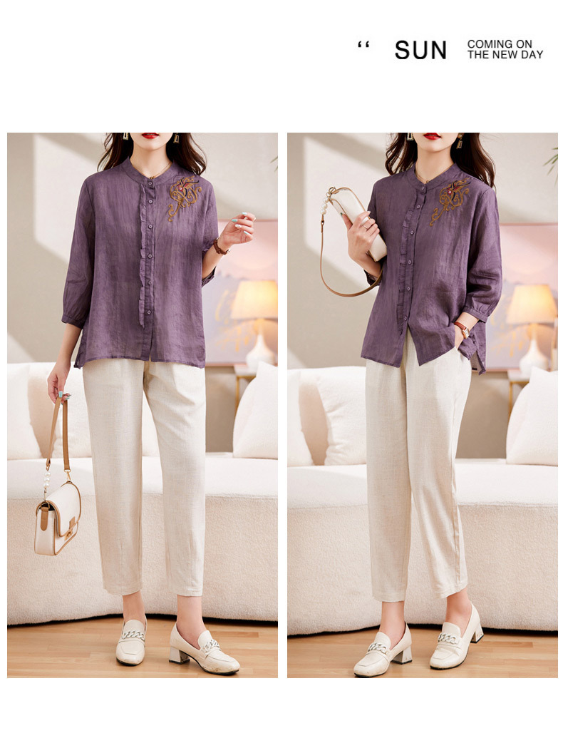 百媚生 绣花苎麻衬衫两件套透气棉麻套装