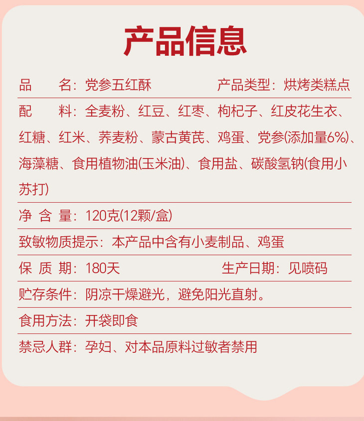 【以红养红!党参五红酥】甄选党参、蒙古黄芪、红豆、红枣、红皮花生衣、 红糖、红米、枸杞子等,全麦酥代餐双补