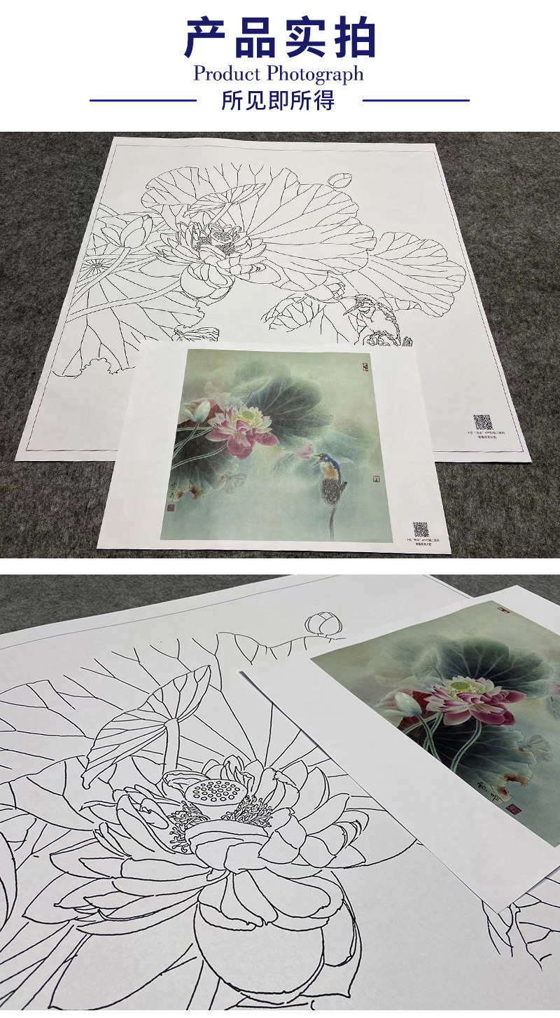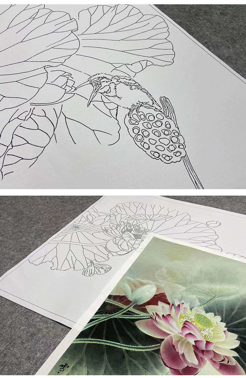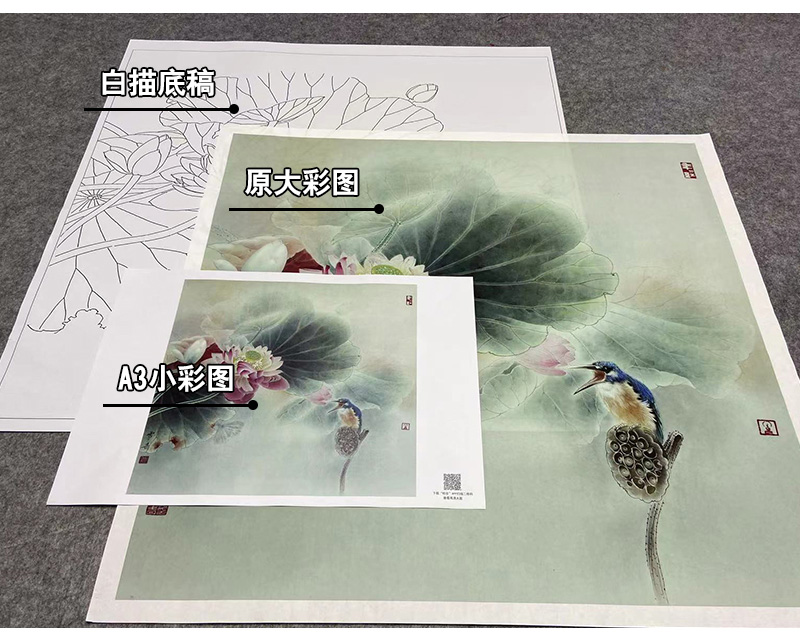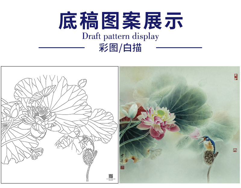 【大彩图】龚雪青工笔画白描底稿斗方小品《荷花翠鸟》临摹勾线花鸟线稿XQ23