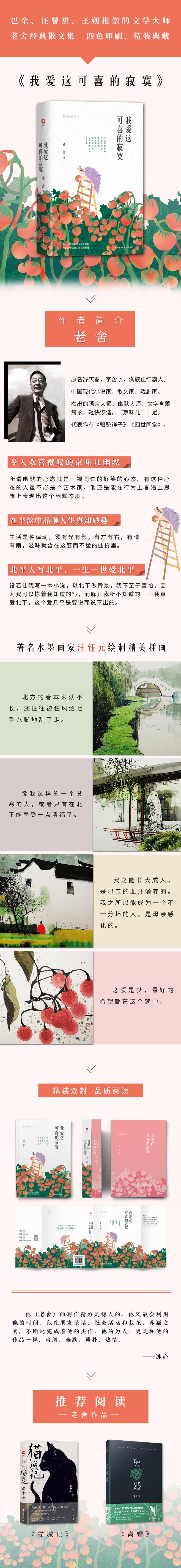 本书是知名作家老舍先生的散文集,老舍作为现当代文学目前的幽默大师、语言大师,其散文作品具有独特的语言魅力。本书收录了六十余篇代表性作品,分为“无边光景四时新”“随心随喜去生活”“寂寞是一种清福”“骨子里的幽默”“故人从未走远”“大发议论”六大章节,完整收录《猫》、《济南的冬天》等中小学语文篇目,《朗读者》节目上朗诵的名篇《宗月大师》等。本书或描写人文景观及自然风光,或捕捉日常生活的细节及家庭生活情趣,或抒发对师友的悼念及内心情感,或介绍自己的创作经验及作品,贯穿着老舍一贯的幽默风格,让人从轻快诙谐之中品味生活。