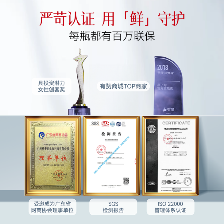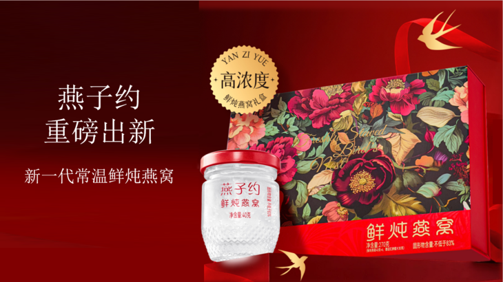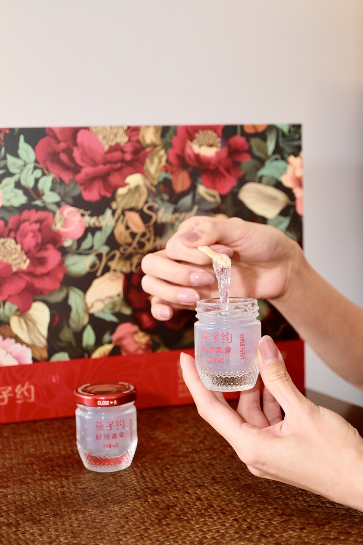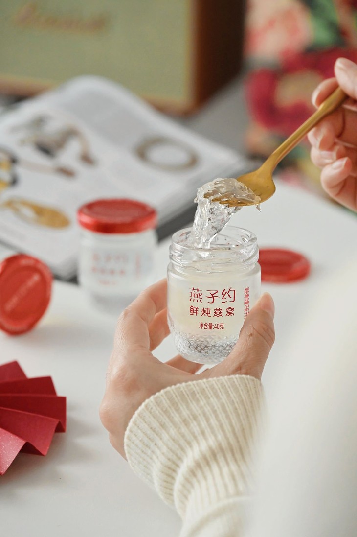 作为鲜炖燕窝的“爱马仕”好品质看得见,喝的到! 单瓶投燕量≥1.7g/瓶 固形物含量≥83%/瓶 唾液酸含量≥128mg/瓶 从此鲜炖燕窝市场分为“燕子约”和“其他品牌”